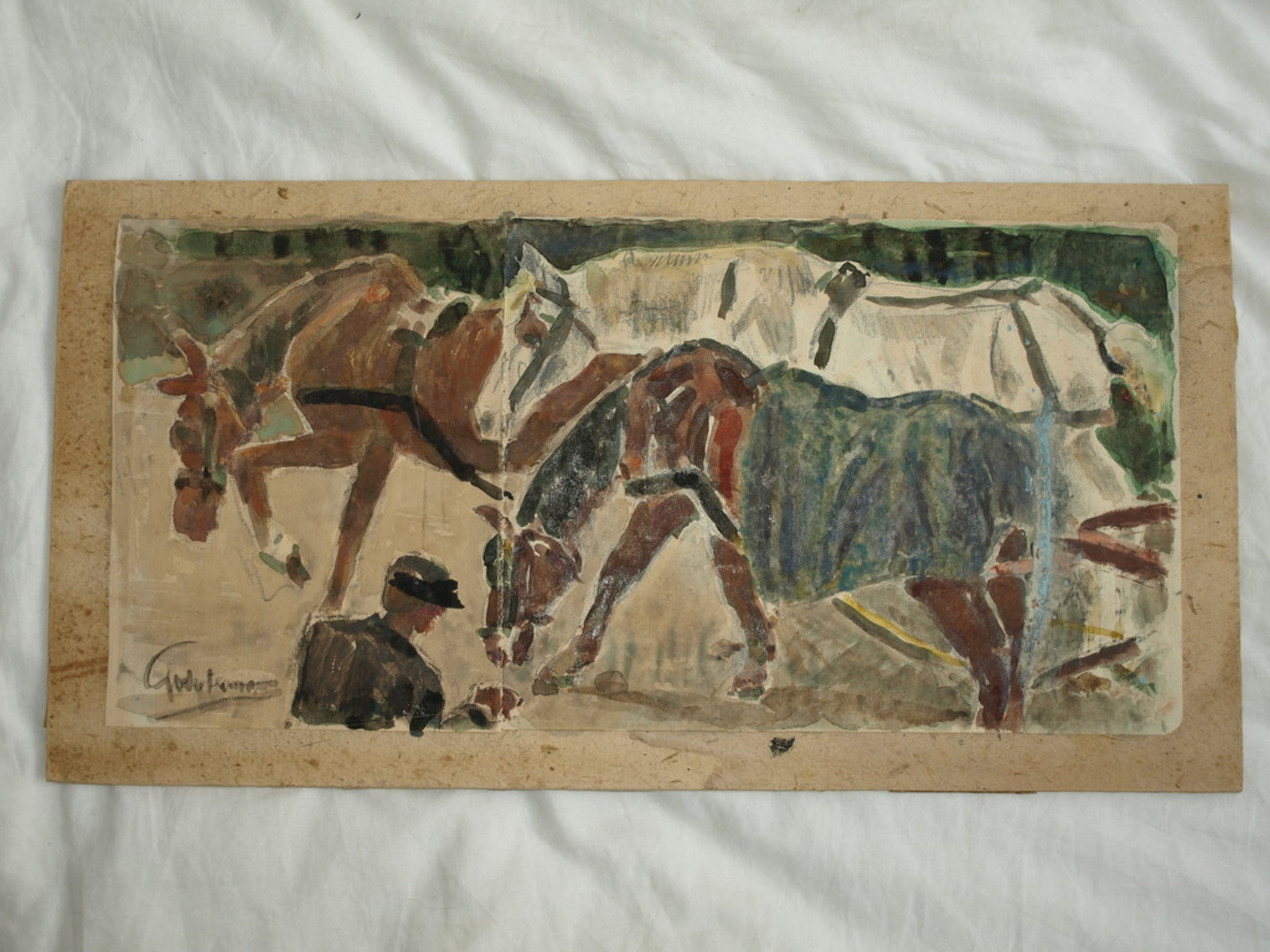 Conditie: Het karton is vlekkerig en heeft tape-resten. De aquarel “Paarden” heeft een vouw/naad in het midden.
