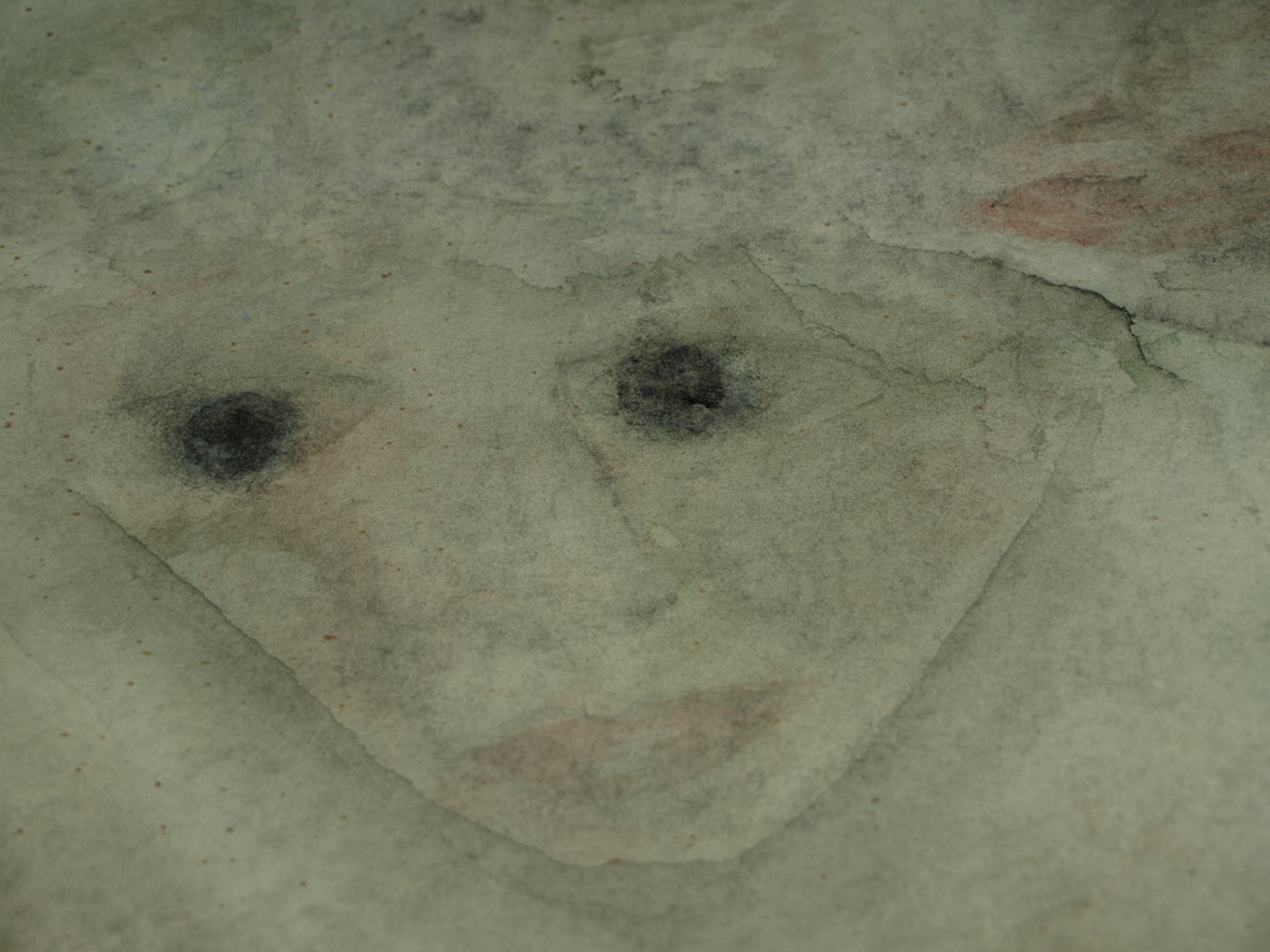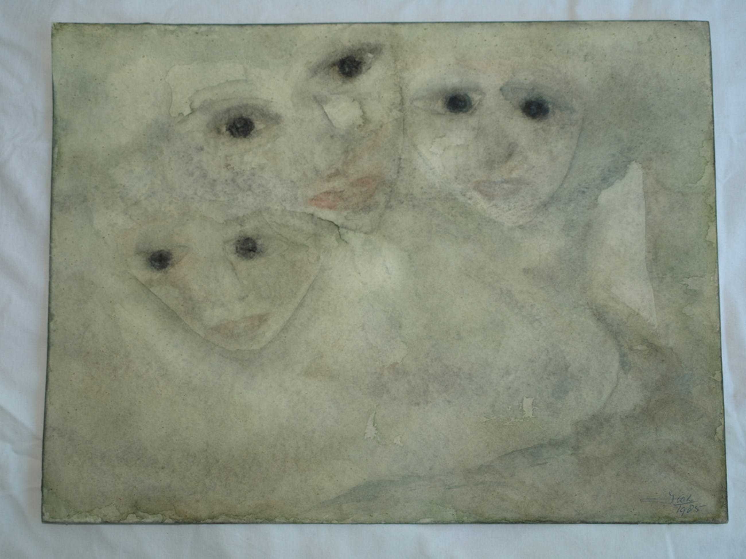 Een aparte aquarel uit 1985 met een ‘surrealistische’ voorstelling van 3 gezichten.