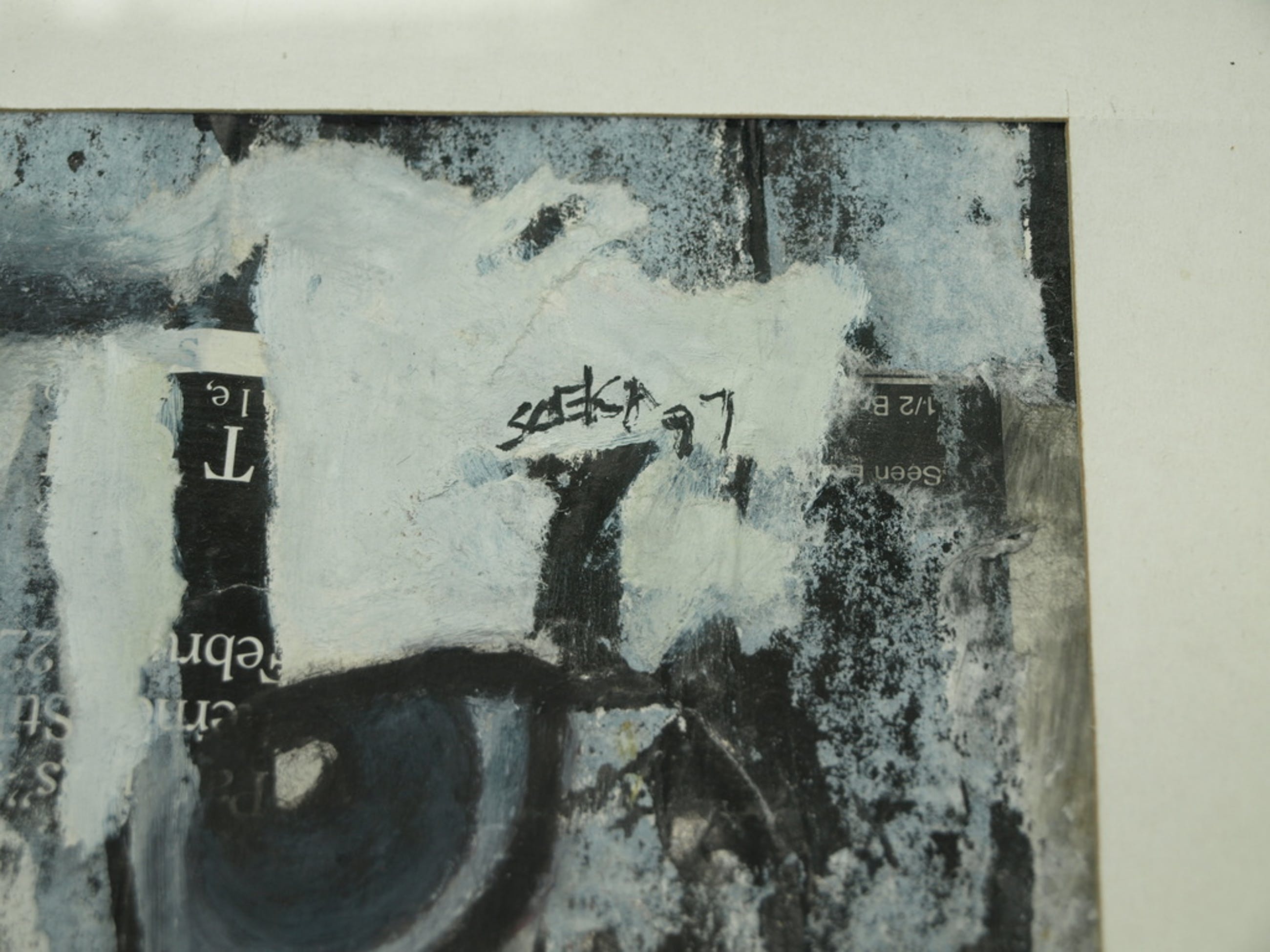 Gesigneerd en gedateerd in de rechterbovenhoek. Helaas hebben wij de signatuur niet goed kunnen lezen (‘Soeka’?) en hebben wij geen verdere informatie over de kunstenaar. Op de achterkant staat geschreven ‘Collage RAB 10’. Ook hing er een prijskaartje aan het werk met een prijs in Amerikaanse dollars, dus mogelijk is de kunstenaar van Amerikaanse origine?.