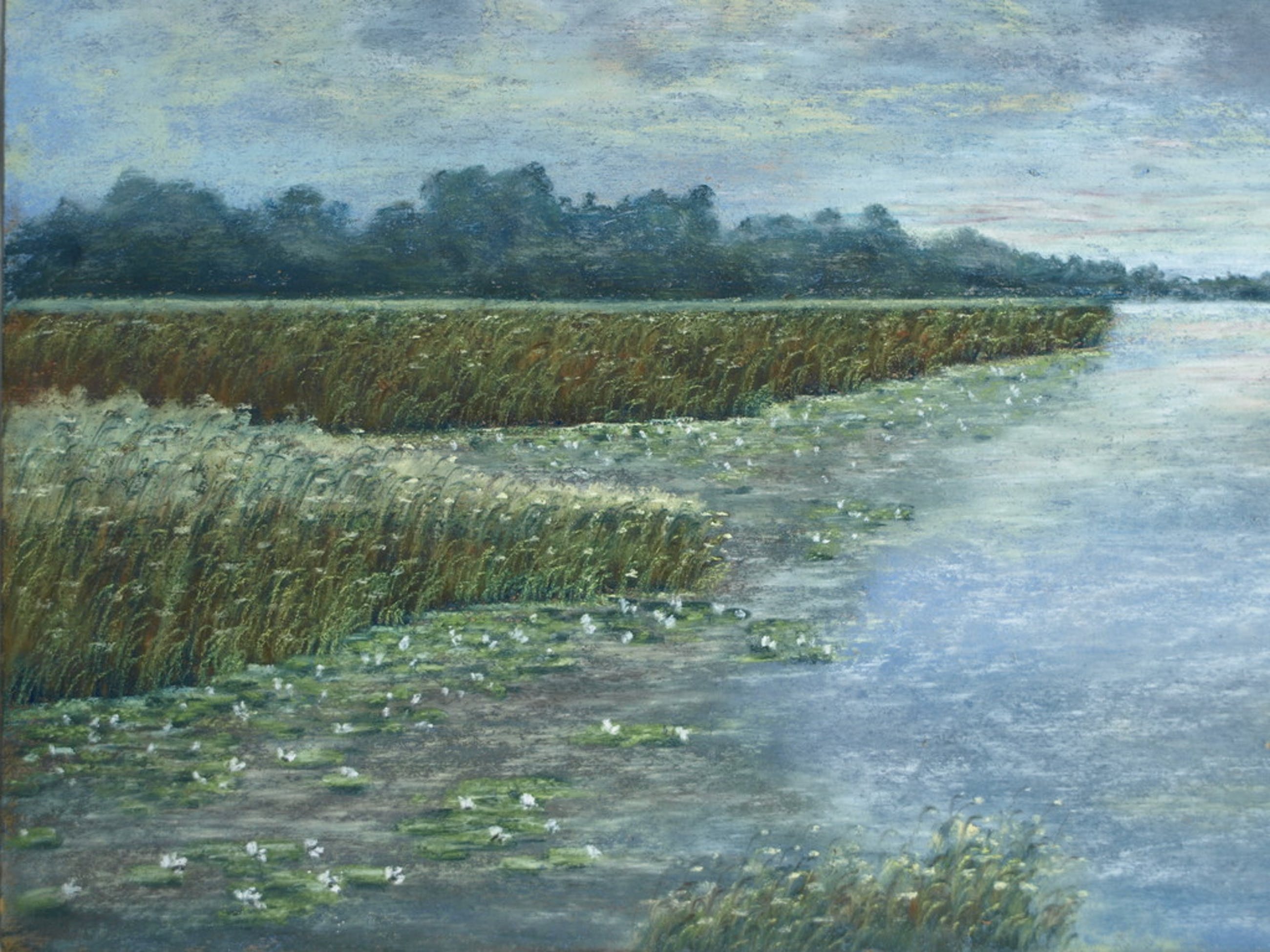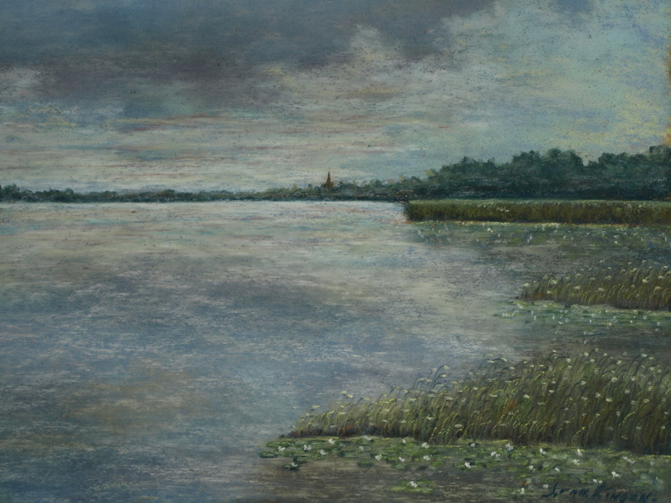 Een oude tekening met pastelkrijt met een verstild watergezicht.