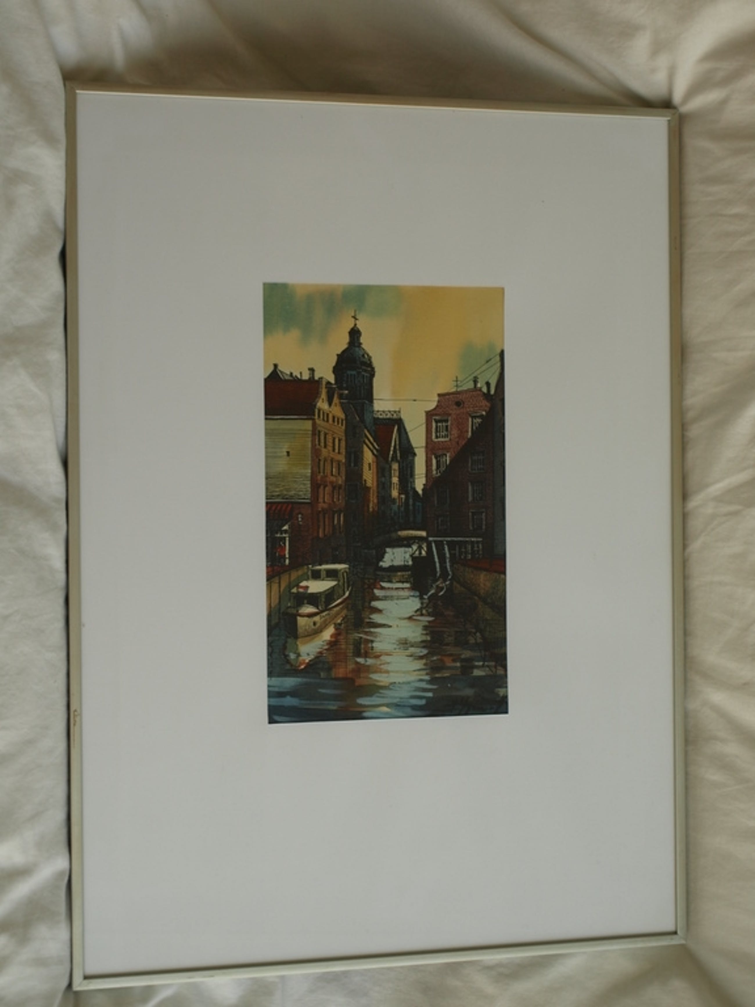 Een gouache met een voorstelling van een stadsgezicht, een gracht in Amsterdam.