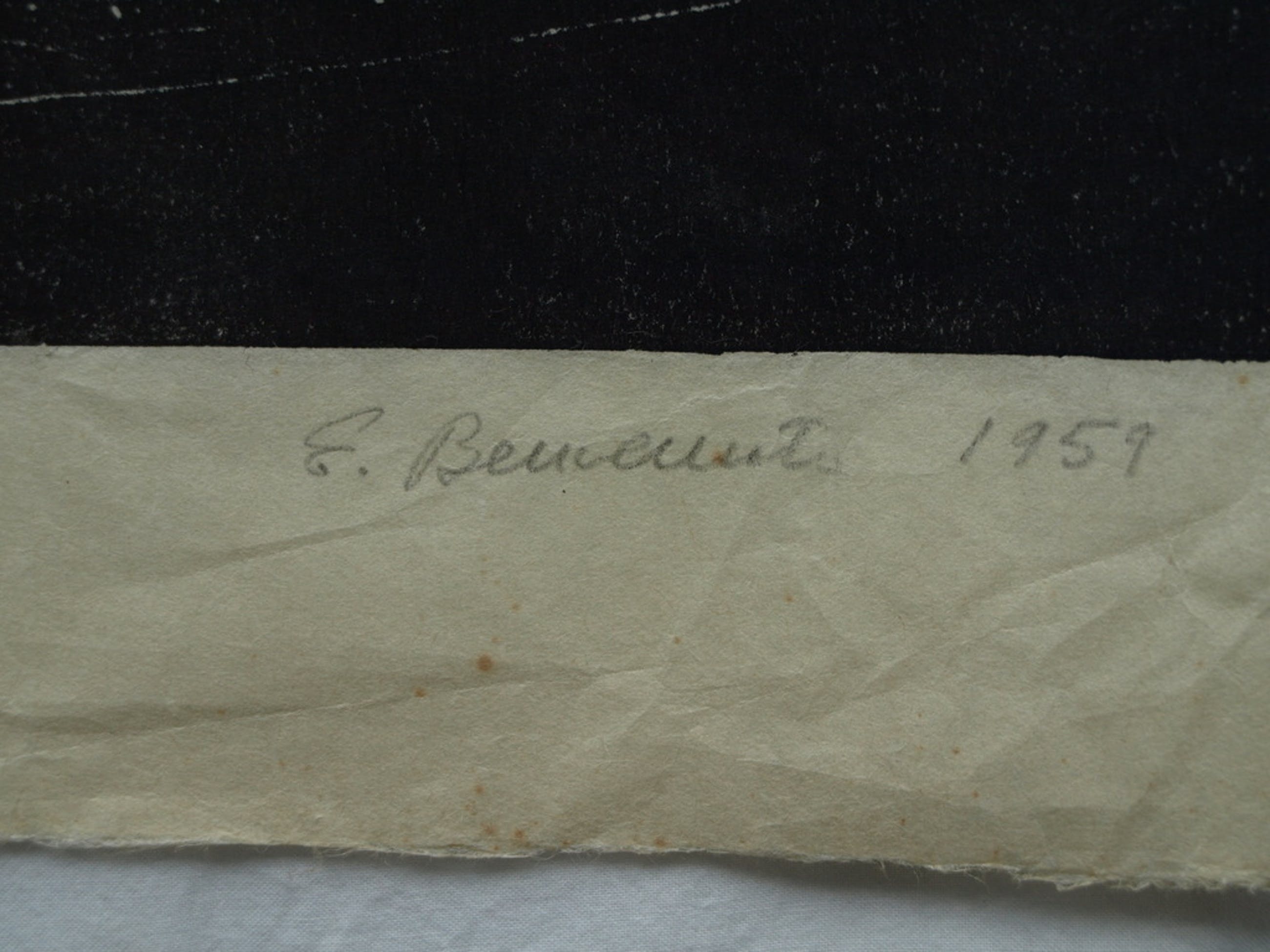 Gesigneerd en gedateerd rechtsonder. Helaas hebben wij de signatuur (“E. Beuveurs”?) niet kunnen herkennen en wij hebben ook geen verdere informatie over de kunstenaar. Op de achterkant staat in het Engels geschreven dat de houtsnede gegeven is (aan Fritz Lambert) t.g.v. een “Visit to San Francisco in august 1962”.