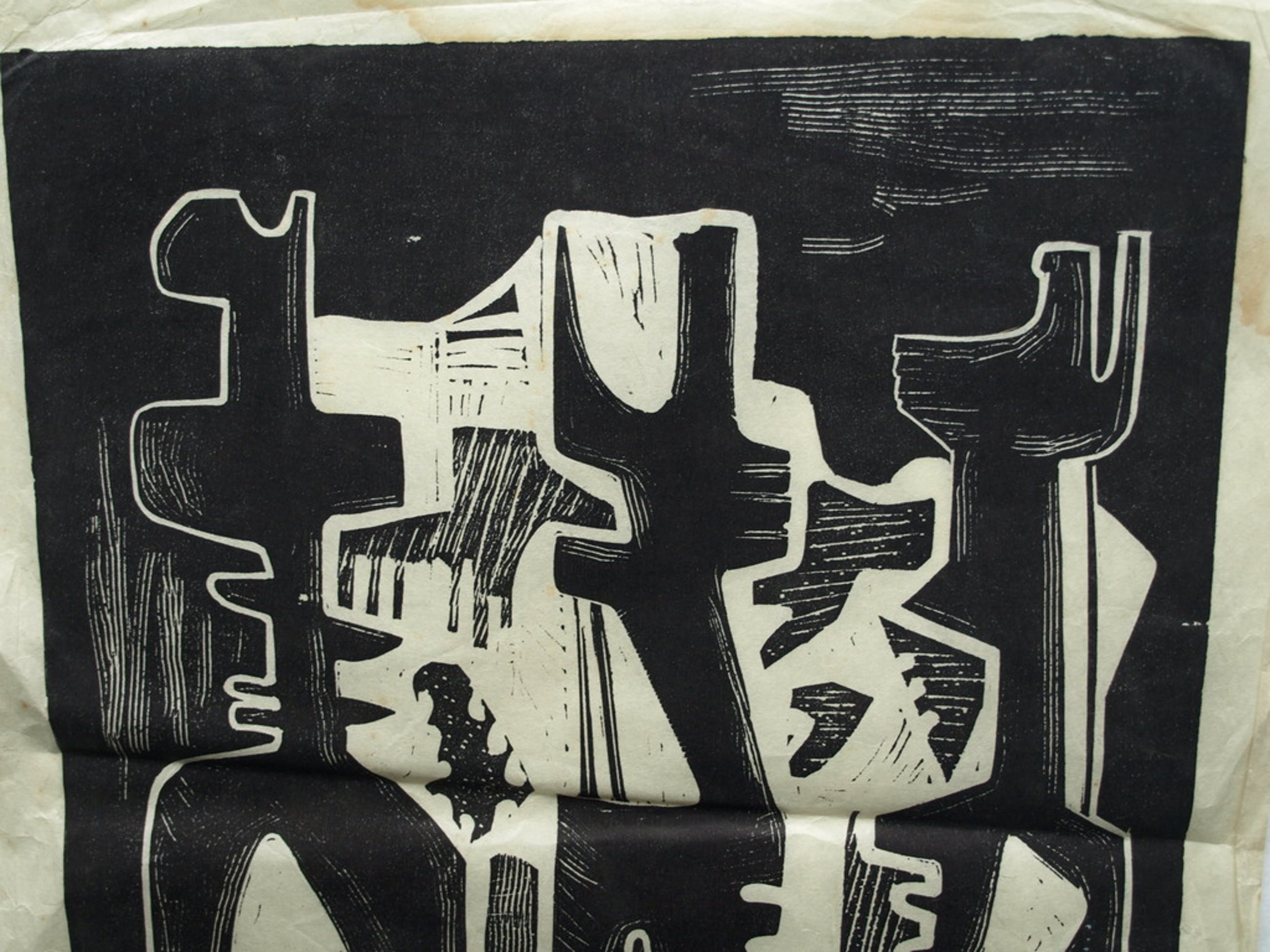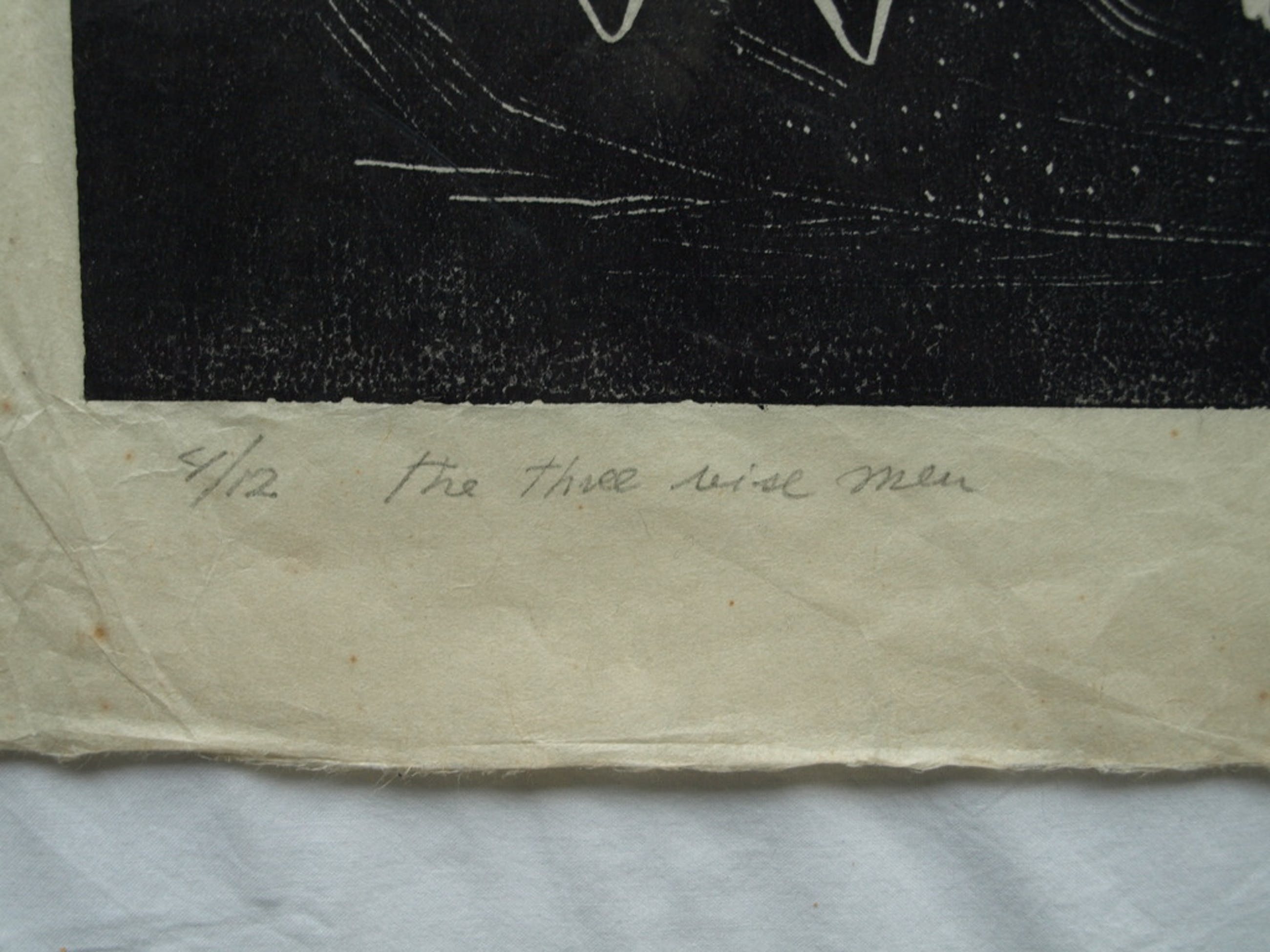 Een grote druk van een houtsnede op dun papier, met een abstracte voorstelling van de 3 Koningen: “The Three Wise Men”.