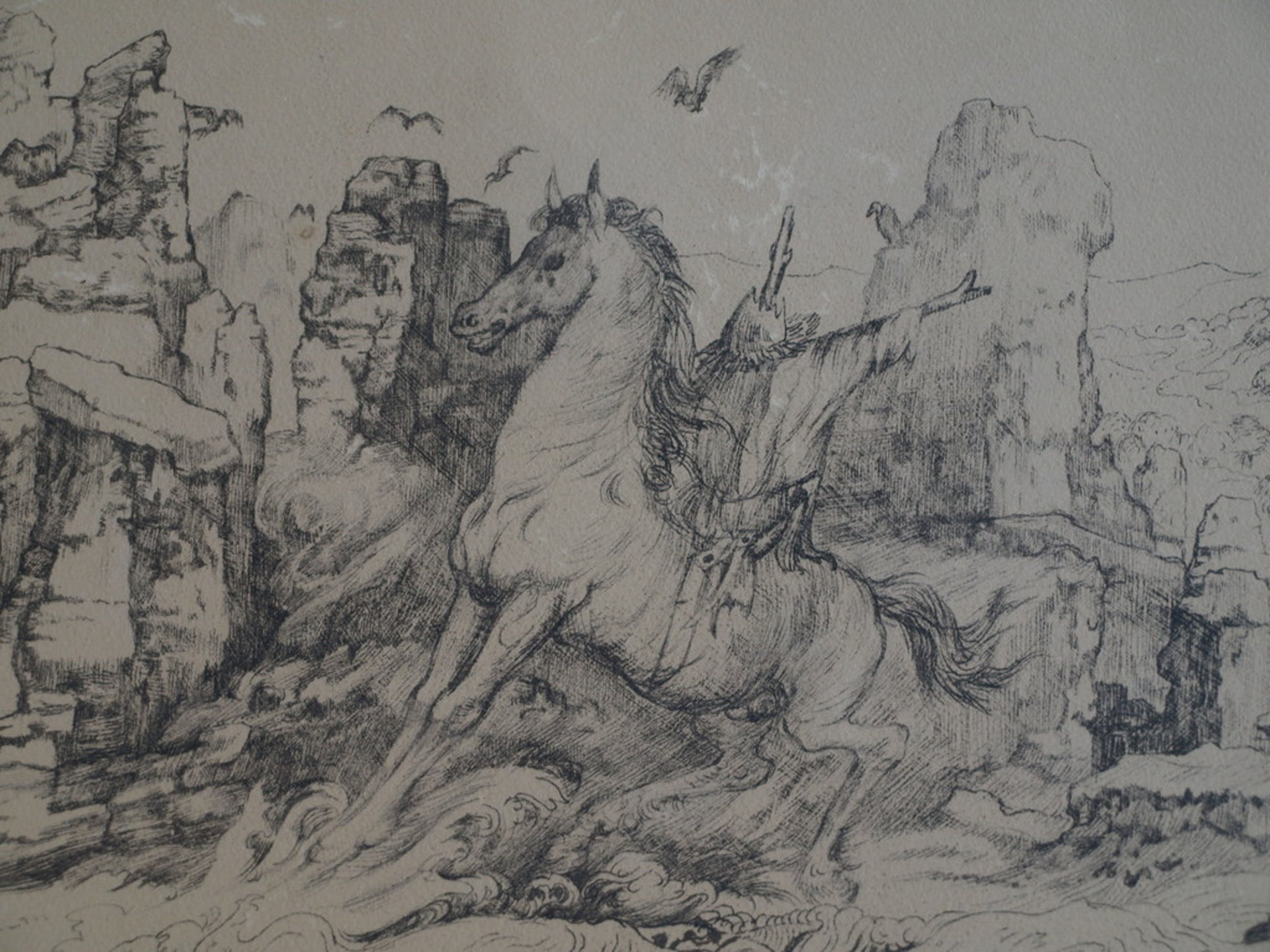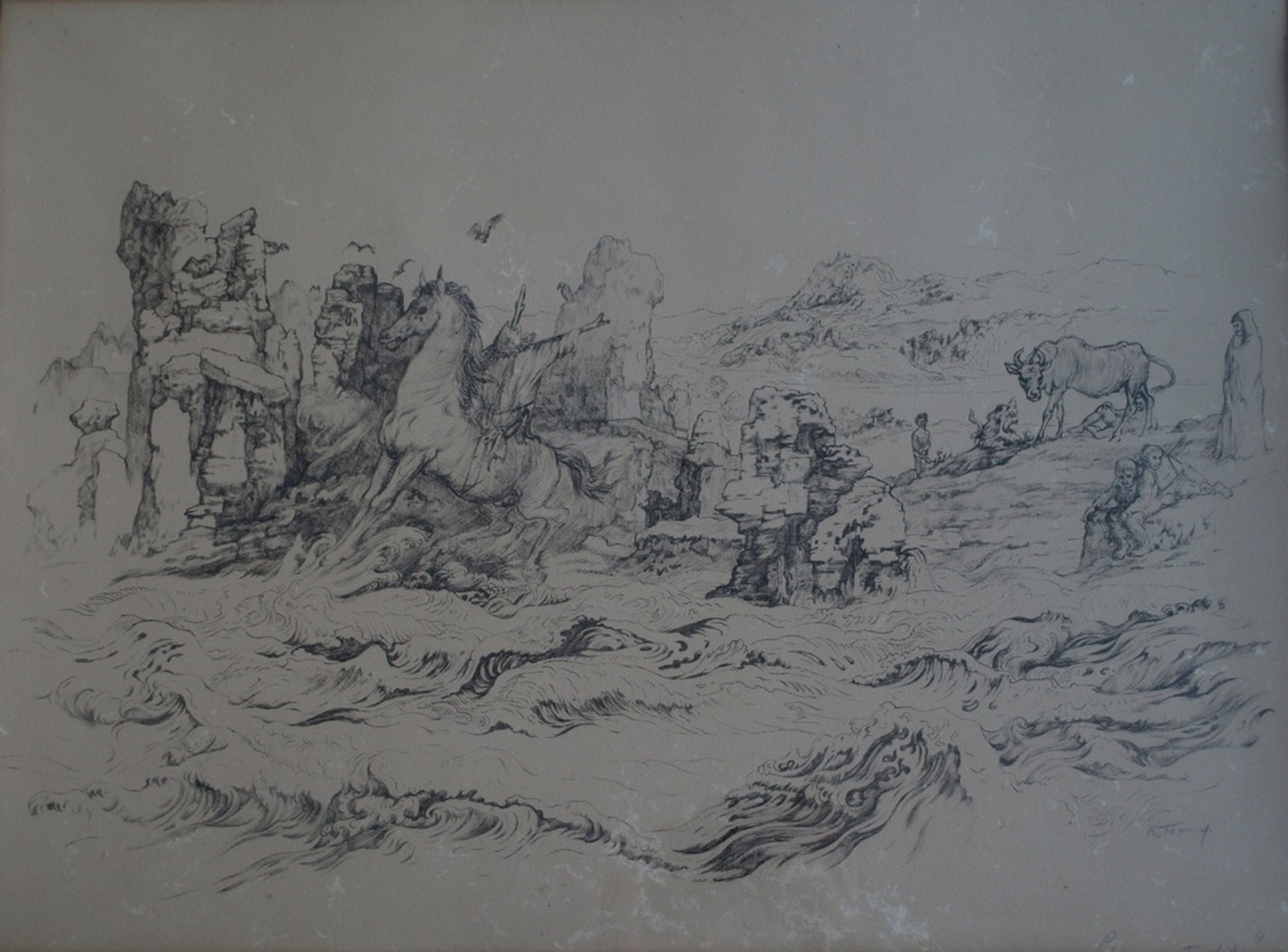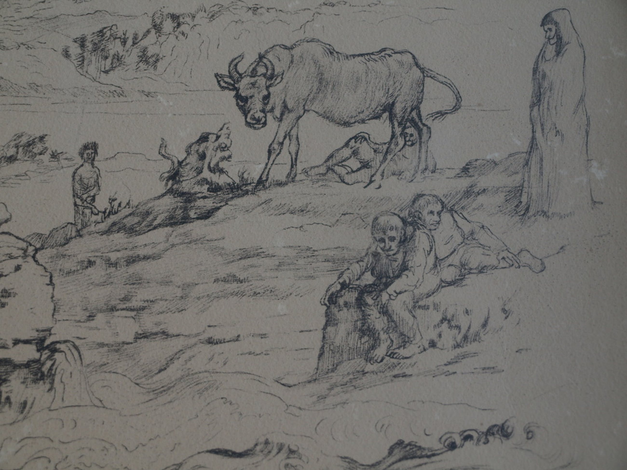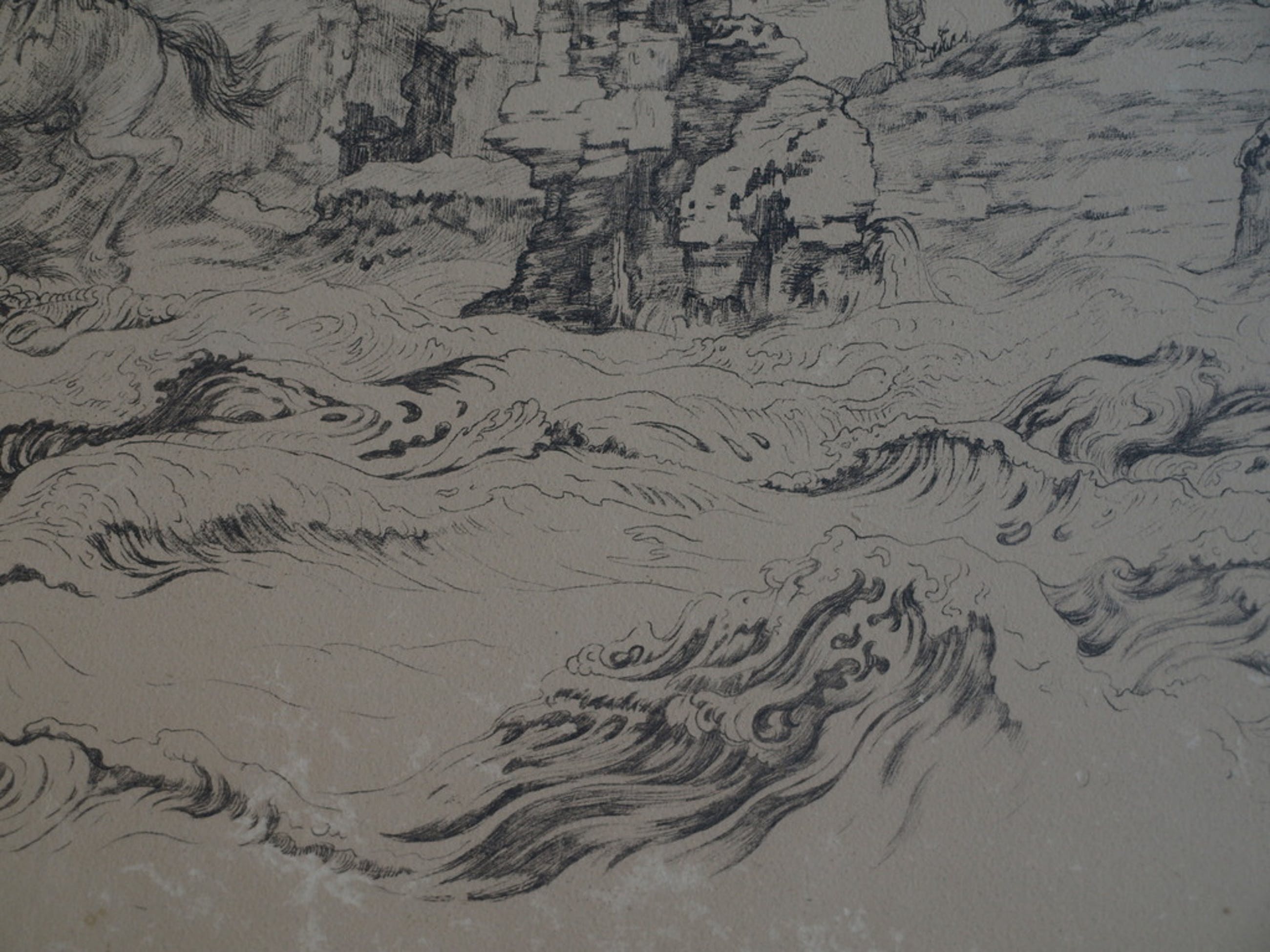 Een oude litho van (waarschijnlijk) een Franse of Belgische kunstenaar getiteld “L’eau interdit” (‘Verboden water’). Een enigszins surrealistische voorstelling.