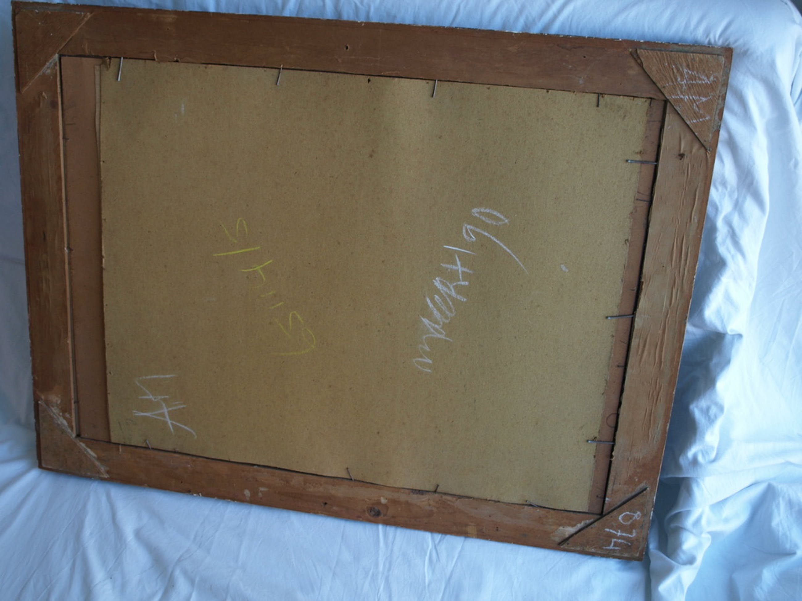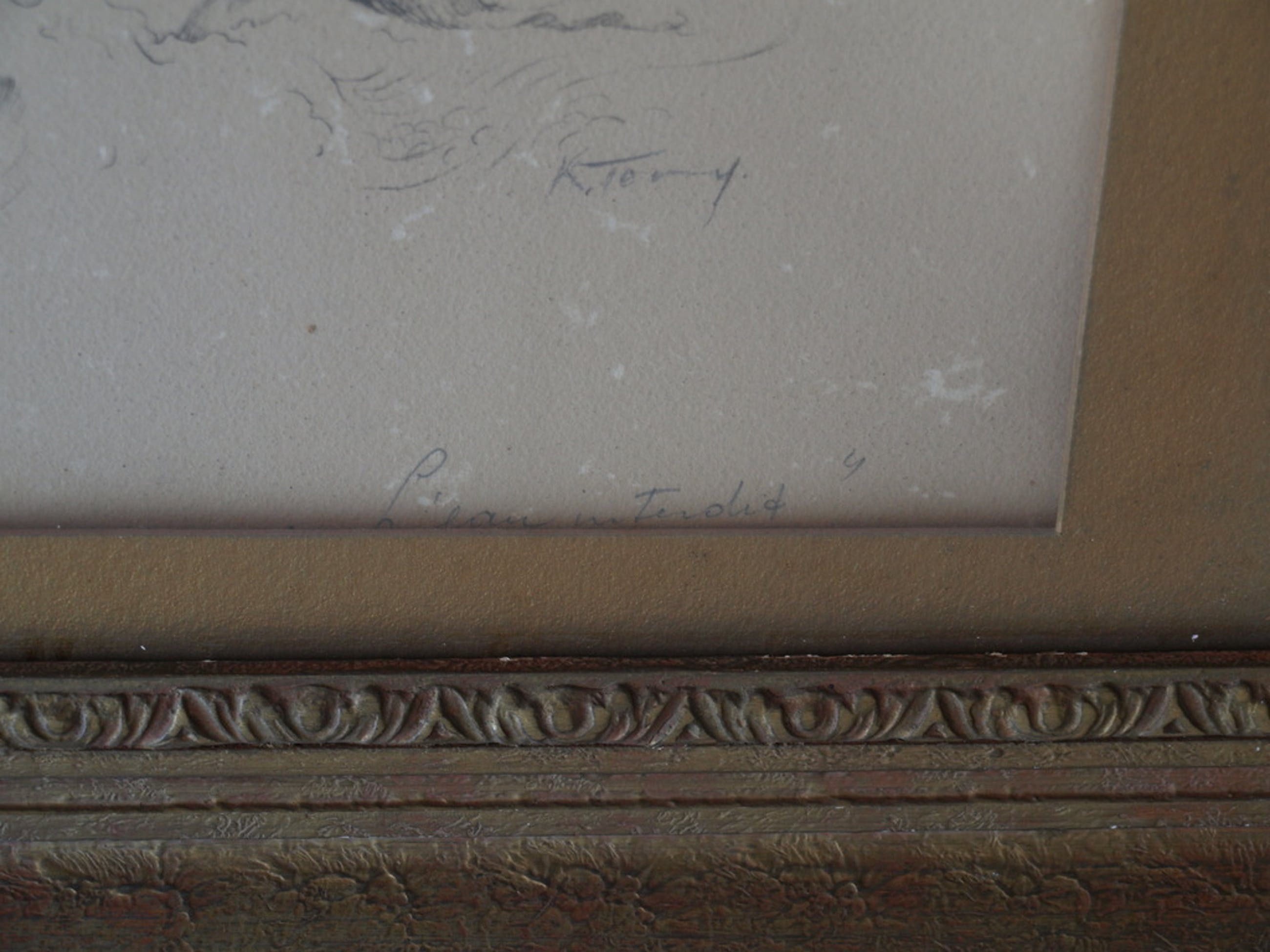 Ingelijst: Het werk is (slordig) ingelijst in een houten lijst met passe-partout en glasplaat.