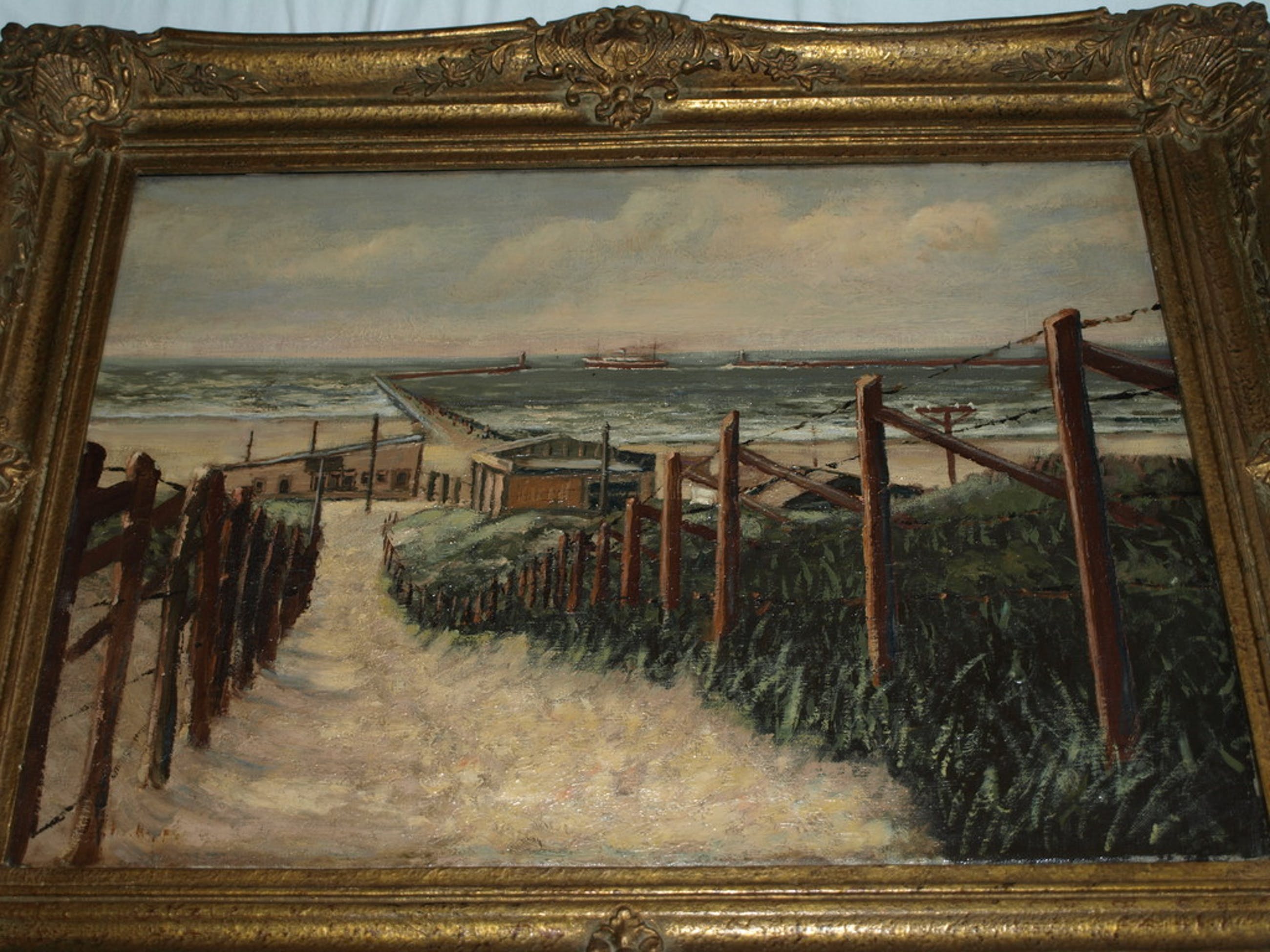 Een groot schilderij uit 1936 met een voorstelling van een strandafgang in IJmuiden met op de achtergrond de pier bij de ingang van het Noordzeekanaal.