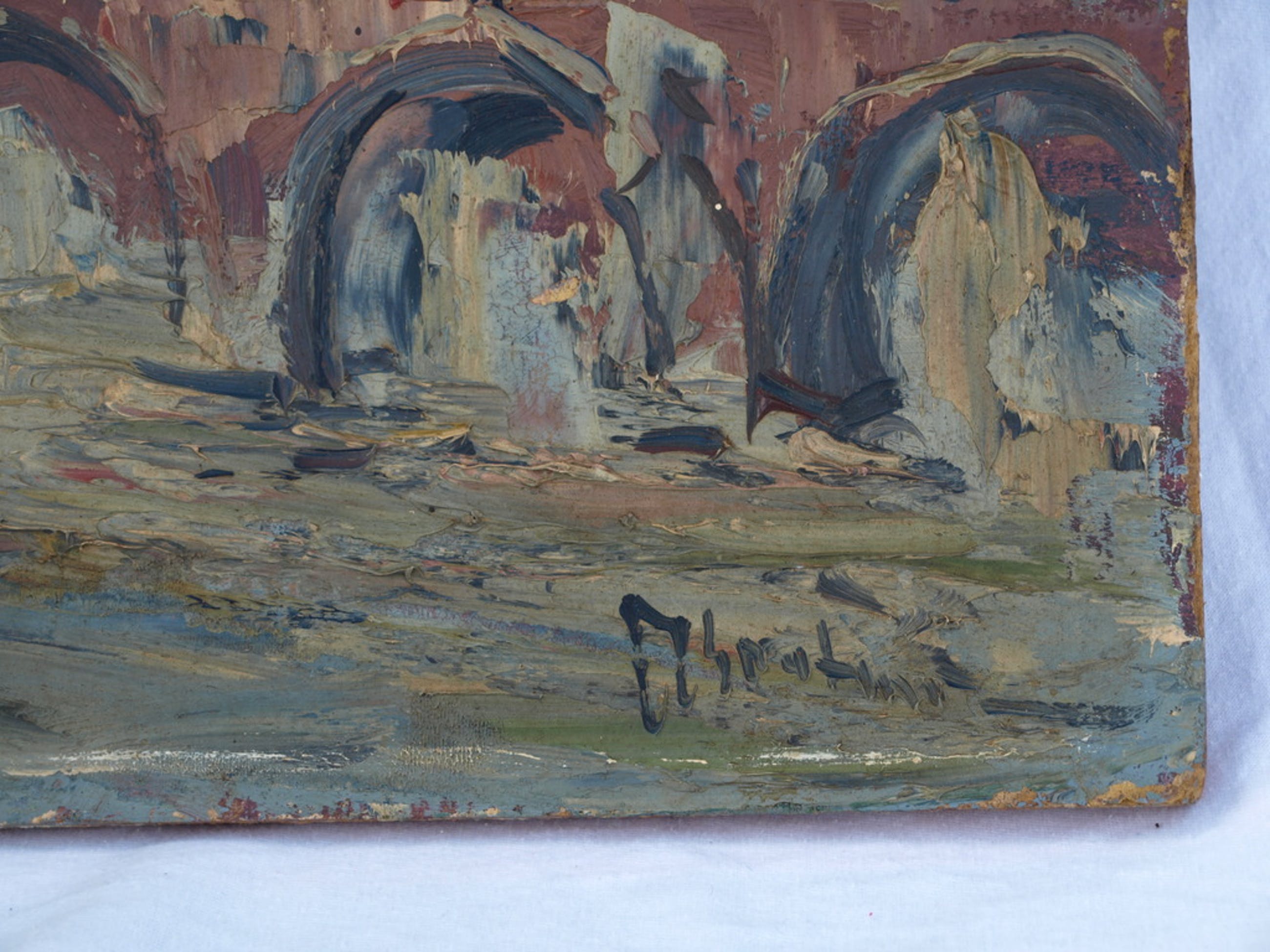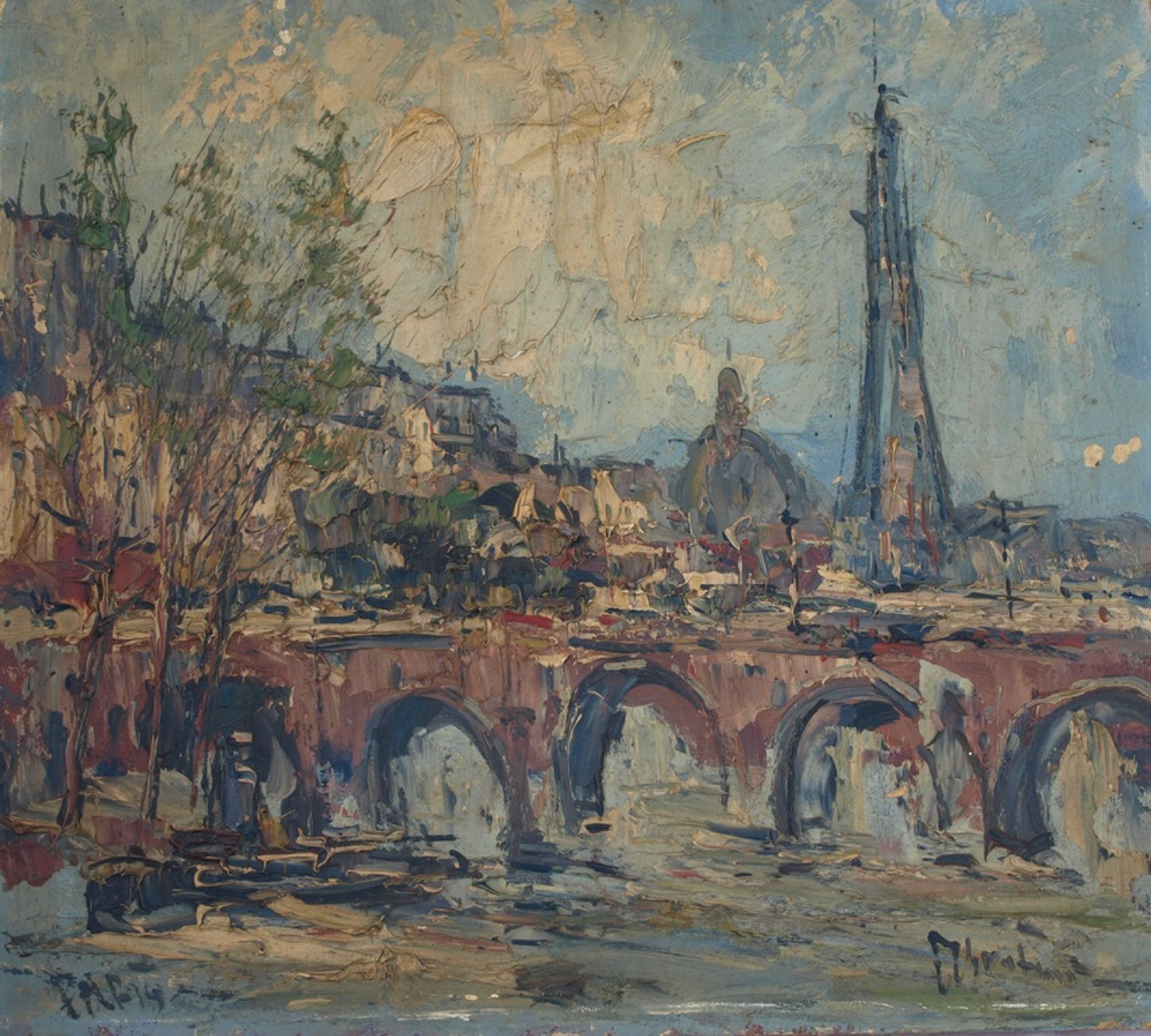 Een oud olieverfschilderij op paneel van (waarschijnlijk) een Franse kunstenaar met een voorstelling van een stadsgezicht in Parijs. Getiteld “Paris”.