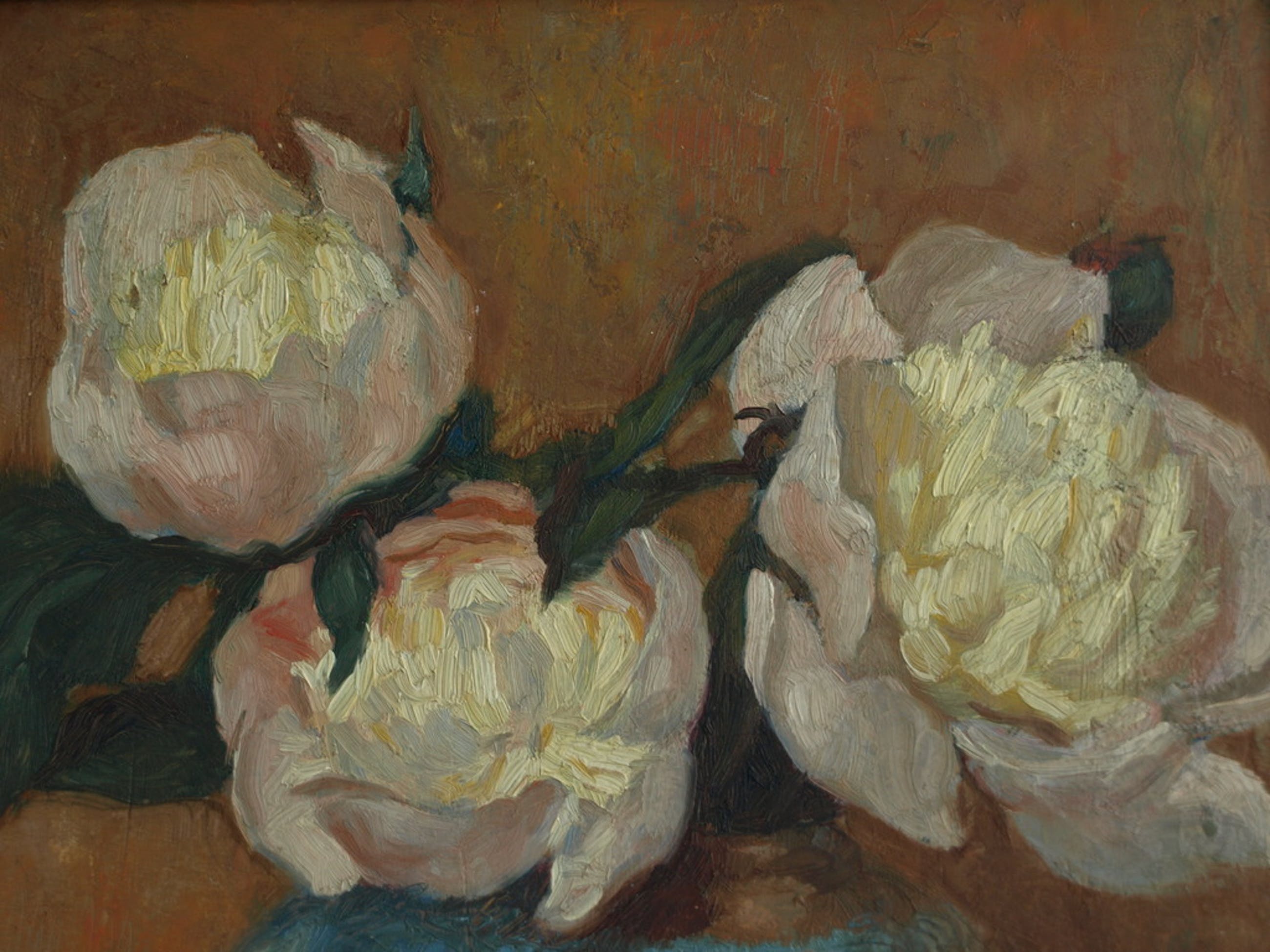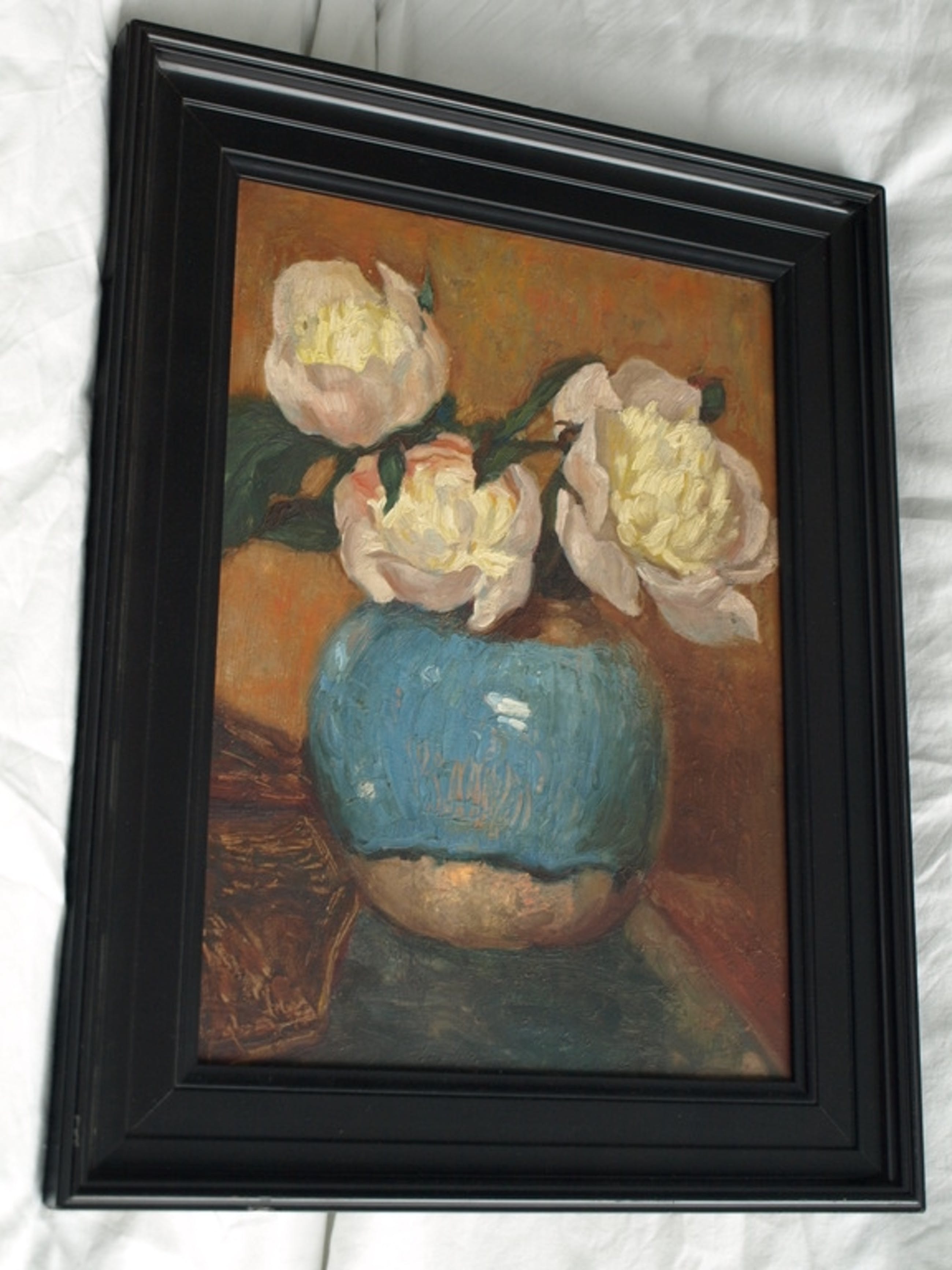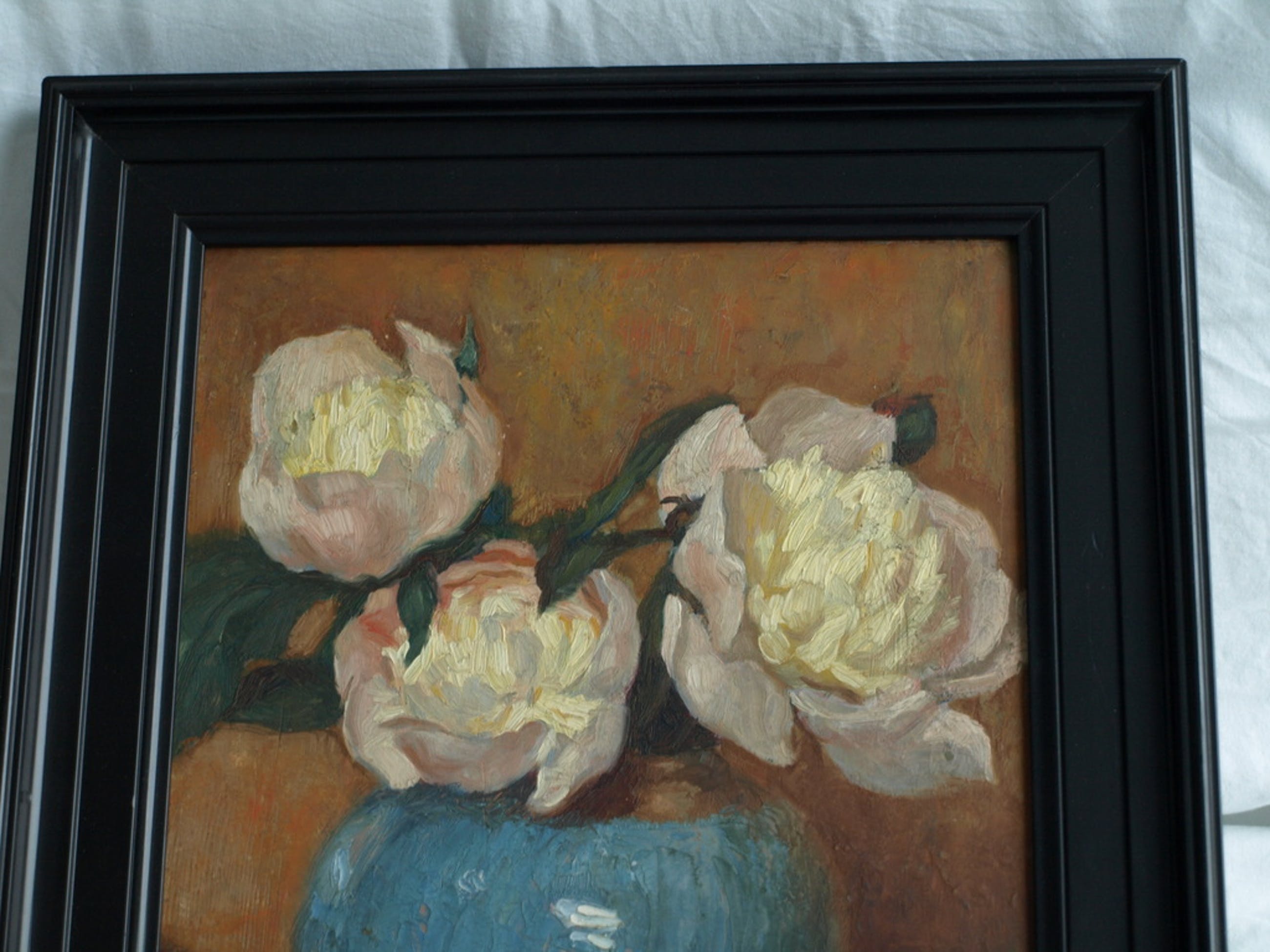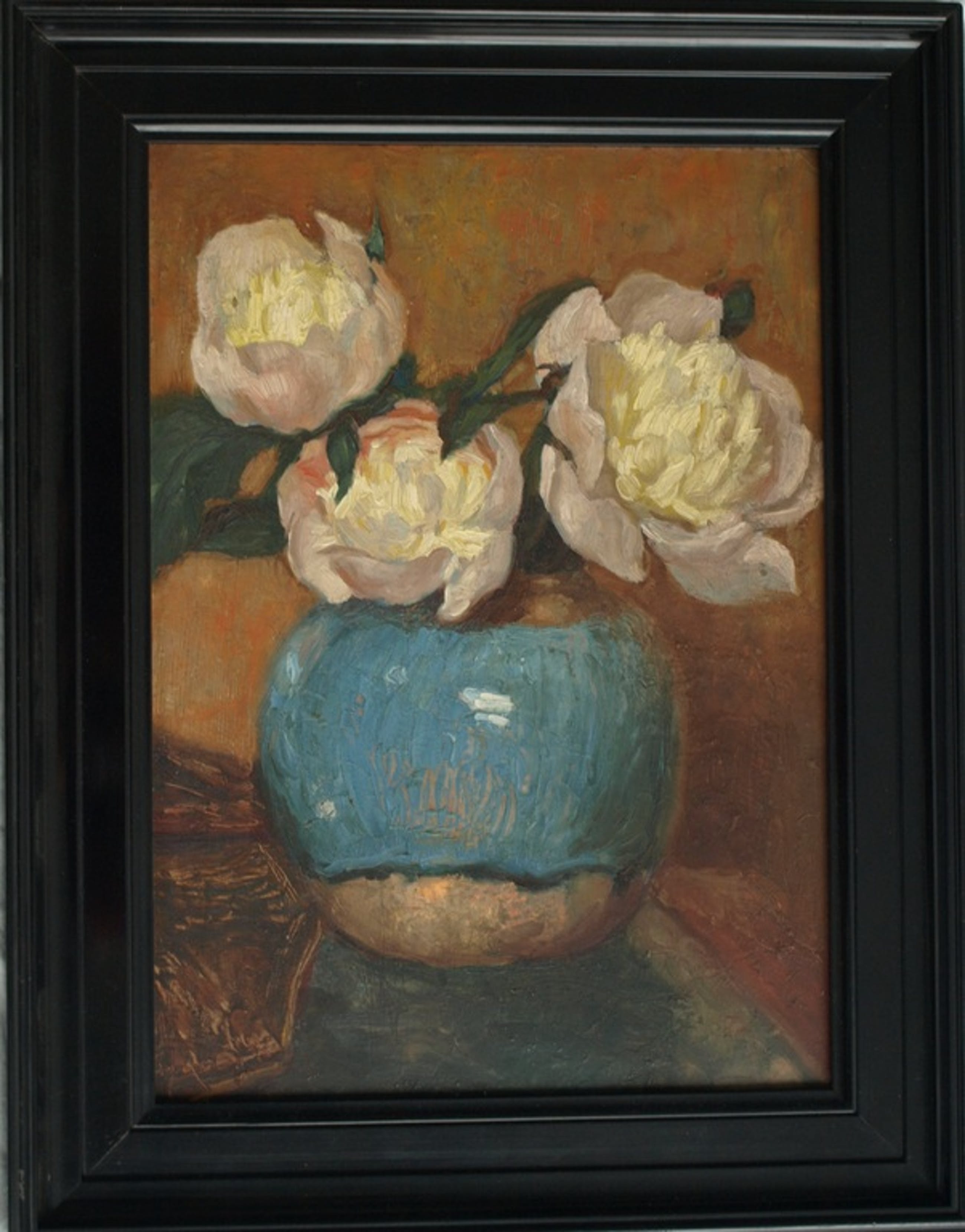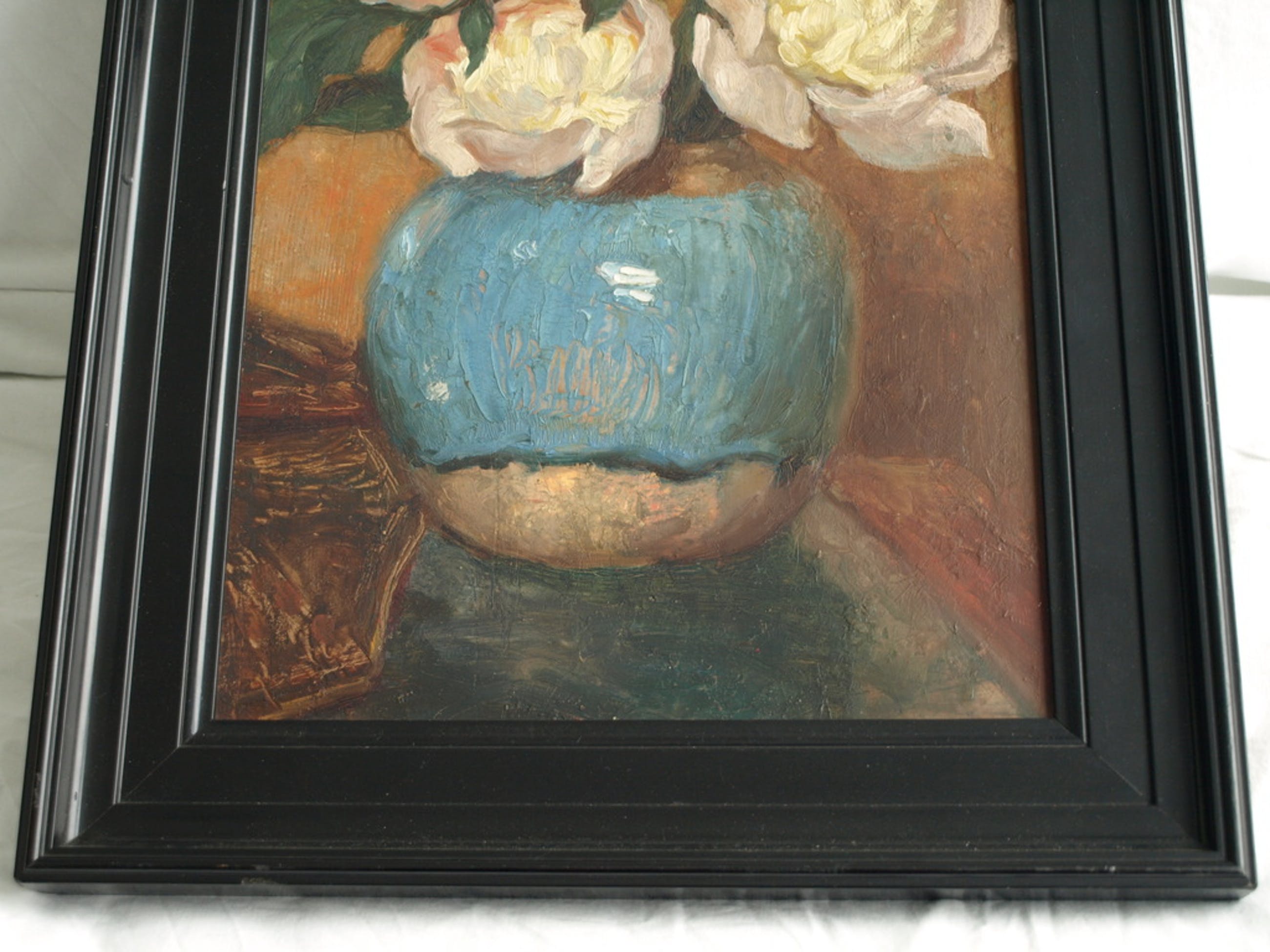 Een olieverfschilderij met een bloemstilleven, geschilderd op een houten paneel en ingelijst in een zwarte houten lijst.