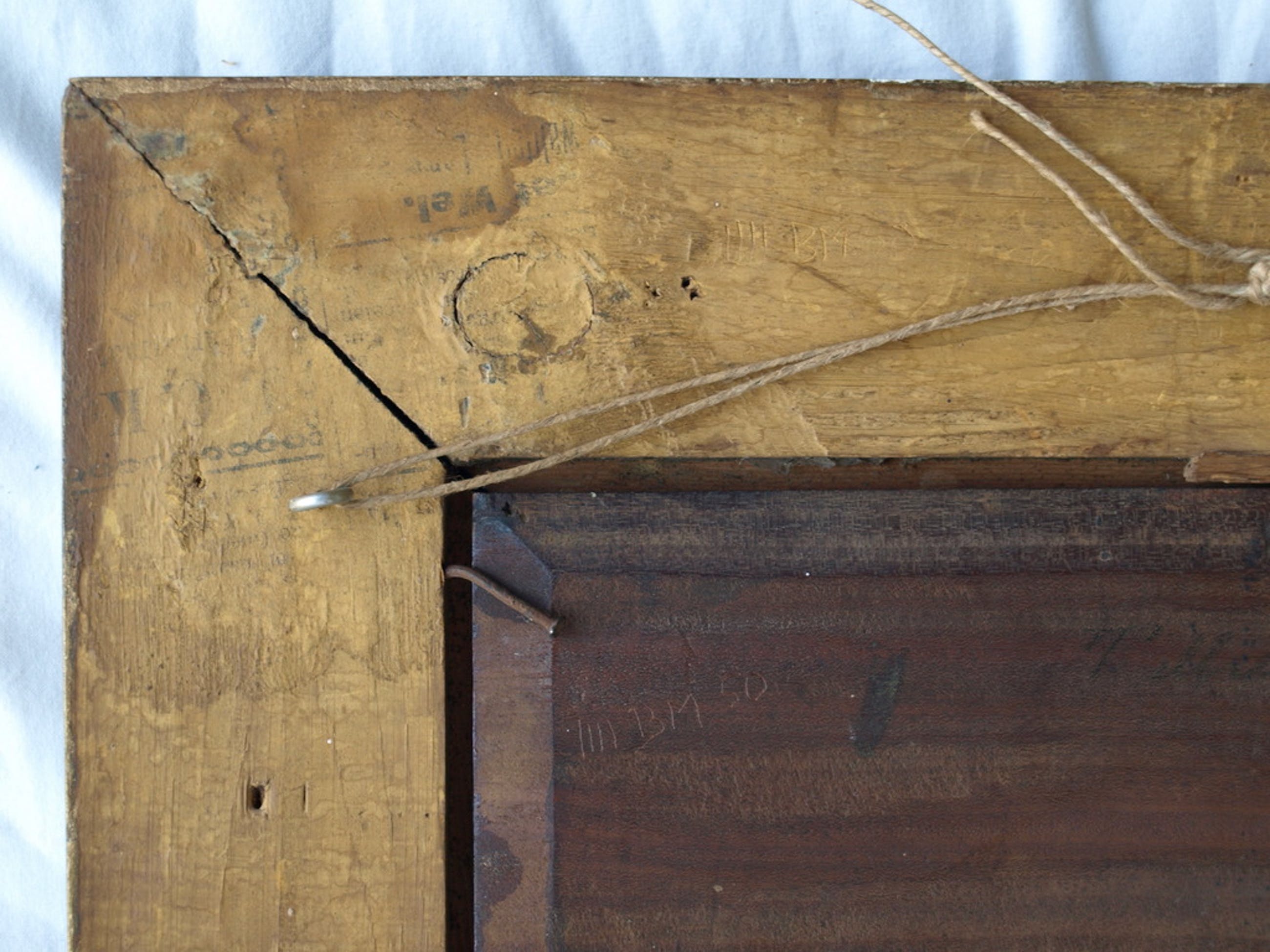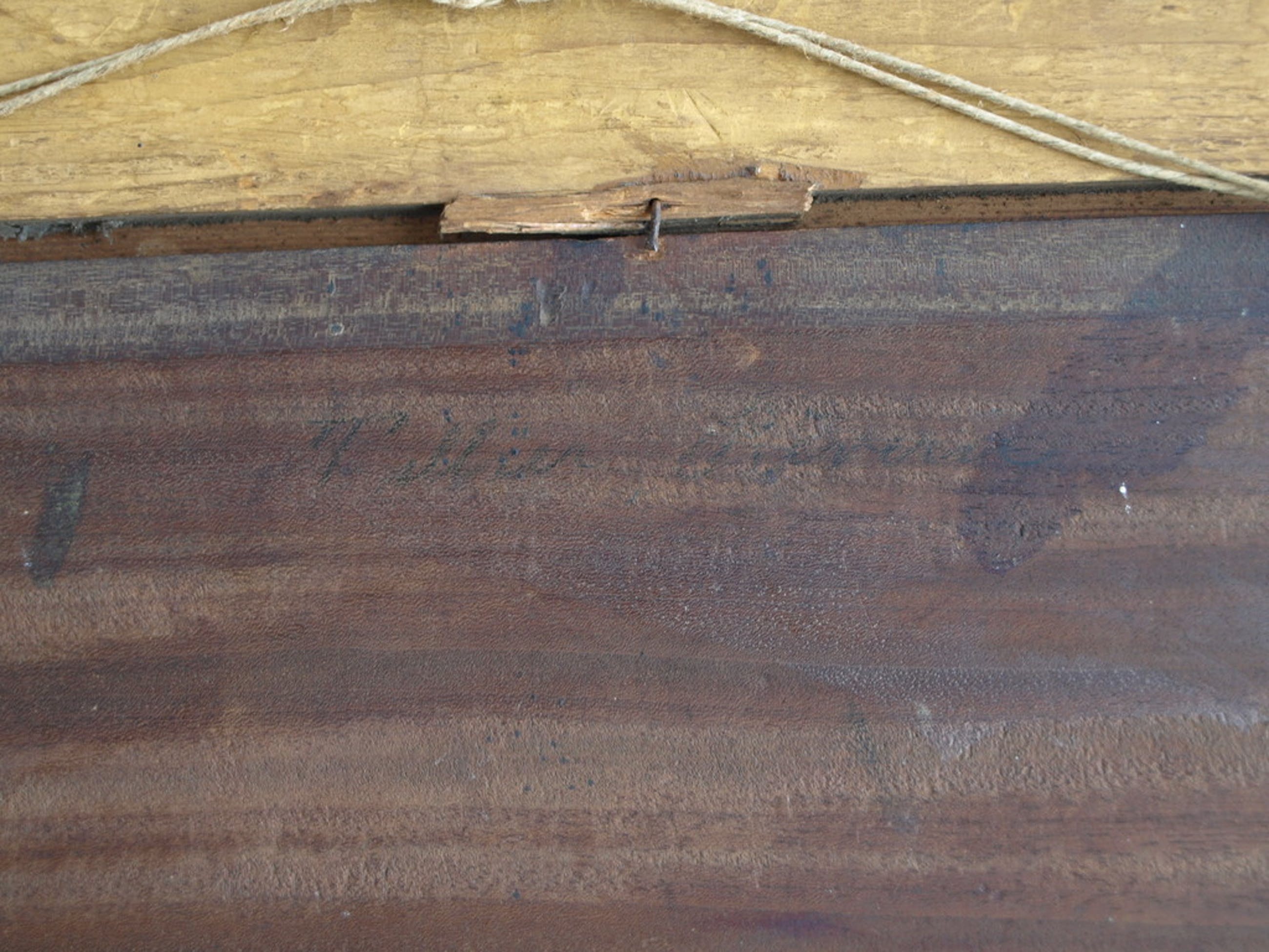 Conditie: Het werk heeft craquelé en slijtplekken. De spijkers waarmee het paneel in de lijst bevestigd is zijn verroest en 2 spijkers ontbreken.