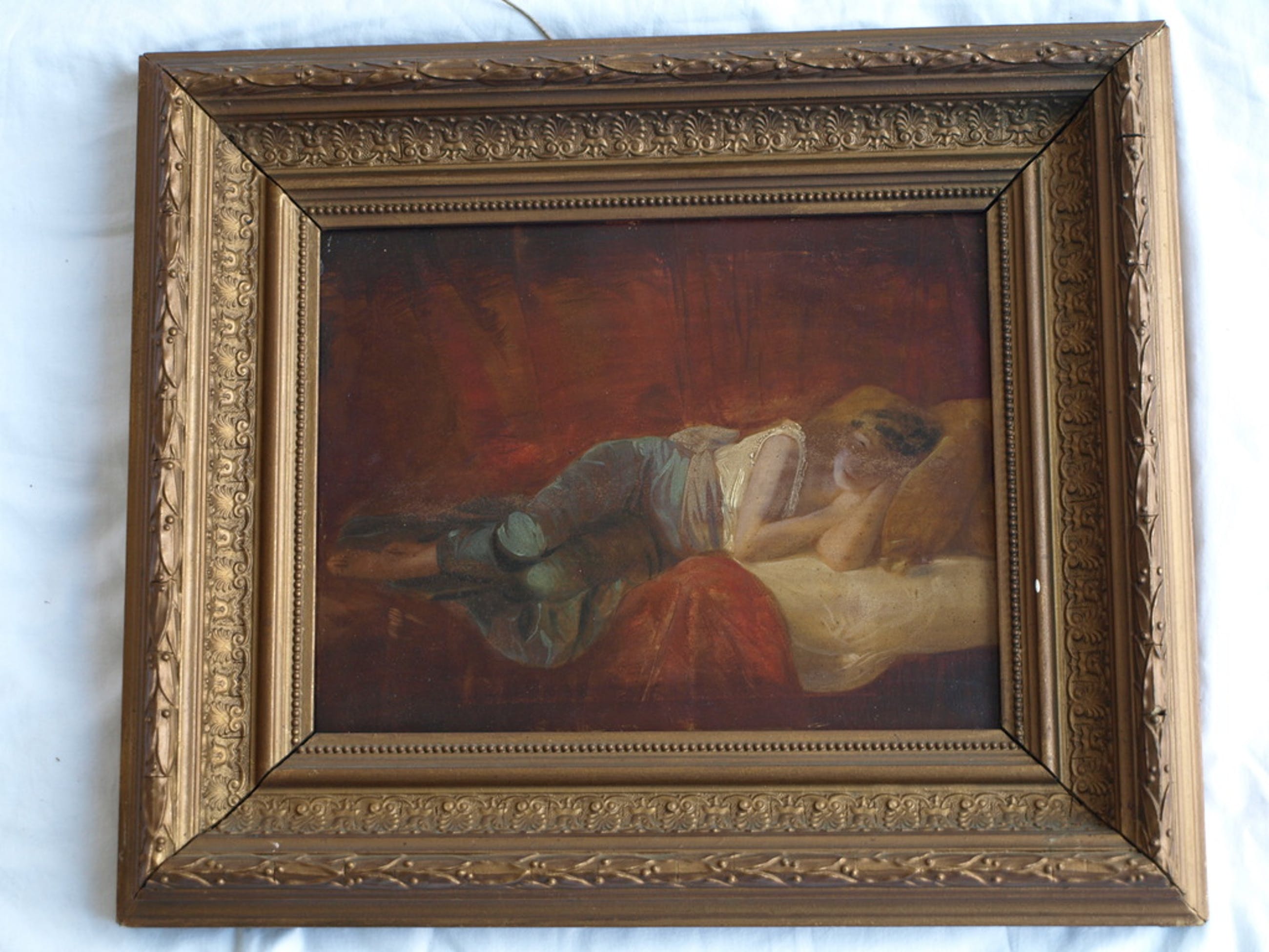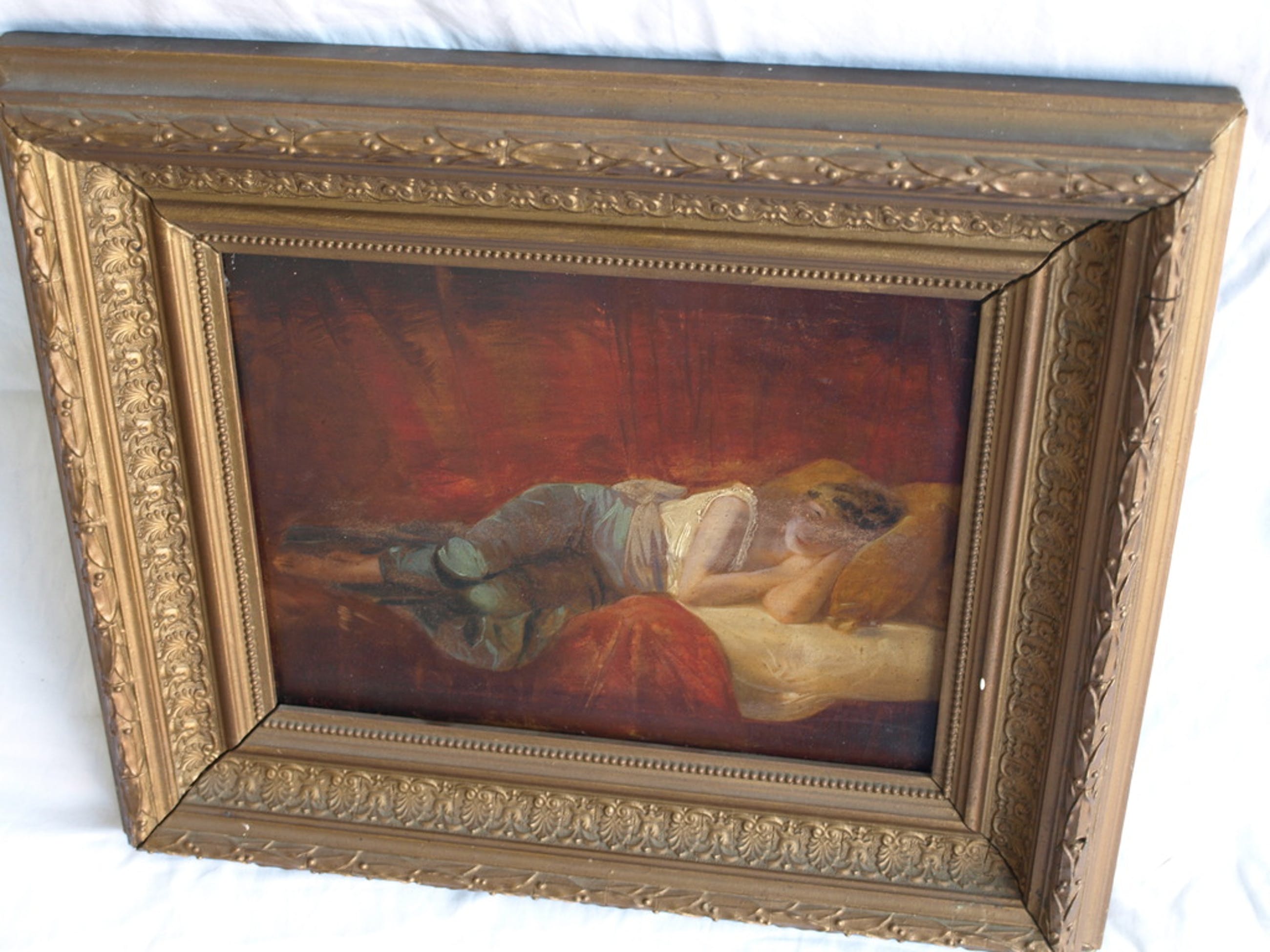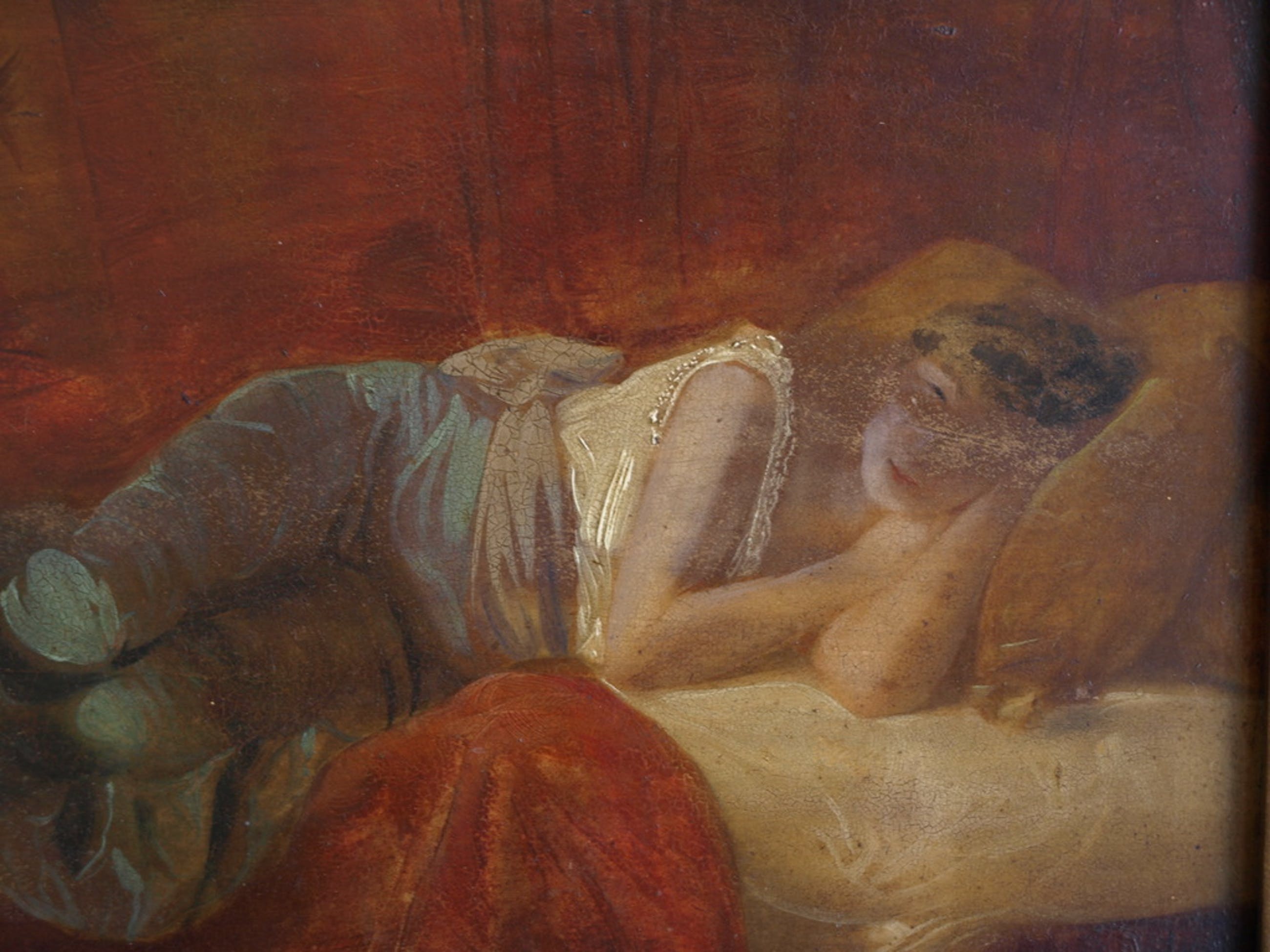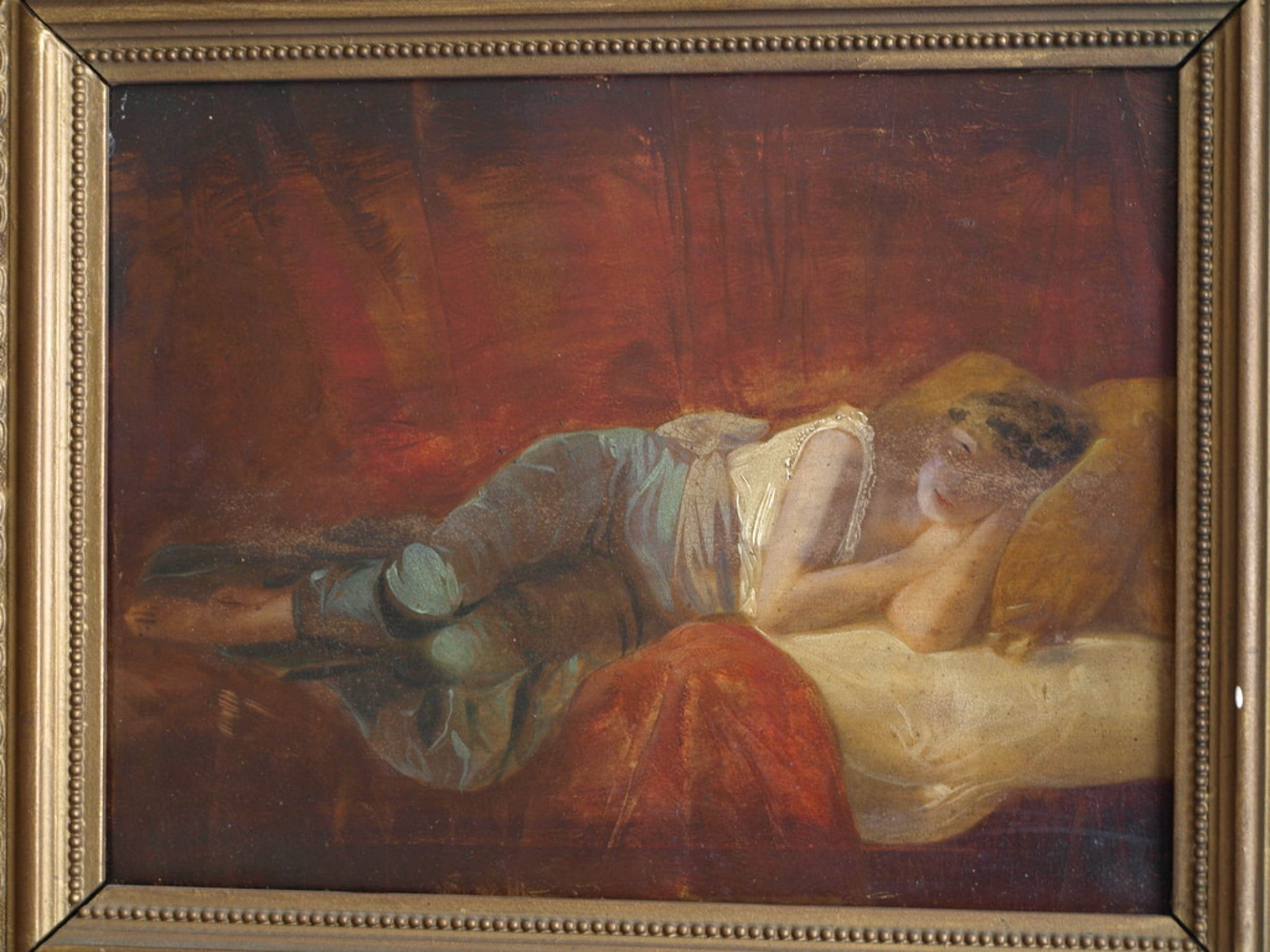 Een oud en bijzonder schilderij met een voorstelling van een slapende vrouw.