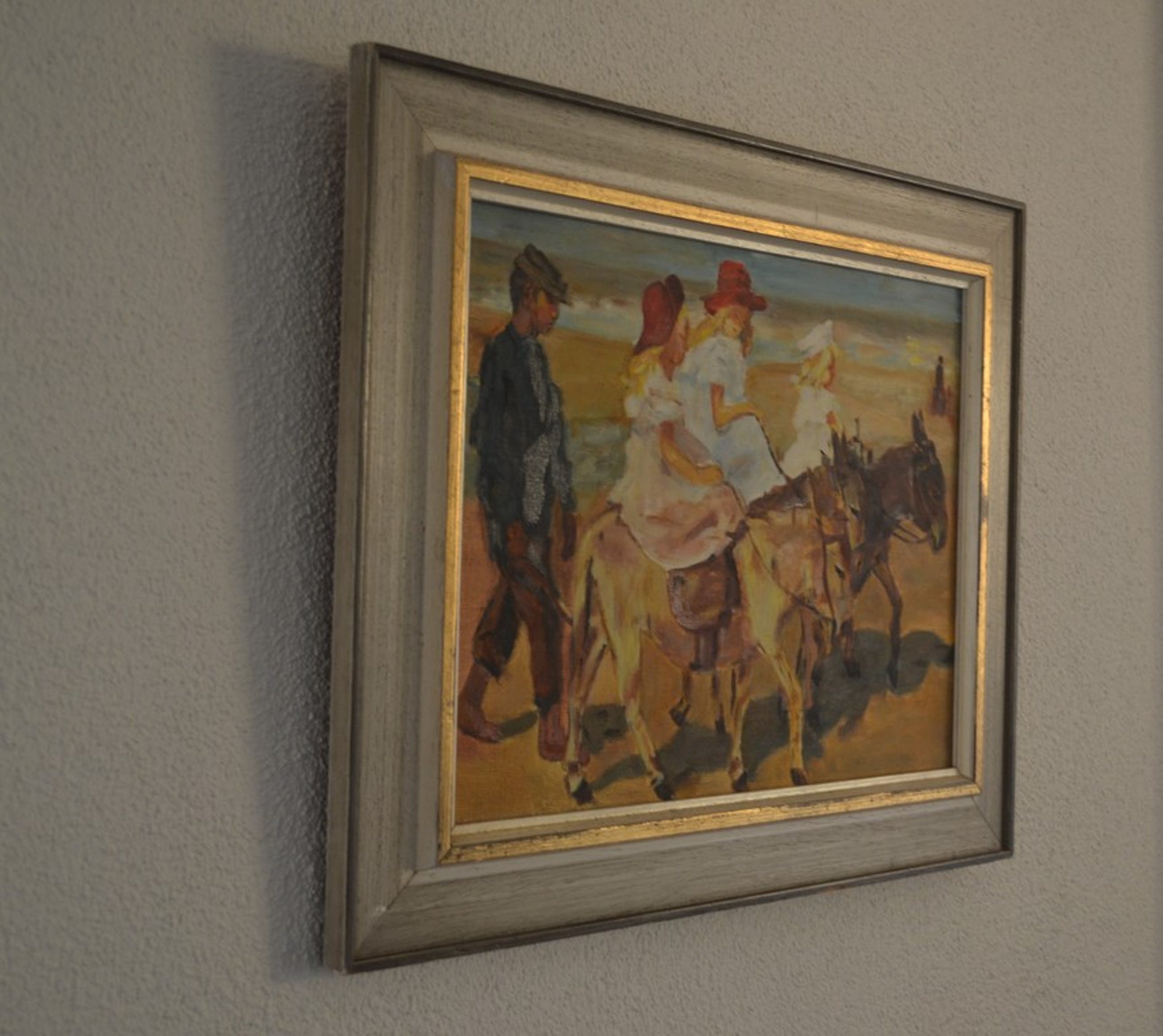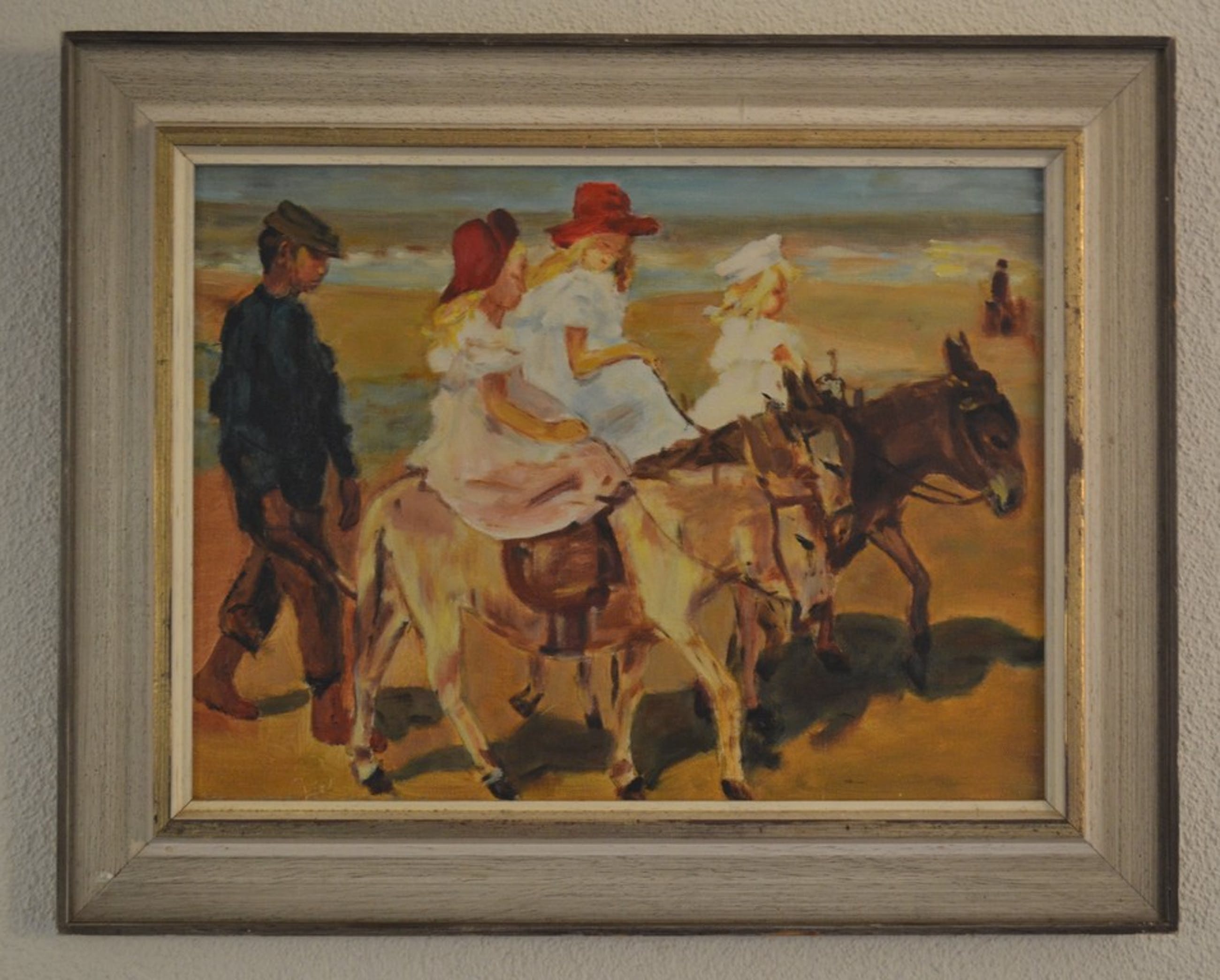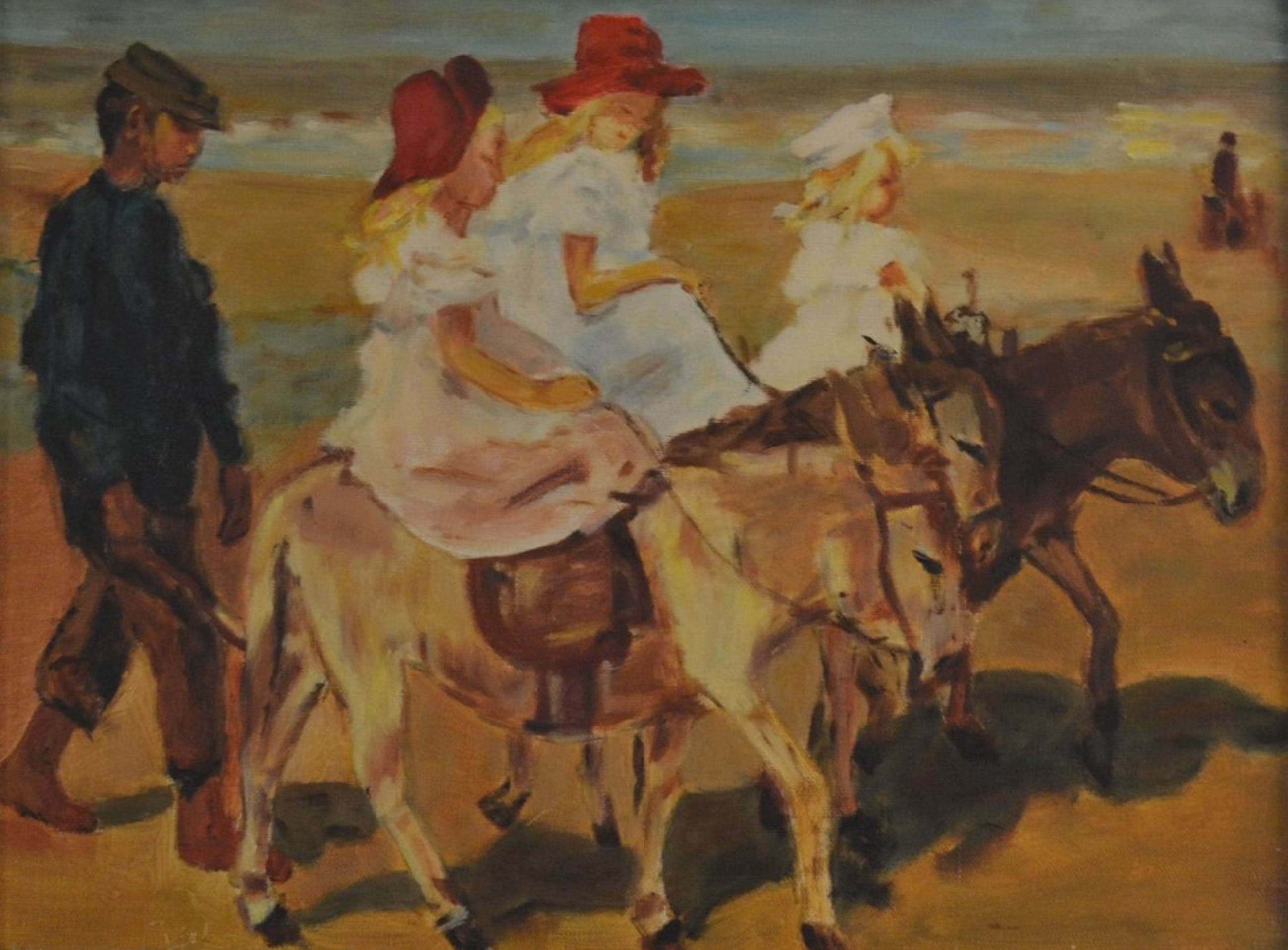 Vlot geschilderd en vrolijk schilderij. Ezeltje rijden op het strand, naar een werk van Isaac Israels. Het toont een zomers strandgezicht met drie ezelrijdende meisjes, gevolgd door een oppasser.