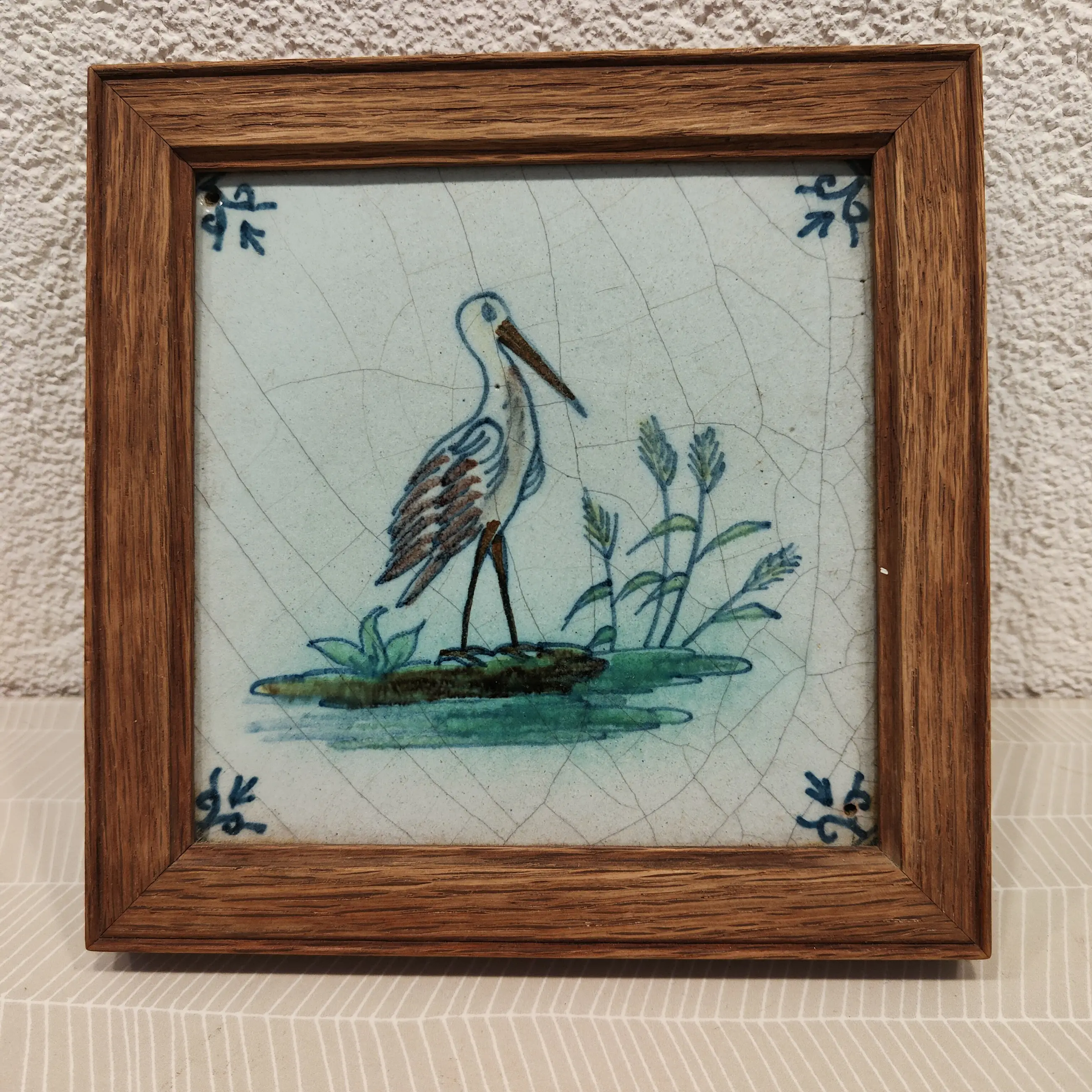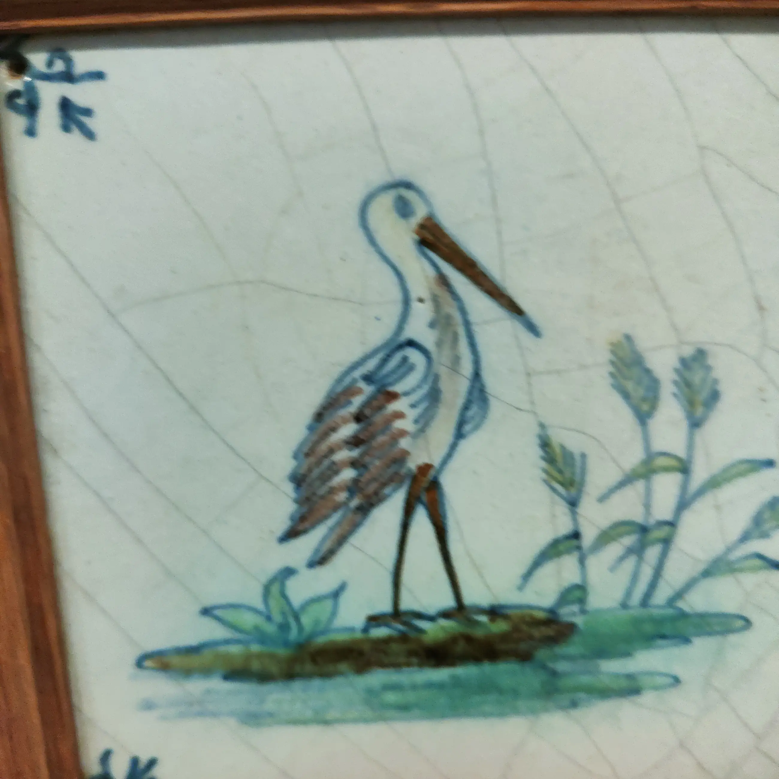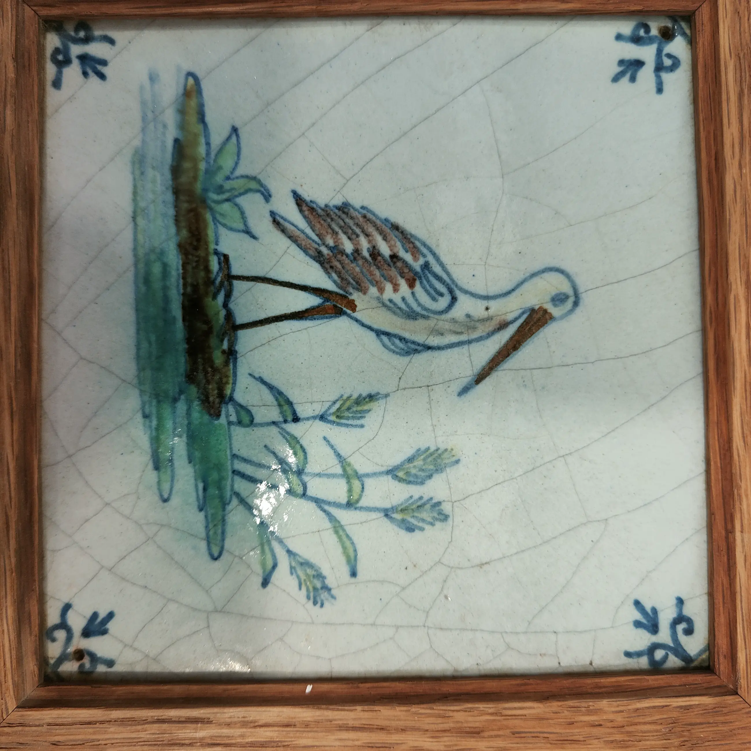 Gaaf spijker tegeltje met een ooievaar 17 de eeuw. Delfts blauw