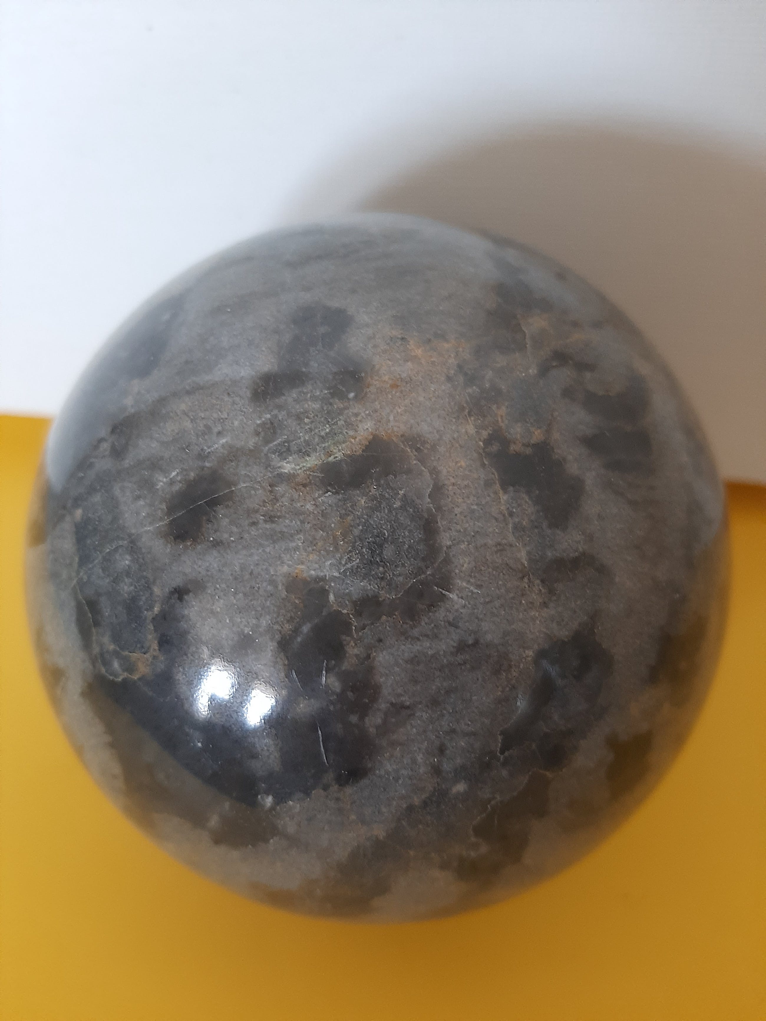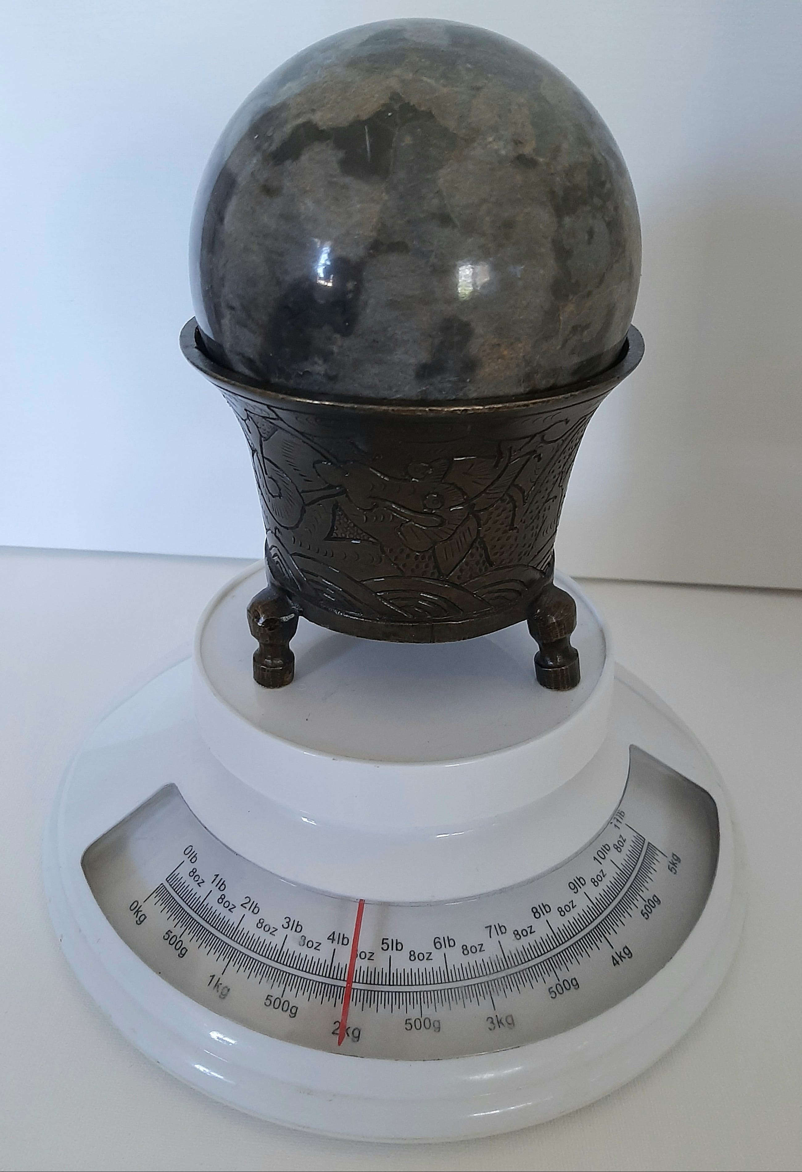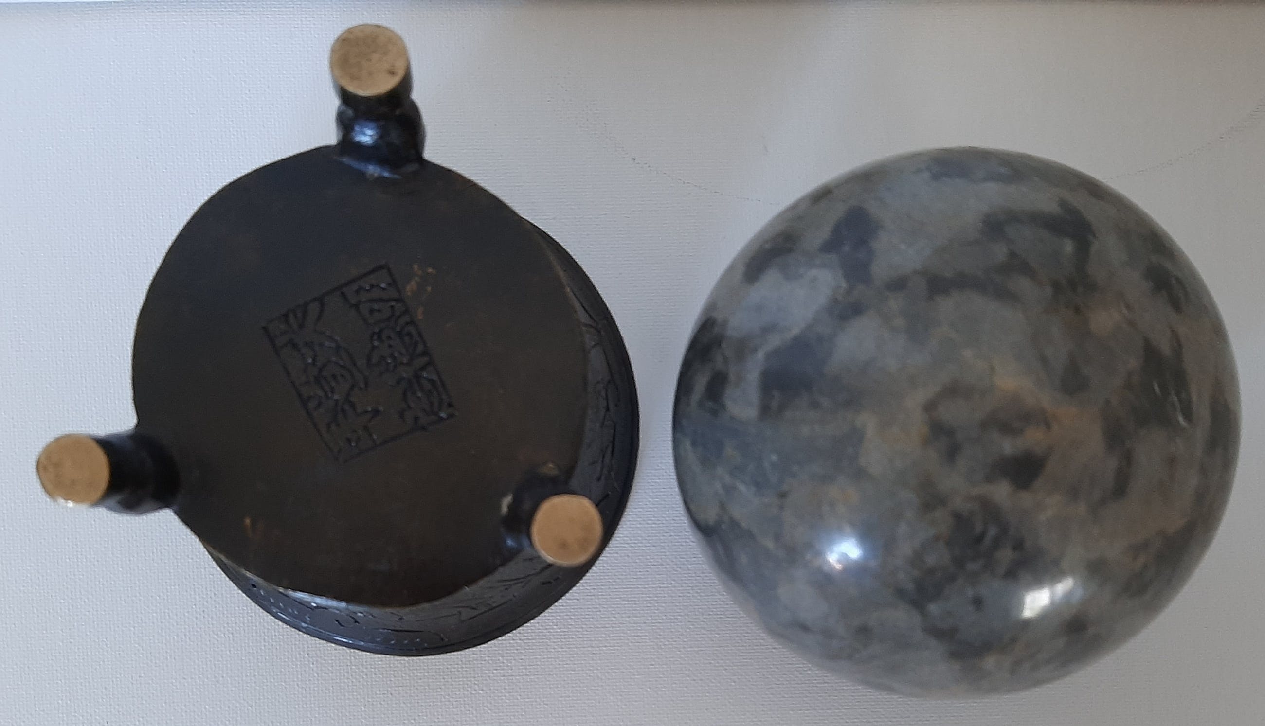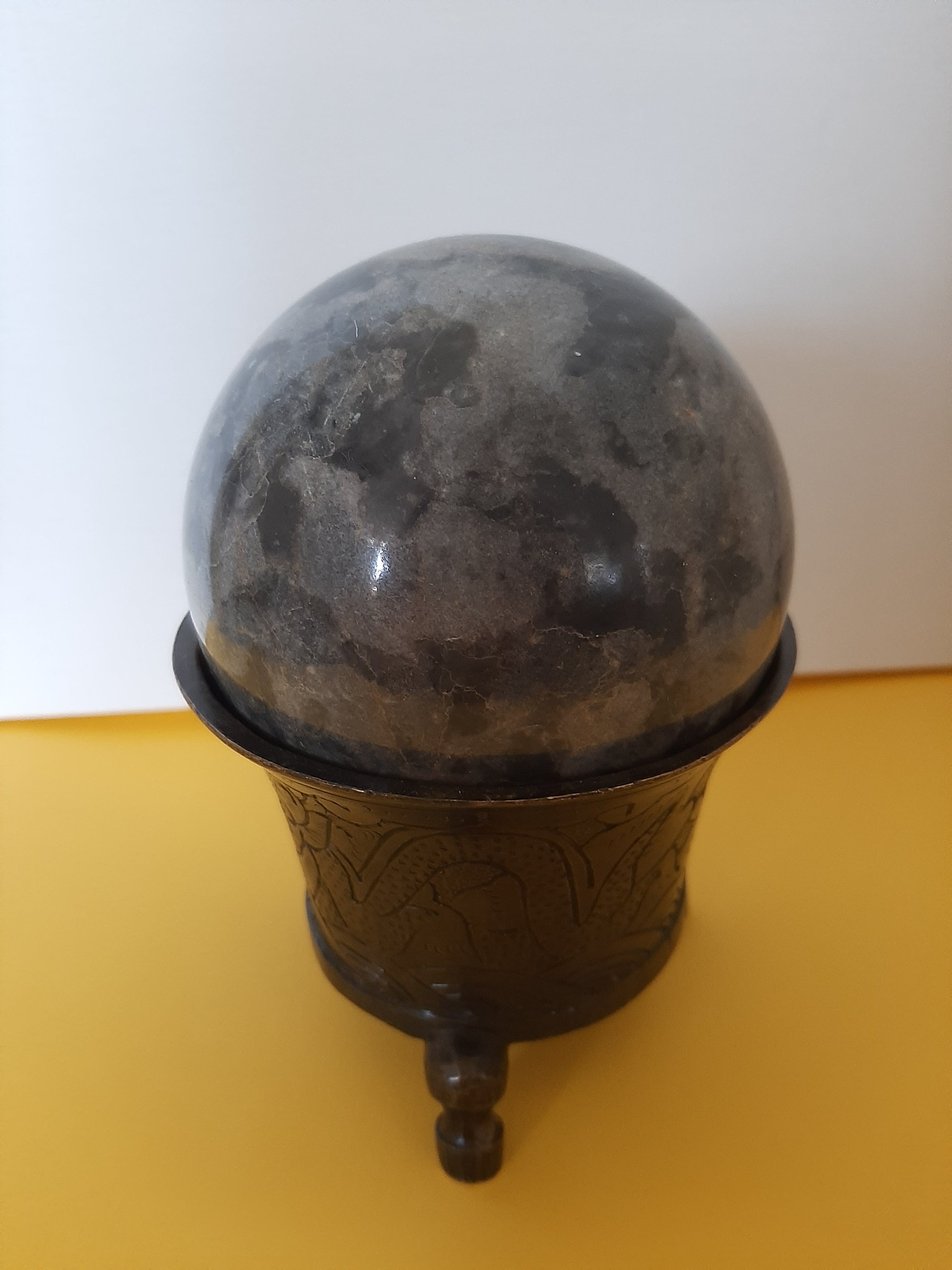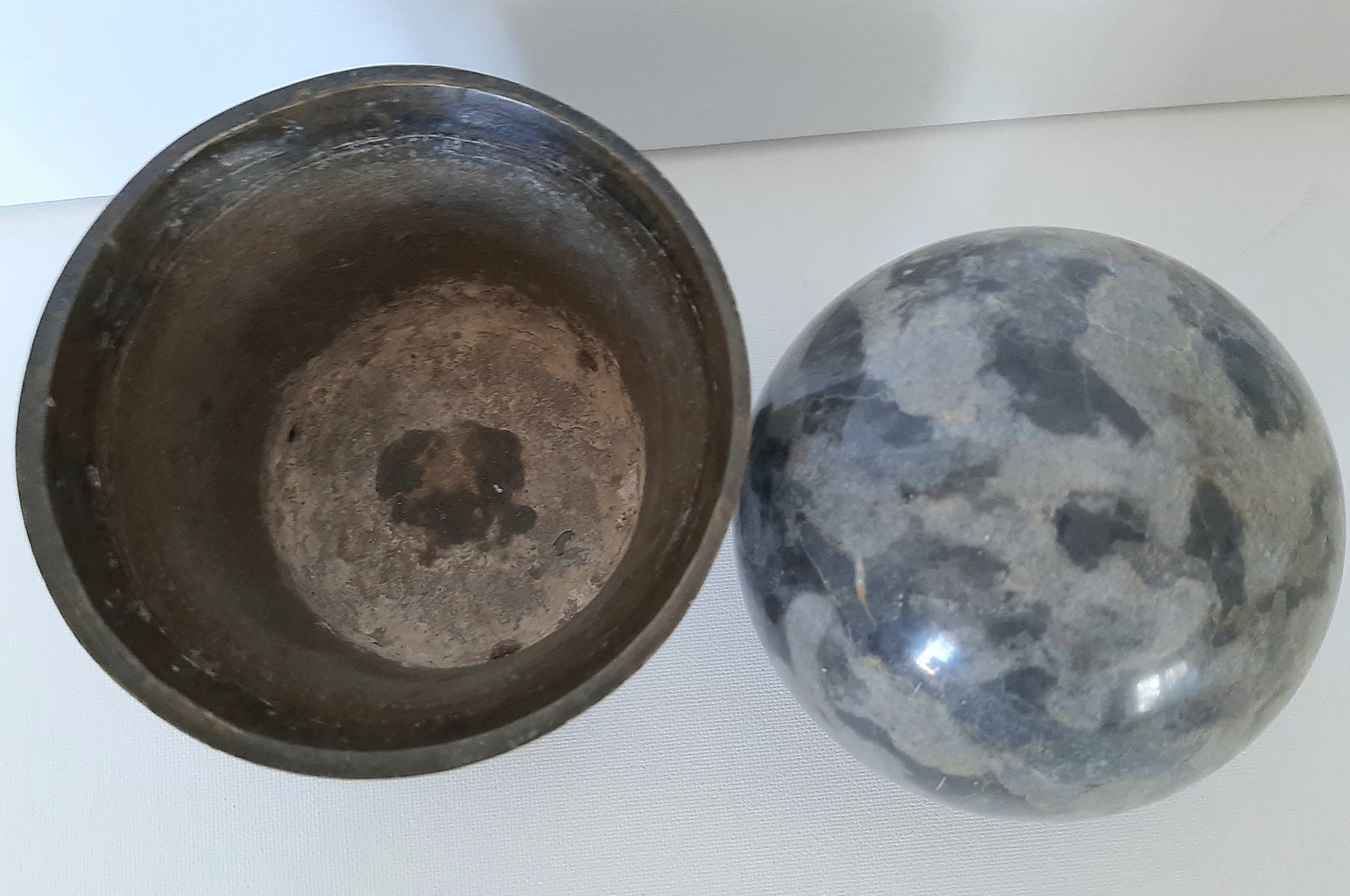 Bal diametr 10 cm gemaakt van echte steen ( ik denk marmer). Bronsen kom 9 cm hoog , 11 cm breed met drie voeten 2,5 cm hoog Gesigneerd achterkant.