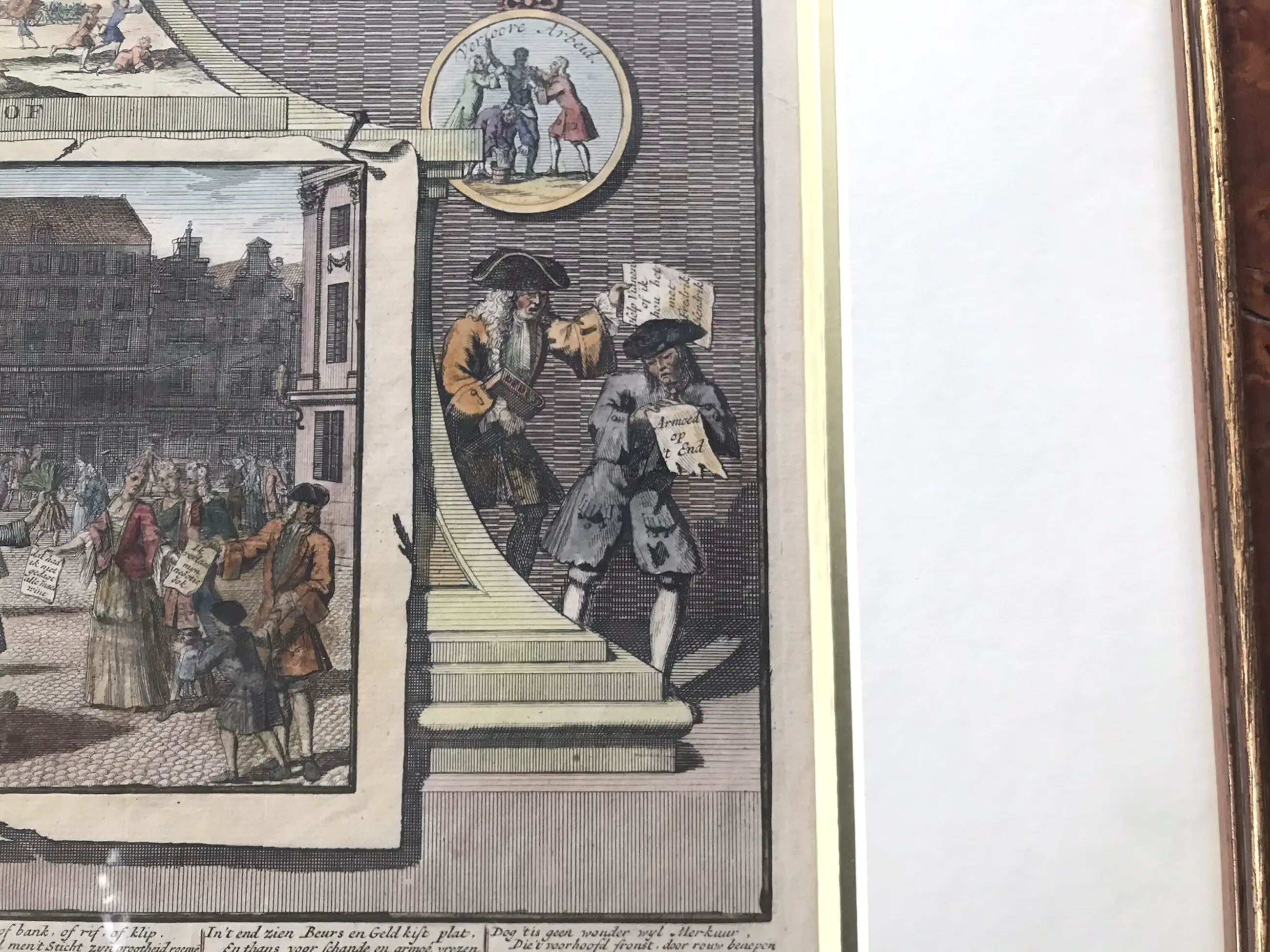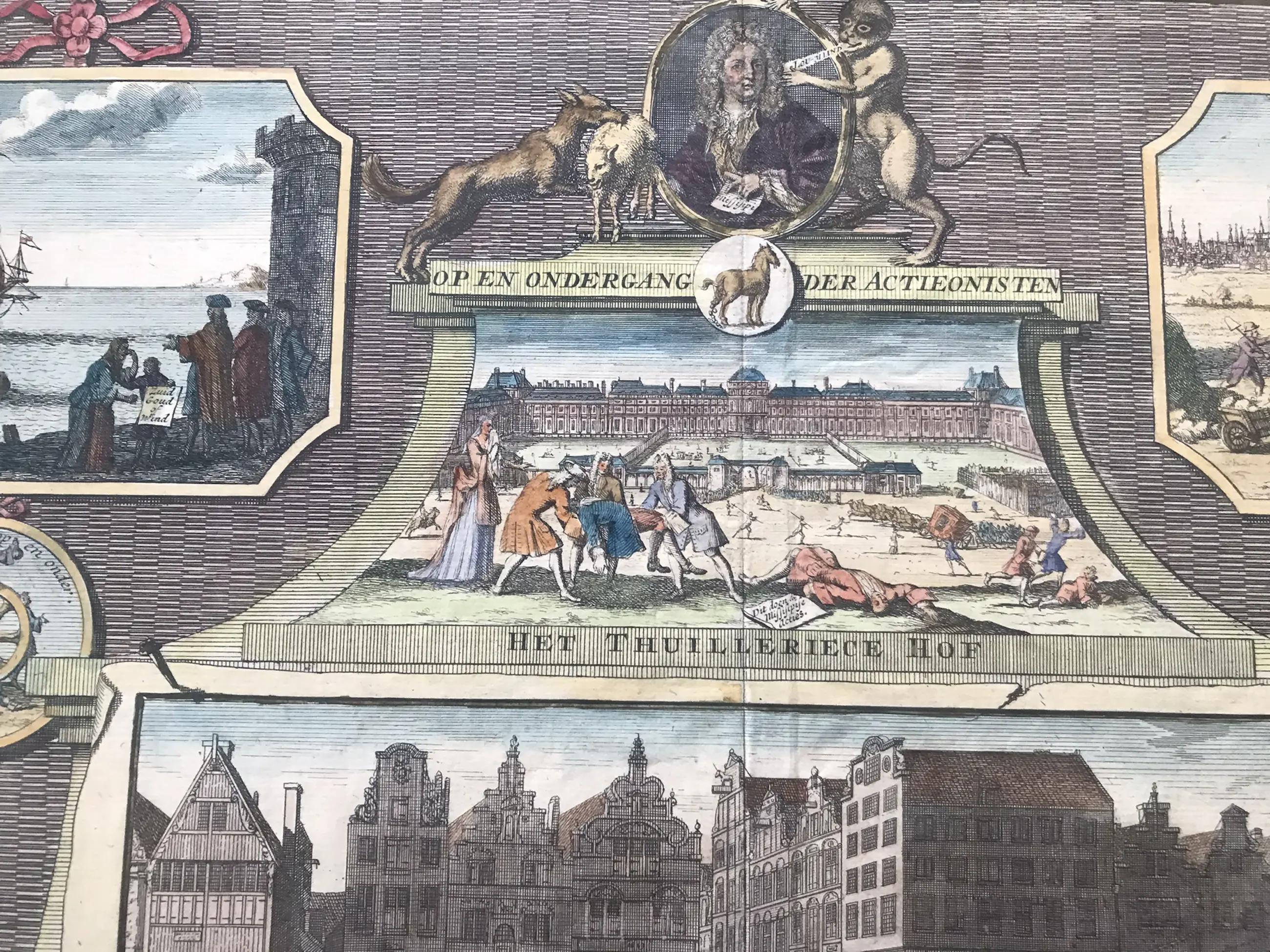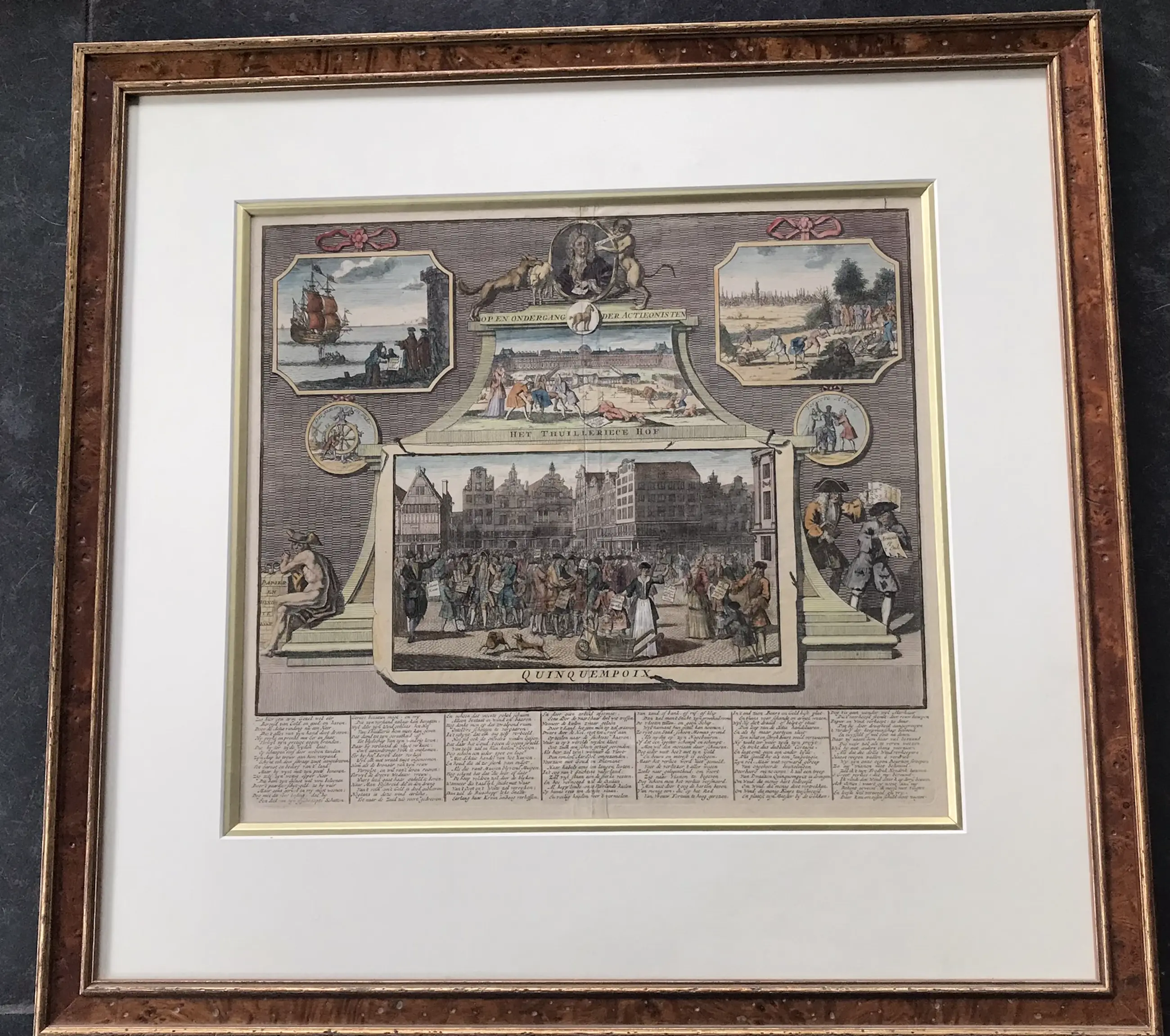Mooie ets afdruk, professioneel ingelijst met beschermd glas. Mooi ingekleurd. Ets dateert van 1720 met als onderwerp Op en Ondergang der actionisten, Het Thuilleriece hof