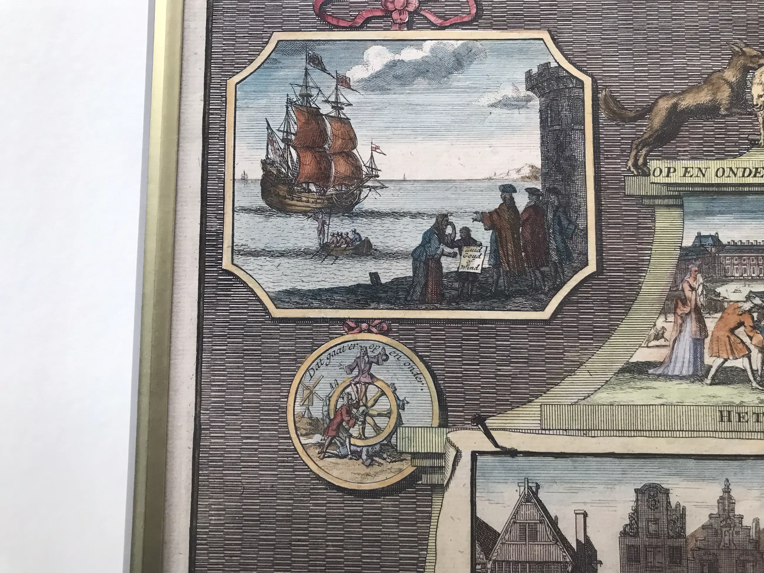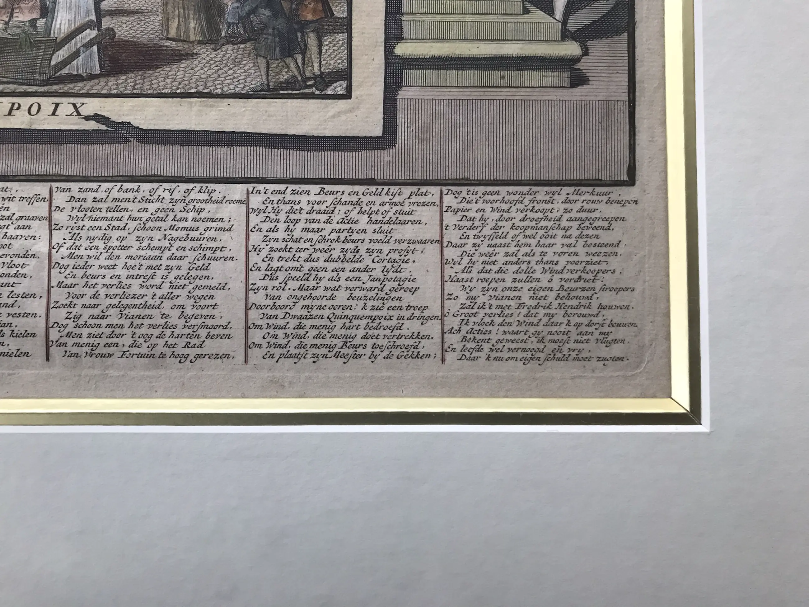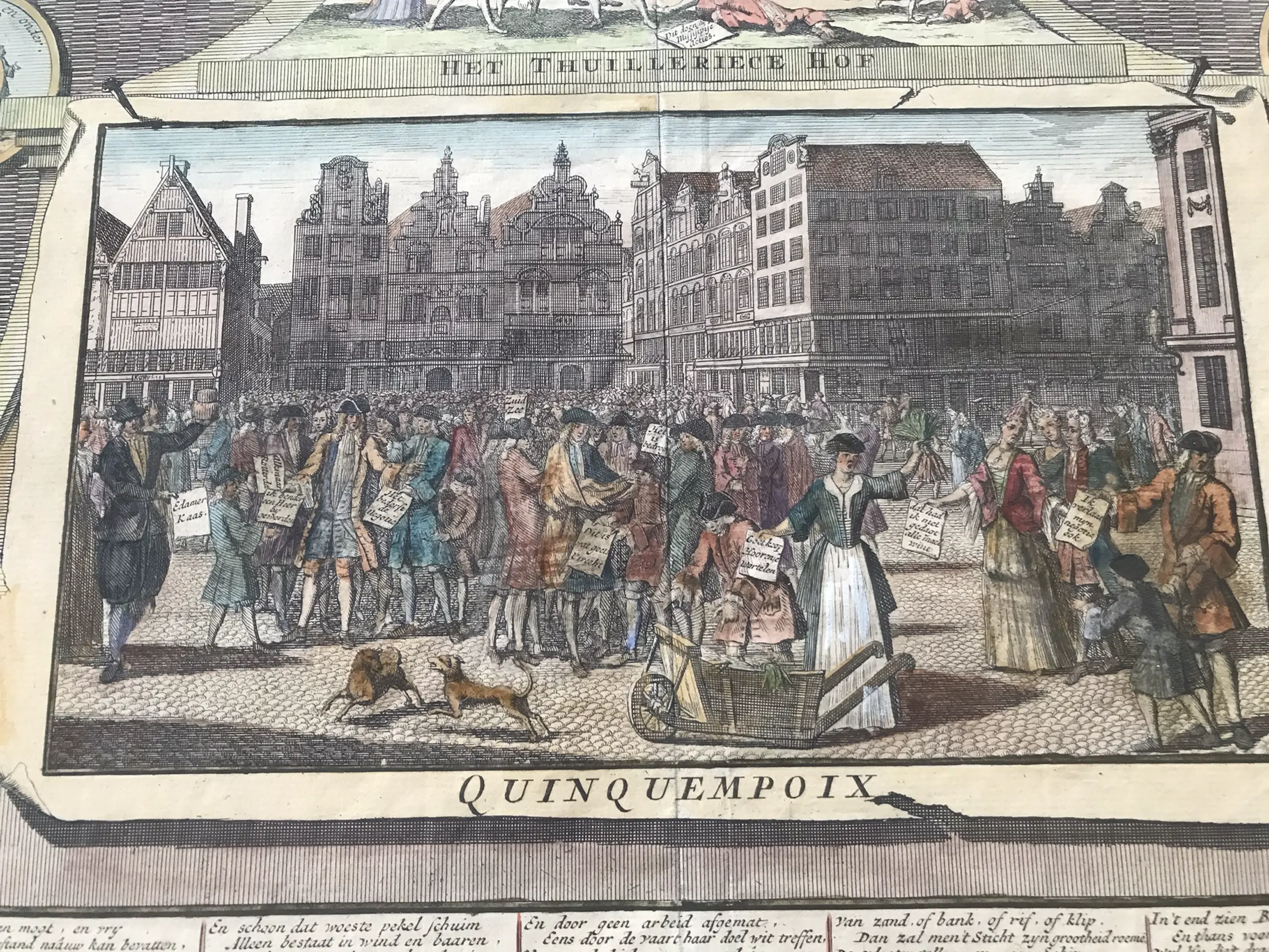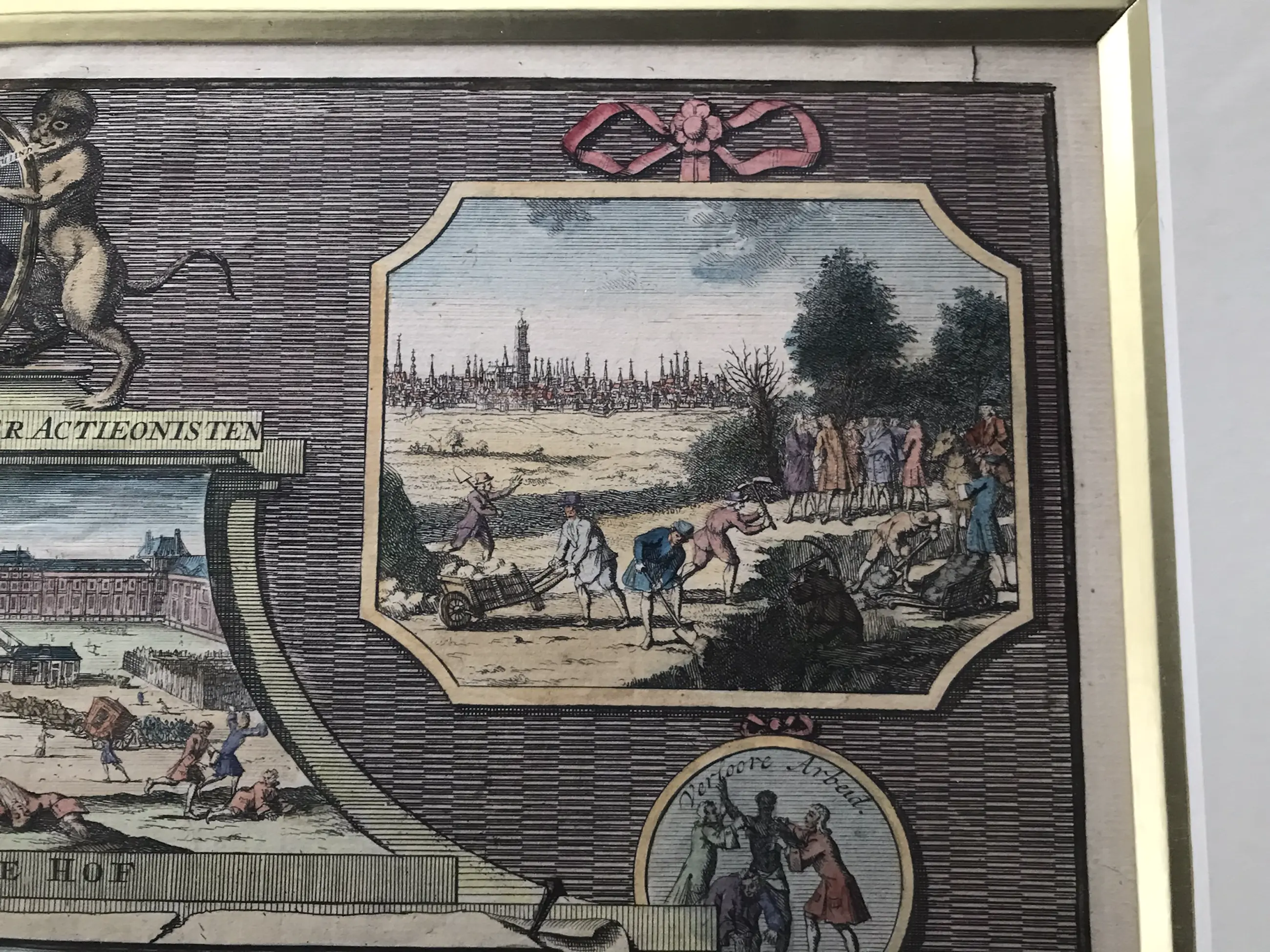Mooie ets afdruk, professioneel ingelijst met beschermd glas. Mooi ingekleurd. Ets dateert van 1720 met als onderwerp Op en Ondergang der actionisten, Het Thuilleriece hof