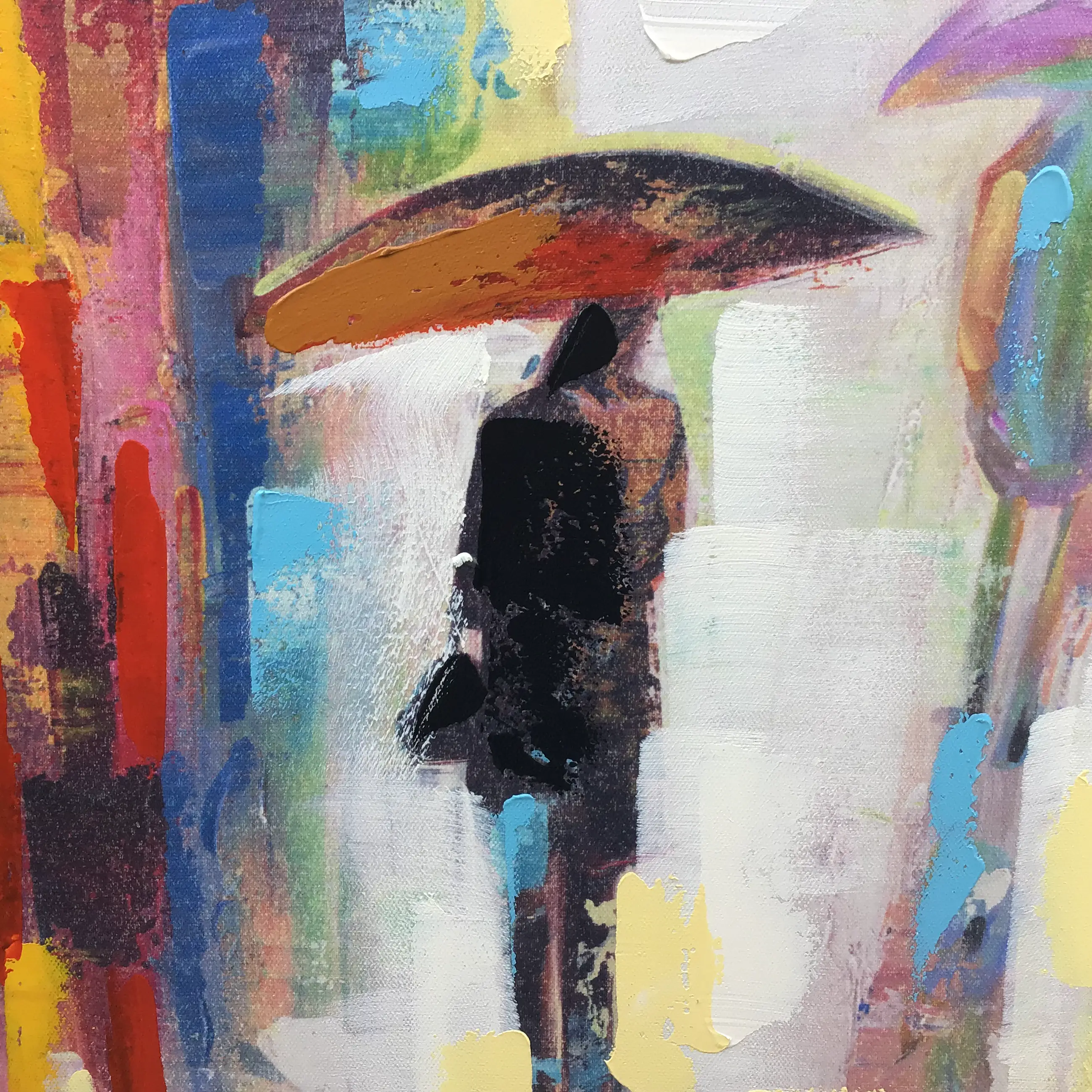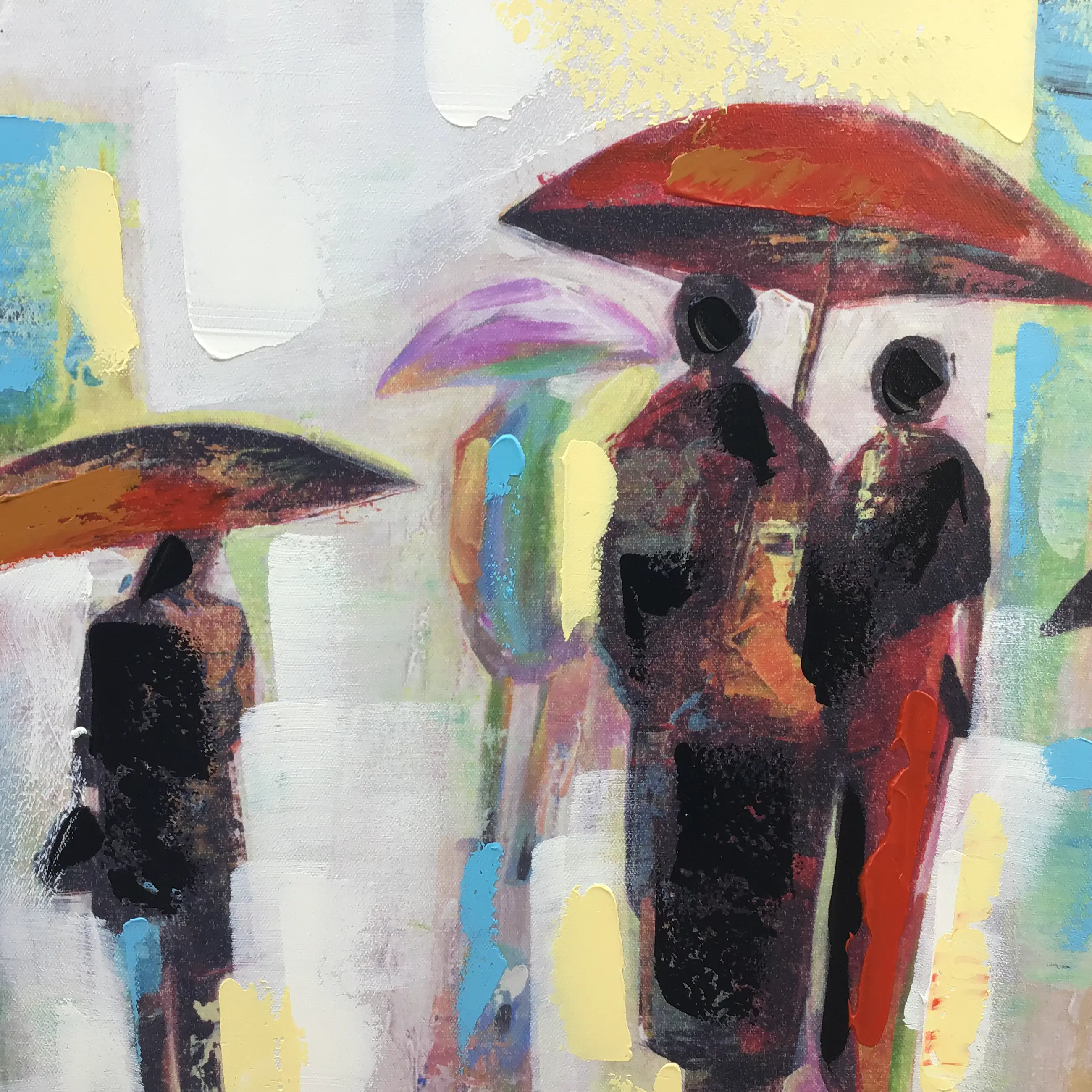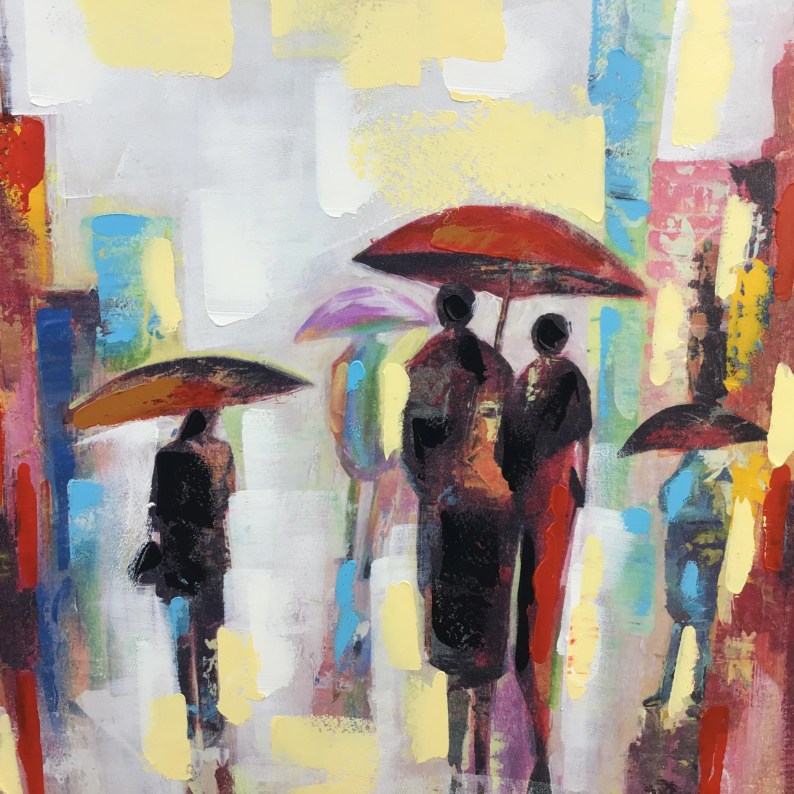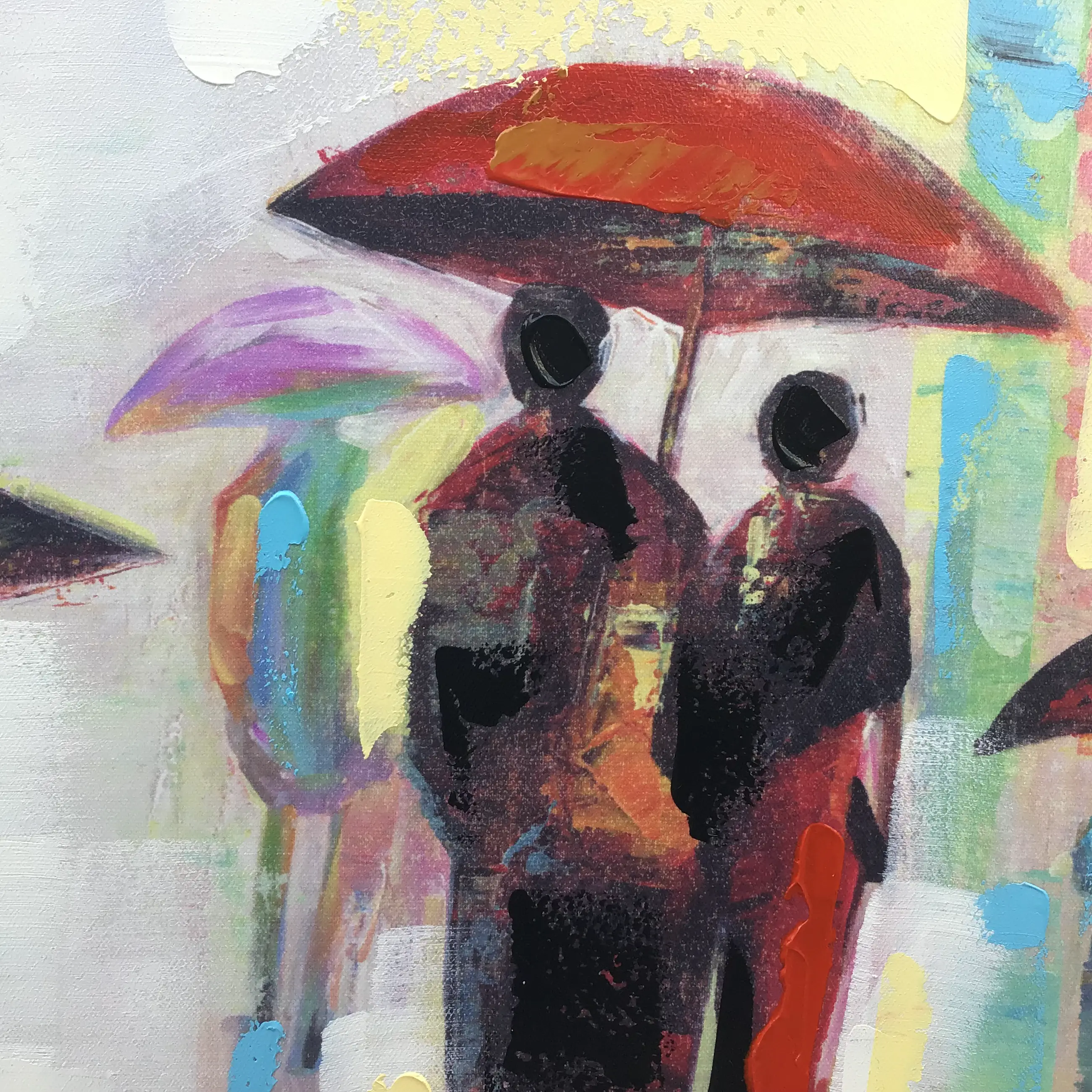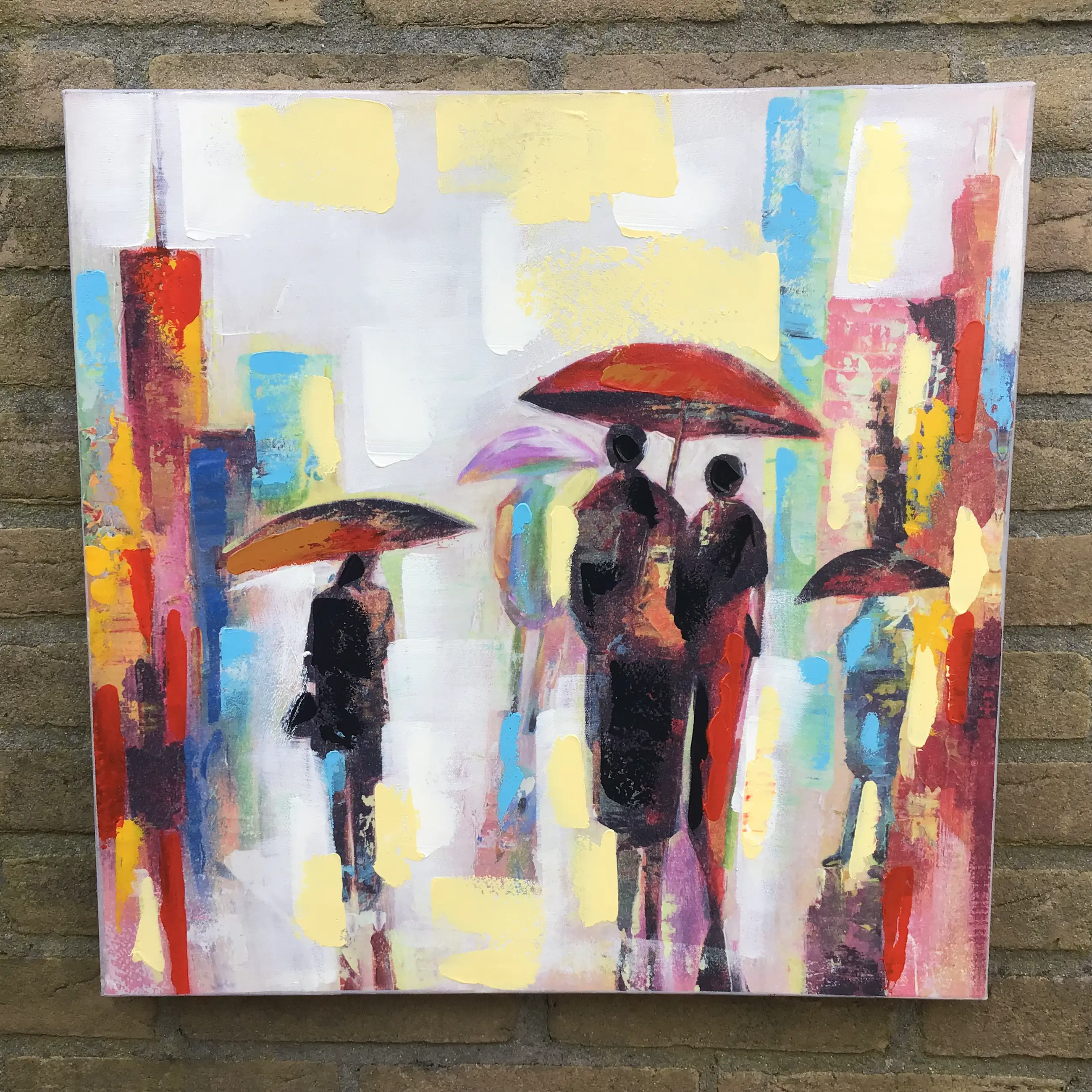 Gestileerde figuren die in een moderne stad lopen in de regen. Vlot geschilderd. Prima conditie.