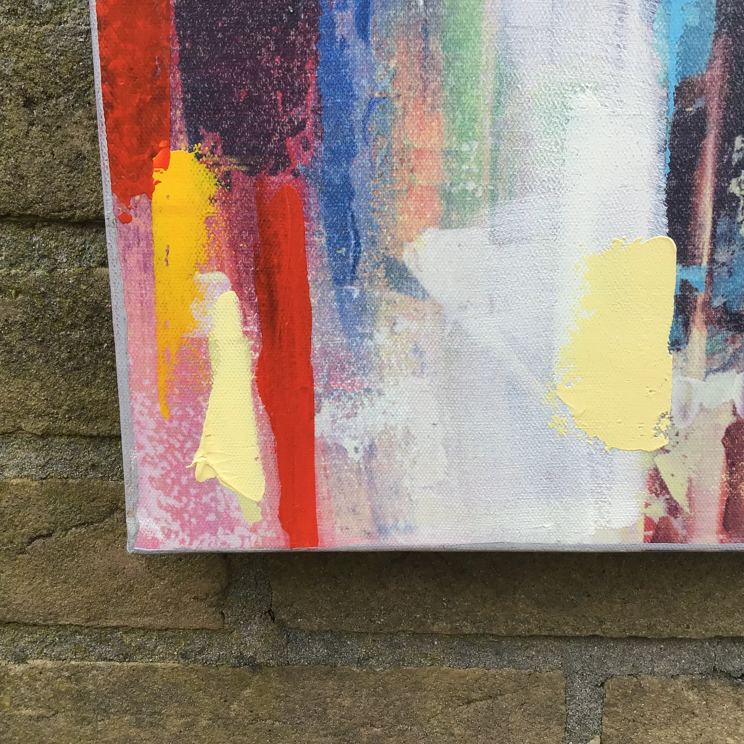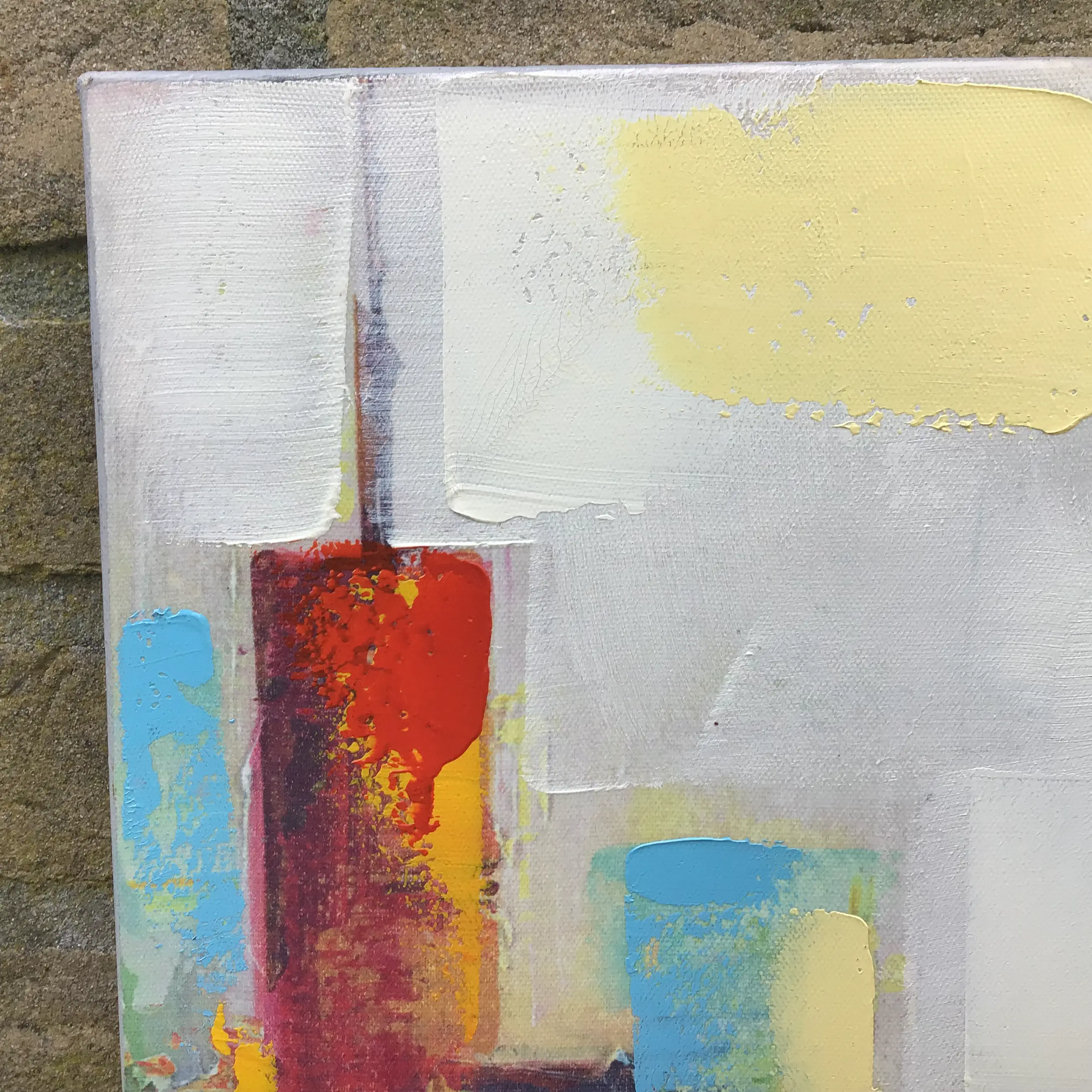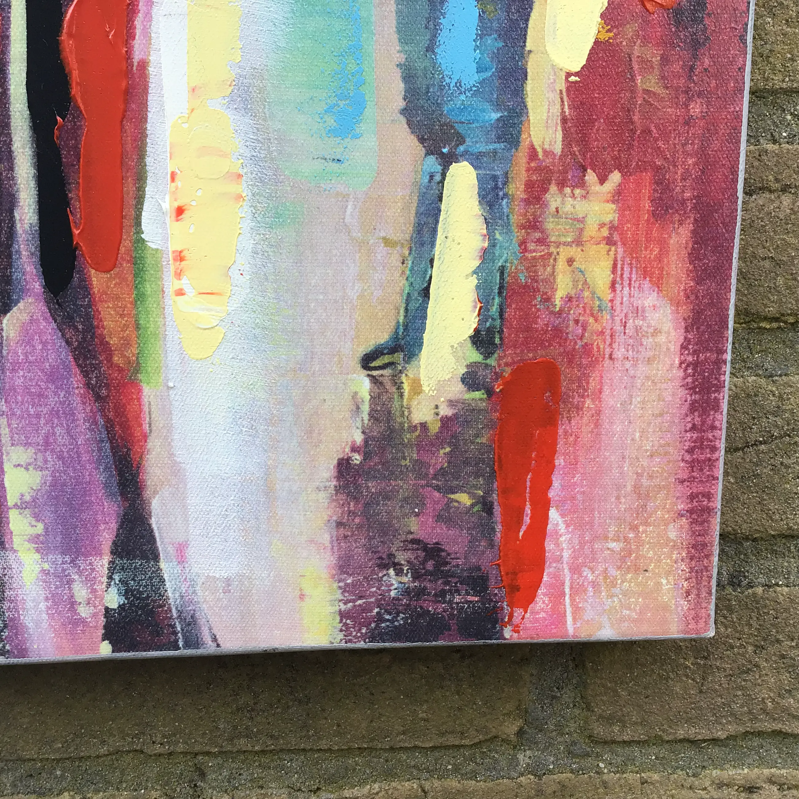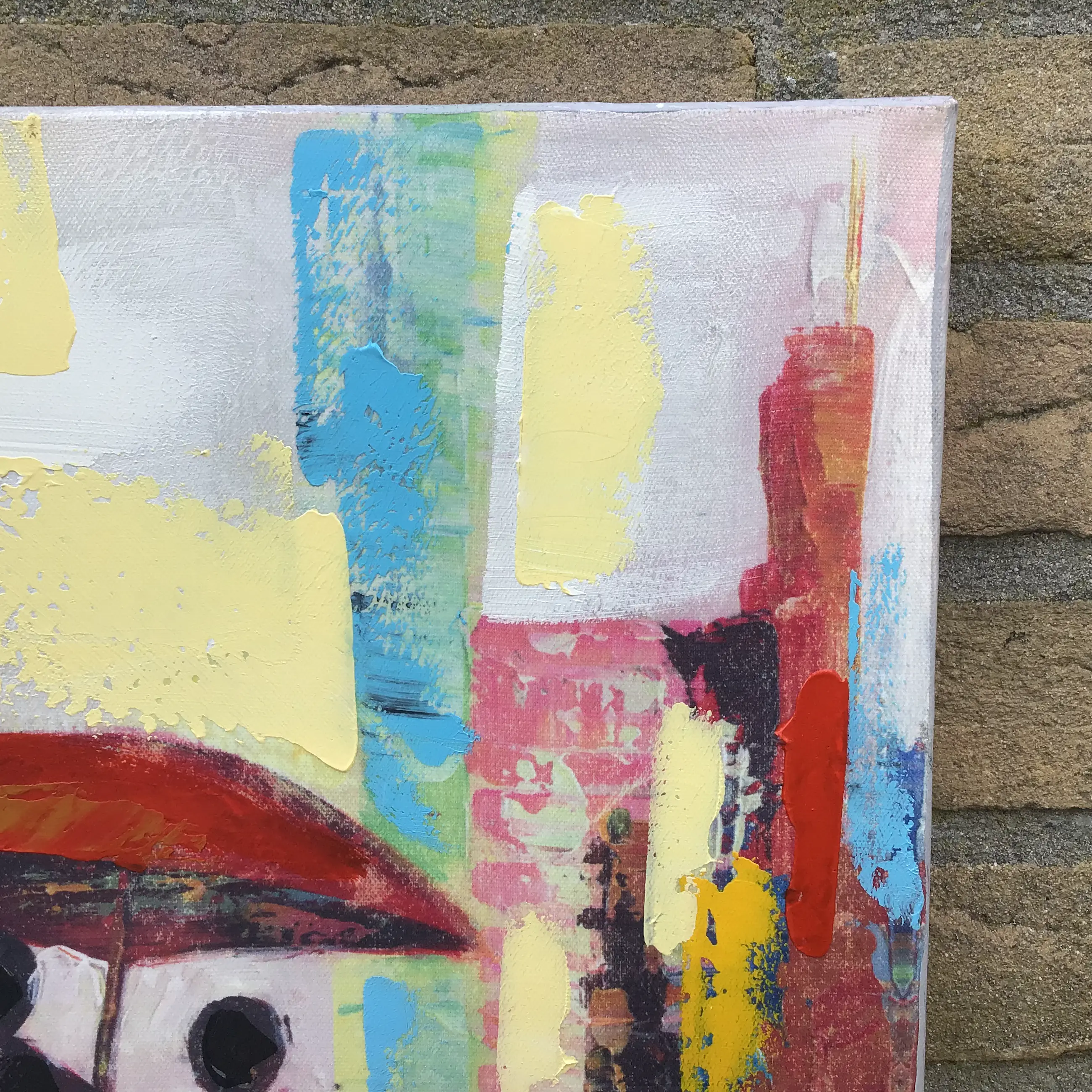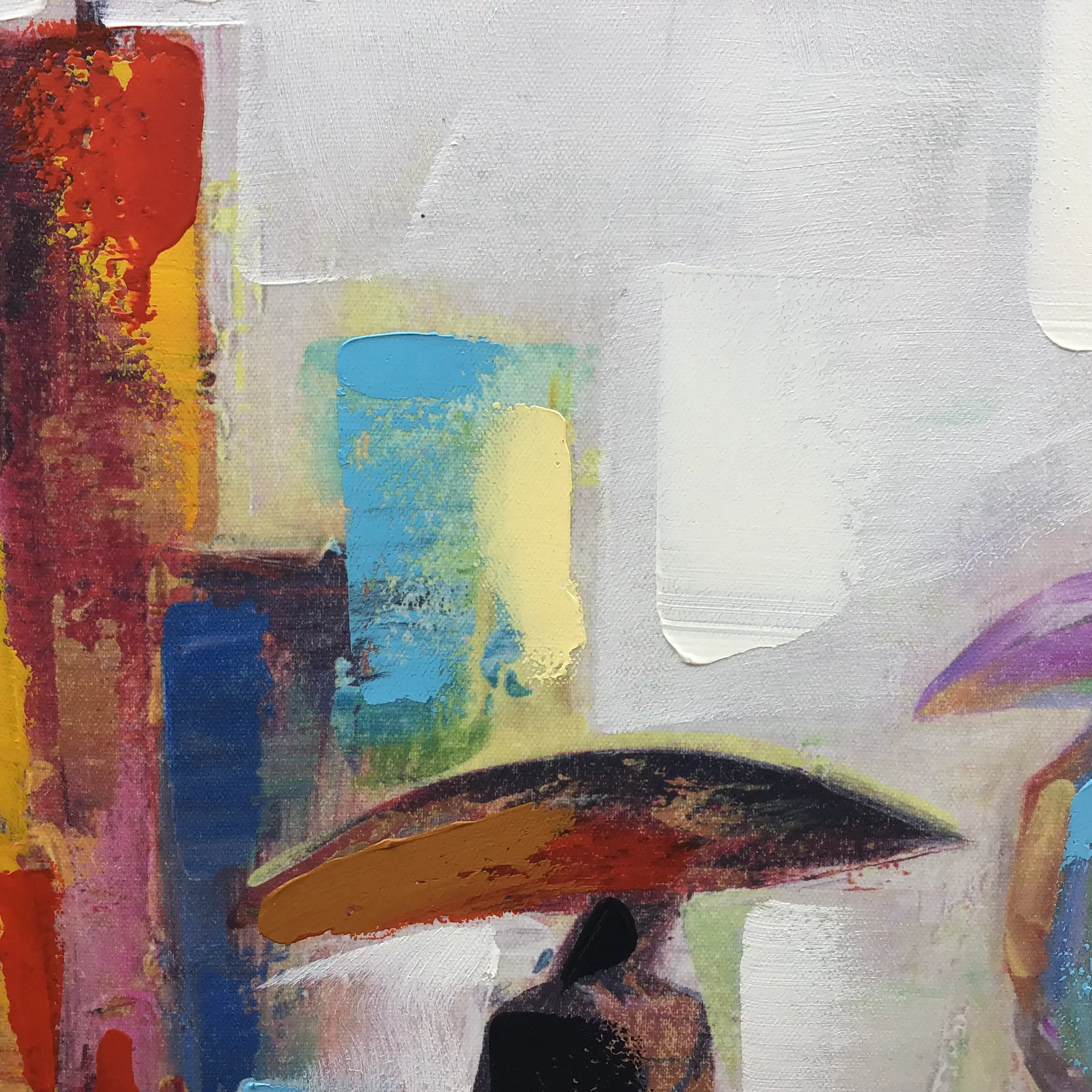 Gestileerde figuren die in een moderne stad lopen in de regen. Vlot geschilderd. Prima conditie.