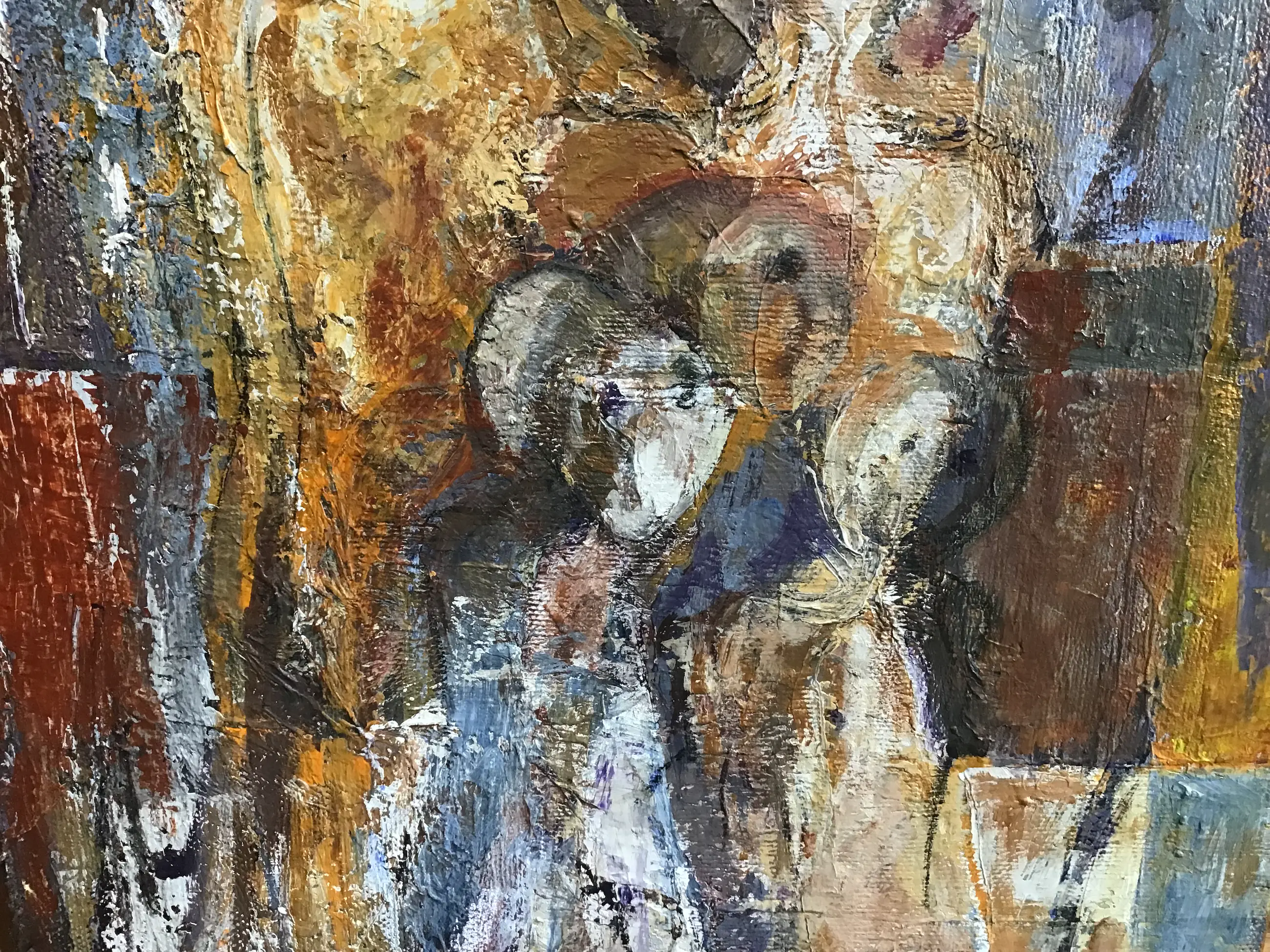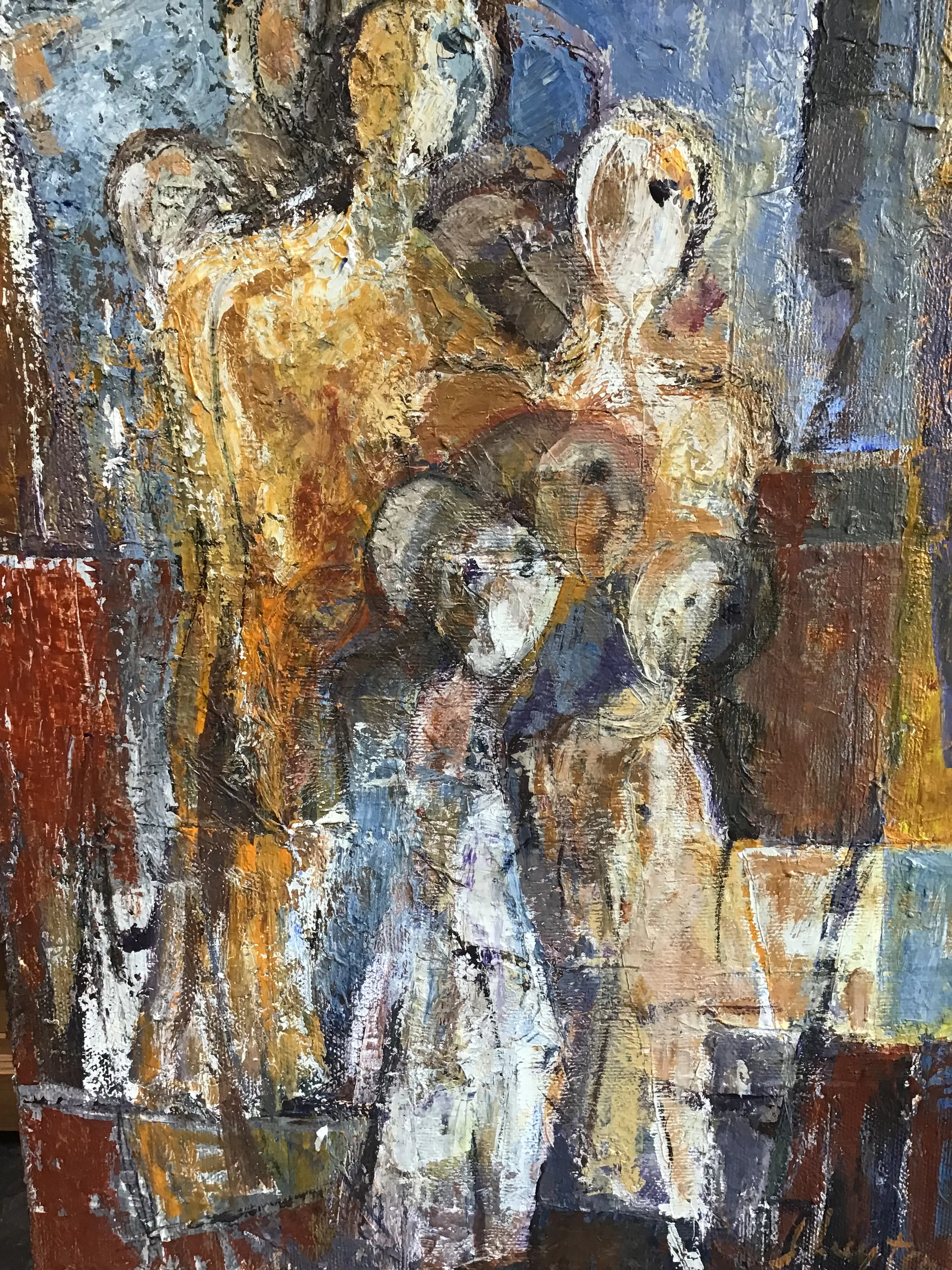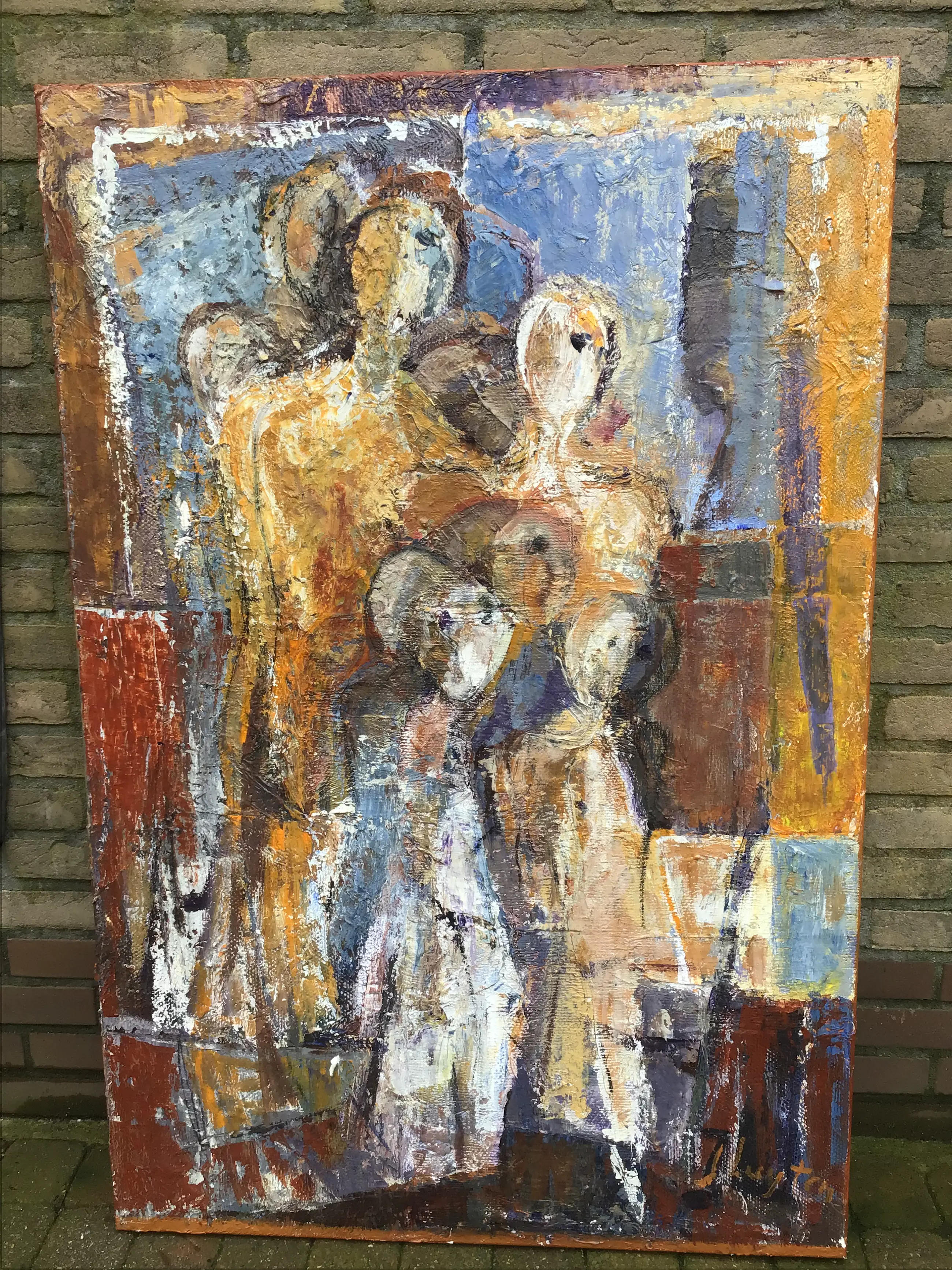 Groot expressief werk. Bijna abstract maar er is toch duidelijk een groep mensen herkenbaar. Grof en met veel verf geschilderd.