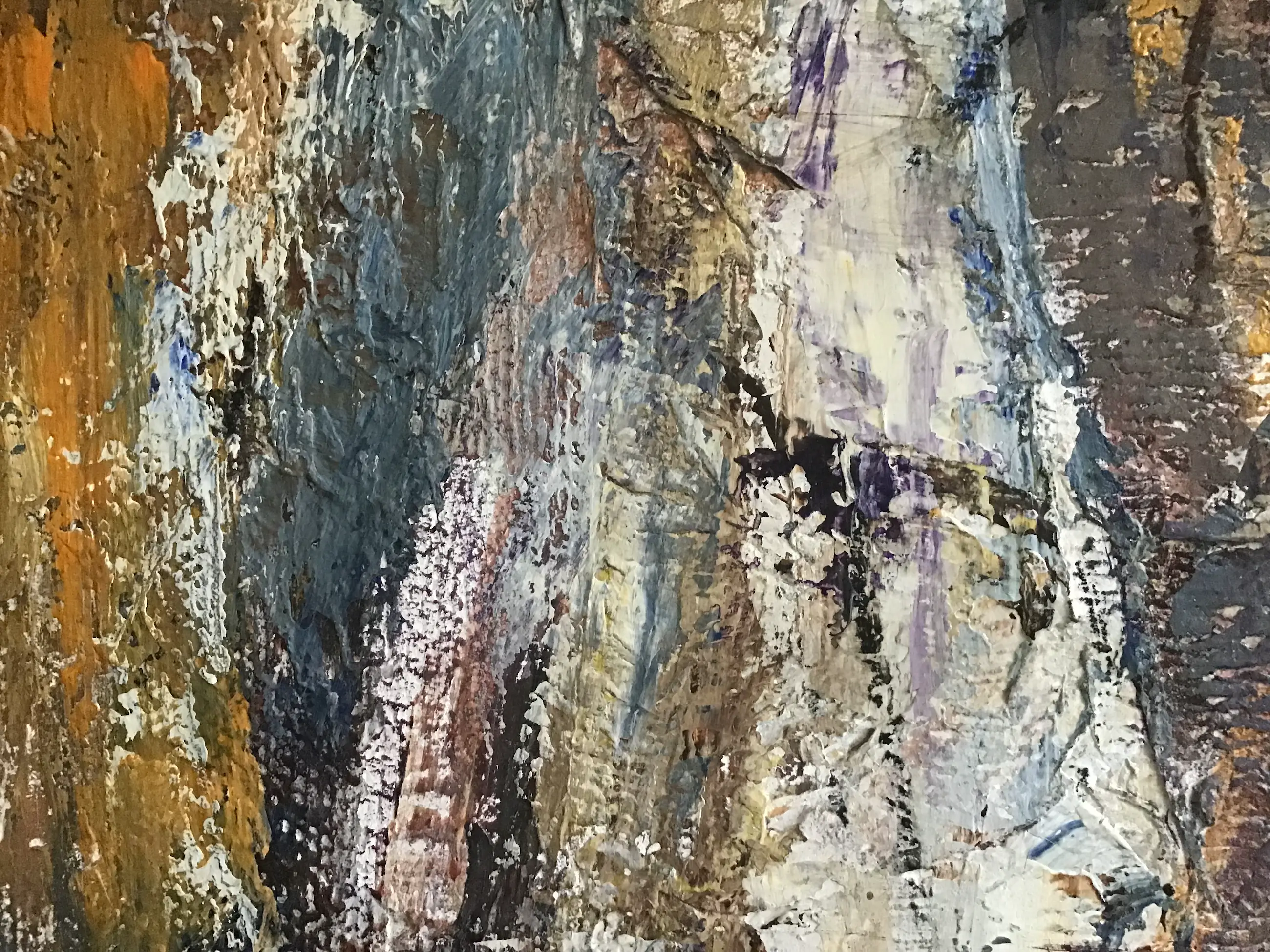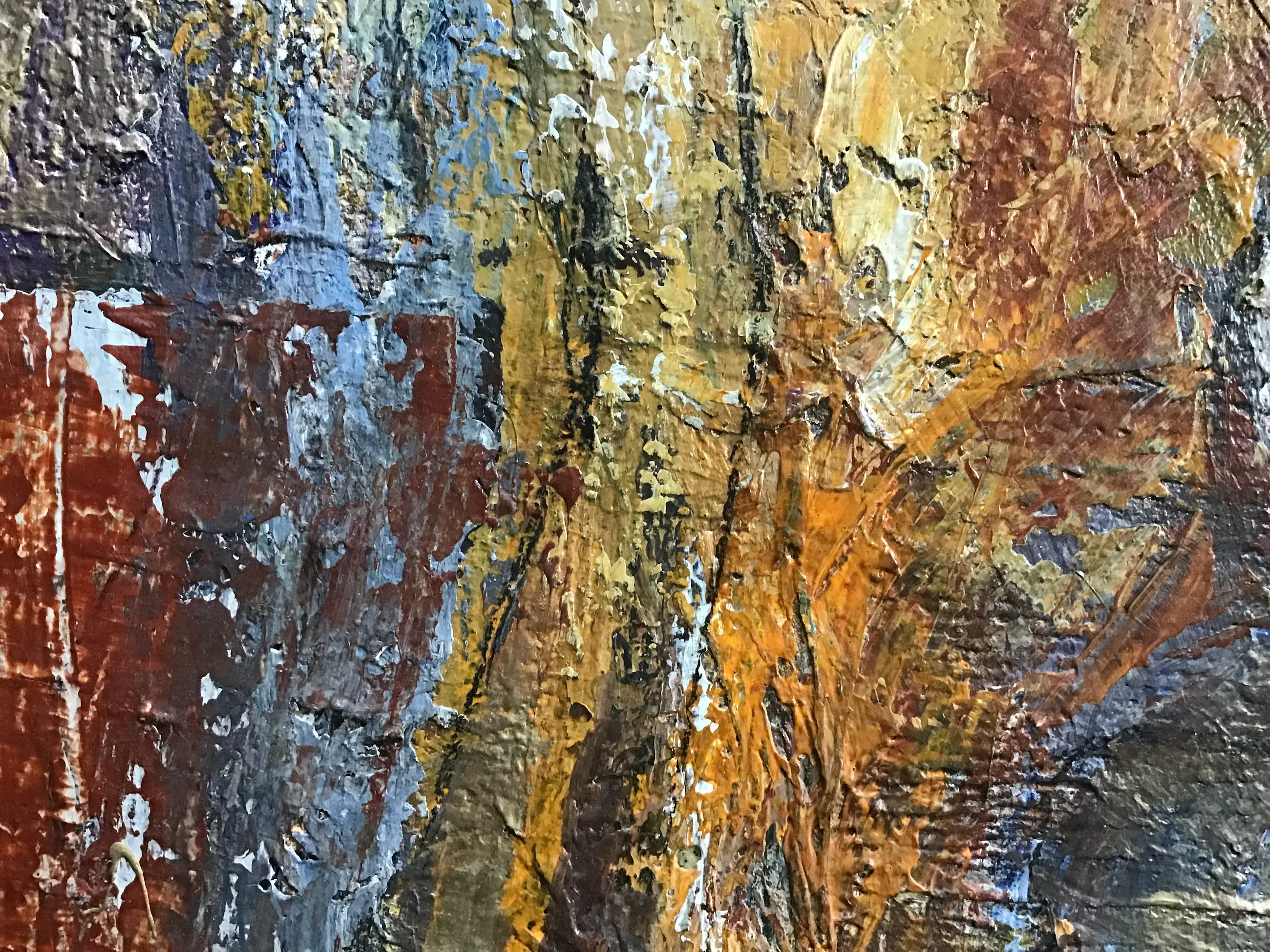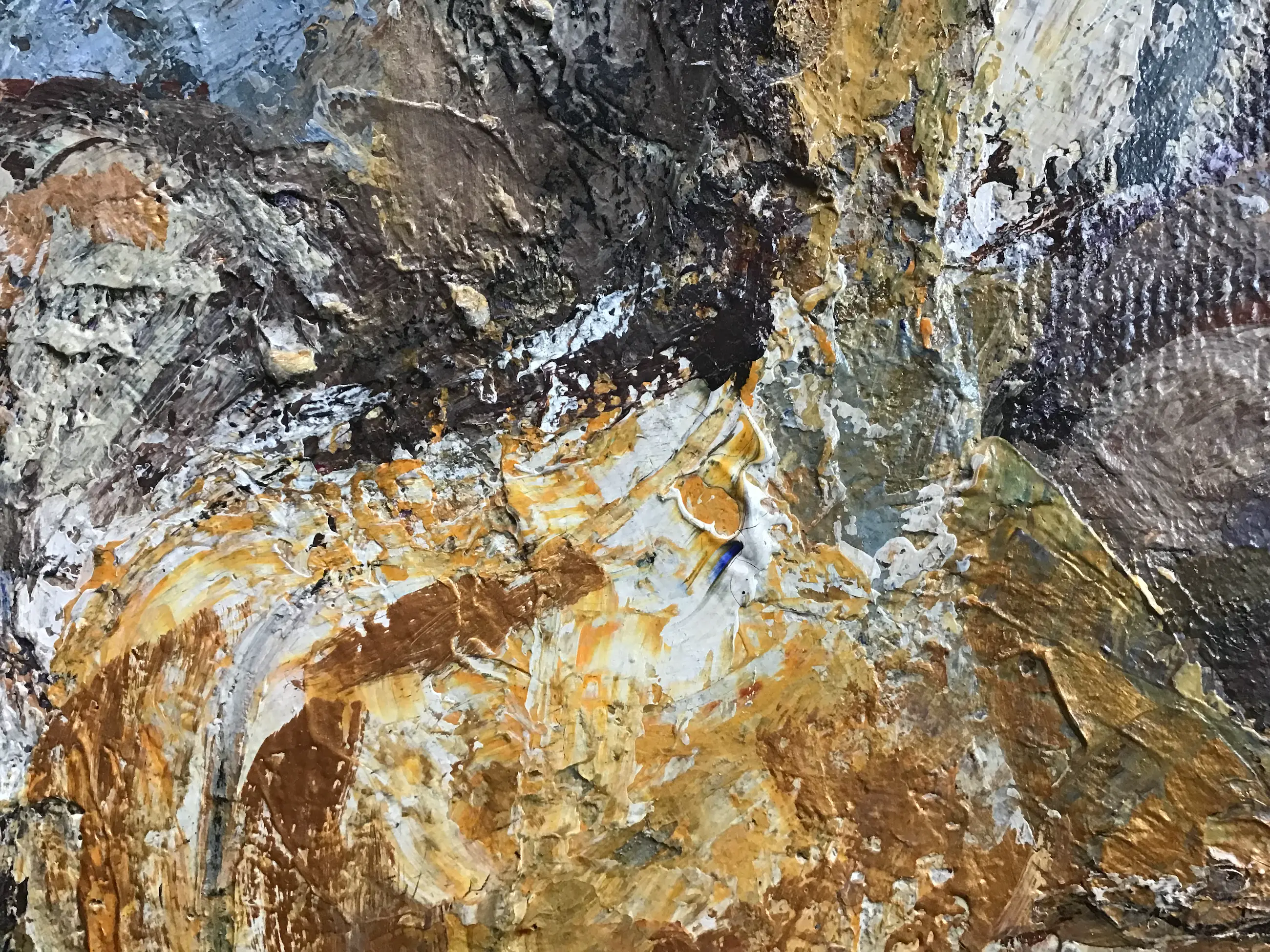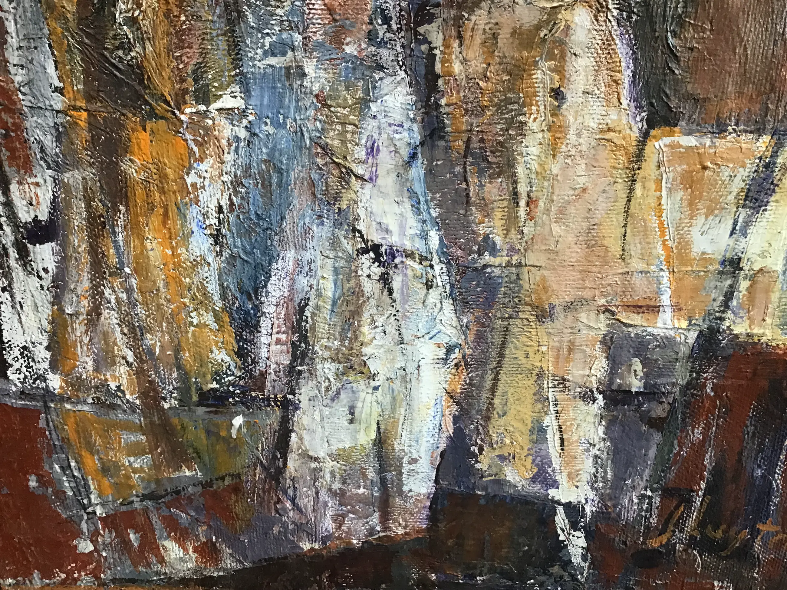 Groot expressief werk. Bijna abstract maar er is toch duidelijk een groep mensen herkenbaar. Grof en met veel verf geschilderd.