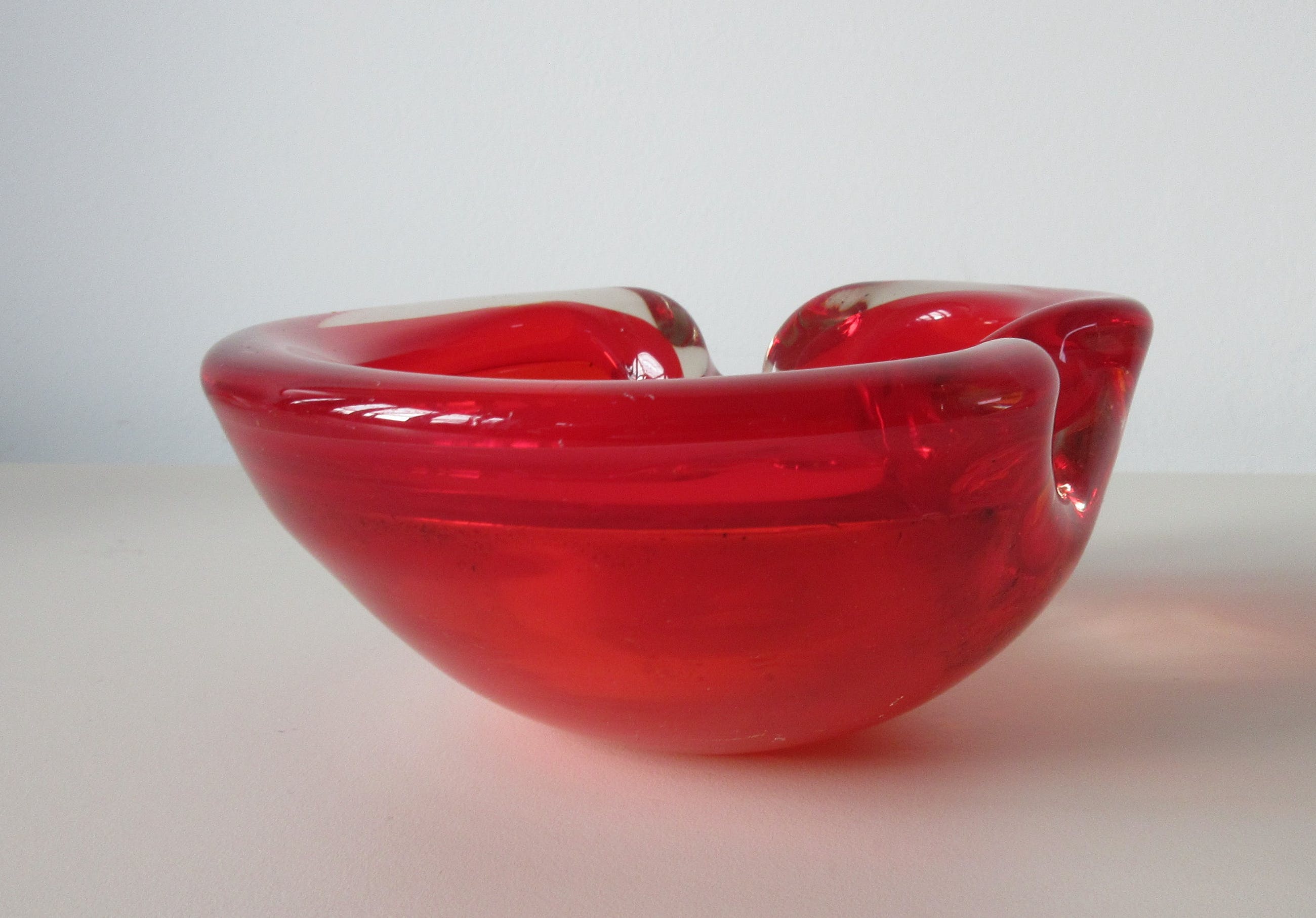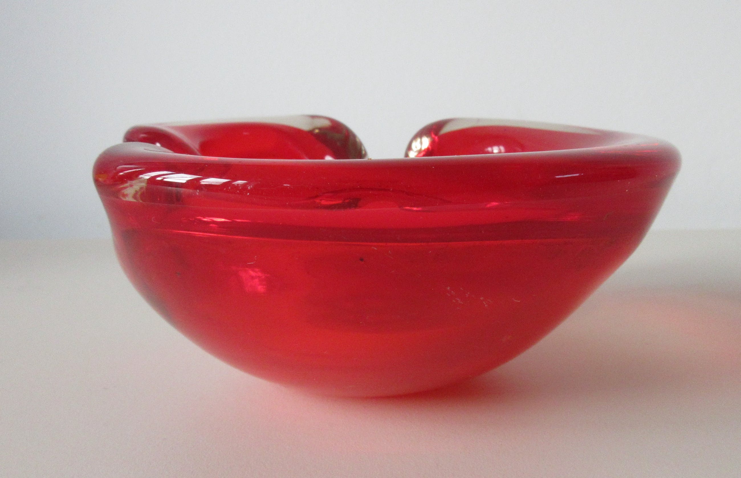 Oranje rode dikwandige vintage Murano glazen asbak. In prima gebruikte conditie, geen schades uitgezonderd wat gebruikskrasjes nog wel wat vuil. Ongemerkt.