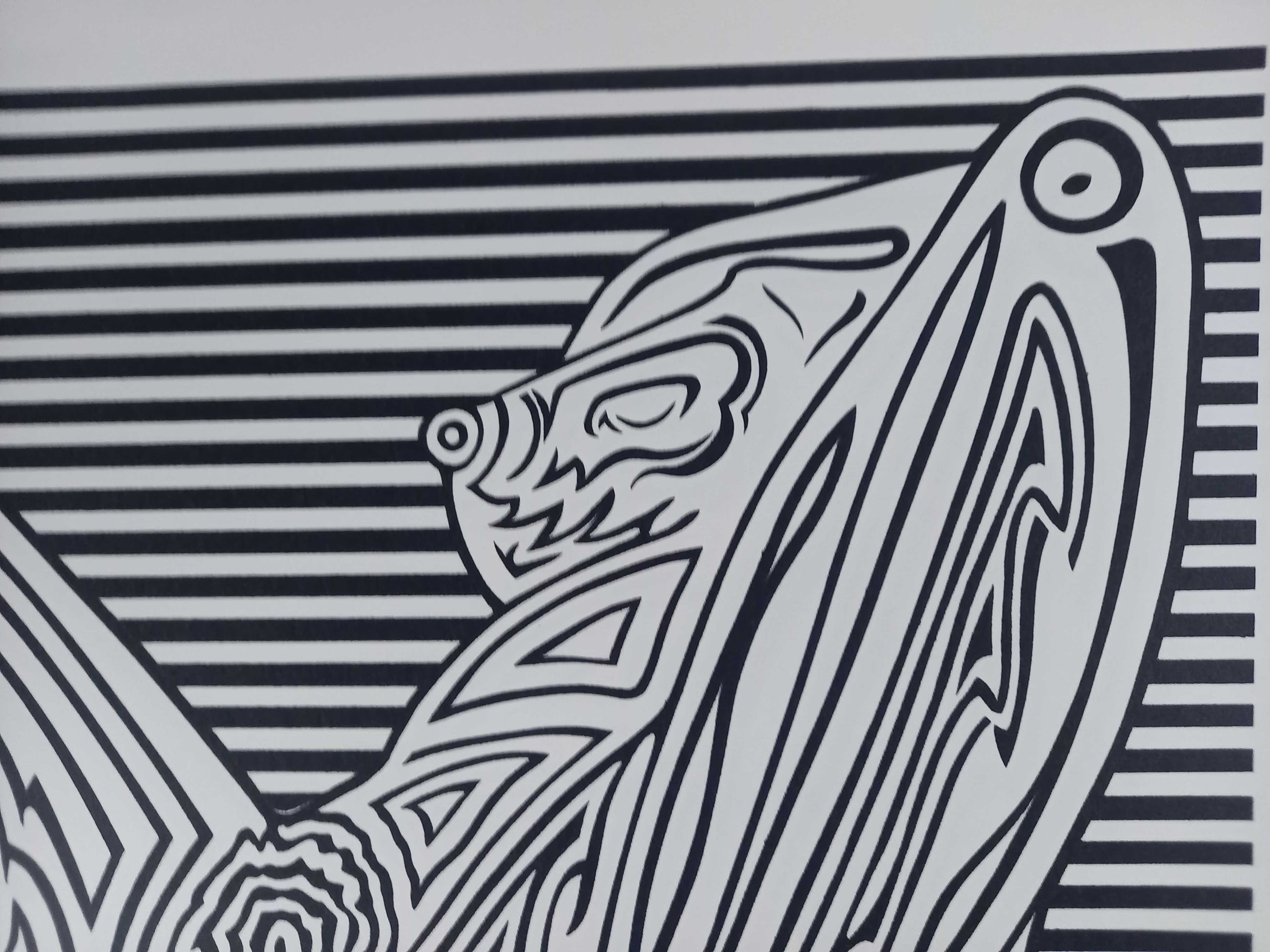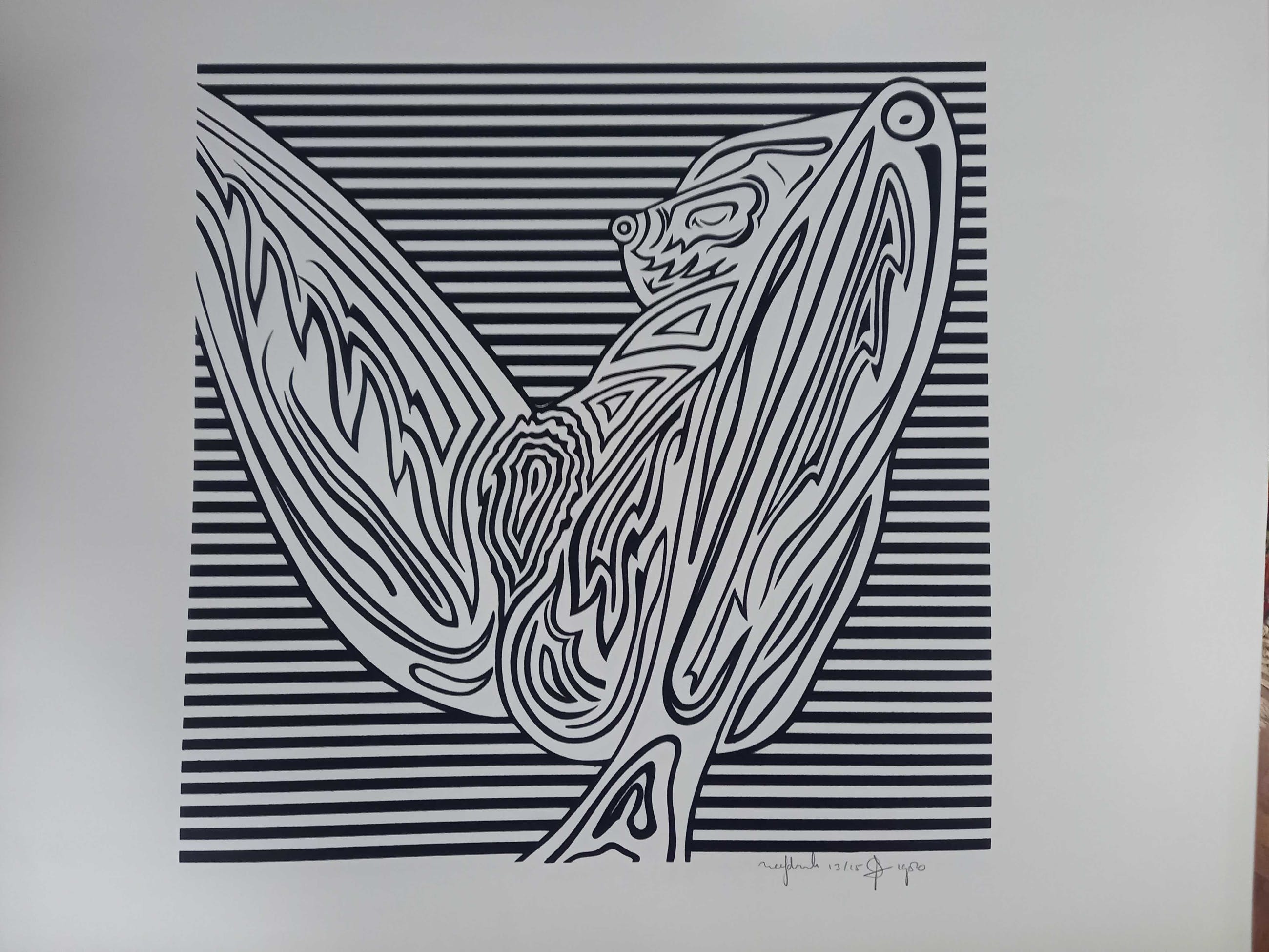 Erotische voorstelling van een dame. De afbeelding zelf is 38 bij 38 cm. Op-art achtige afbeelding in zwart wit