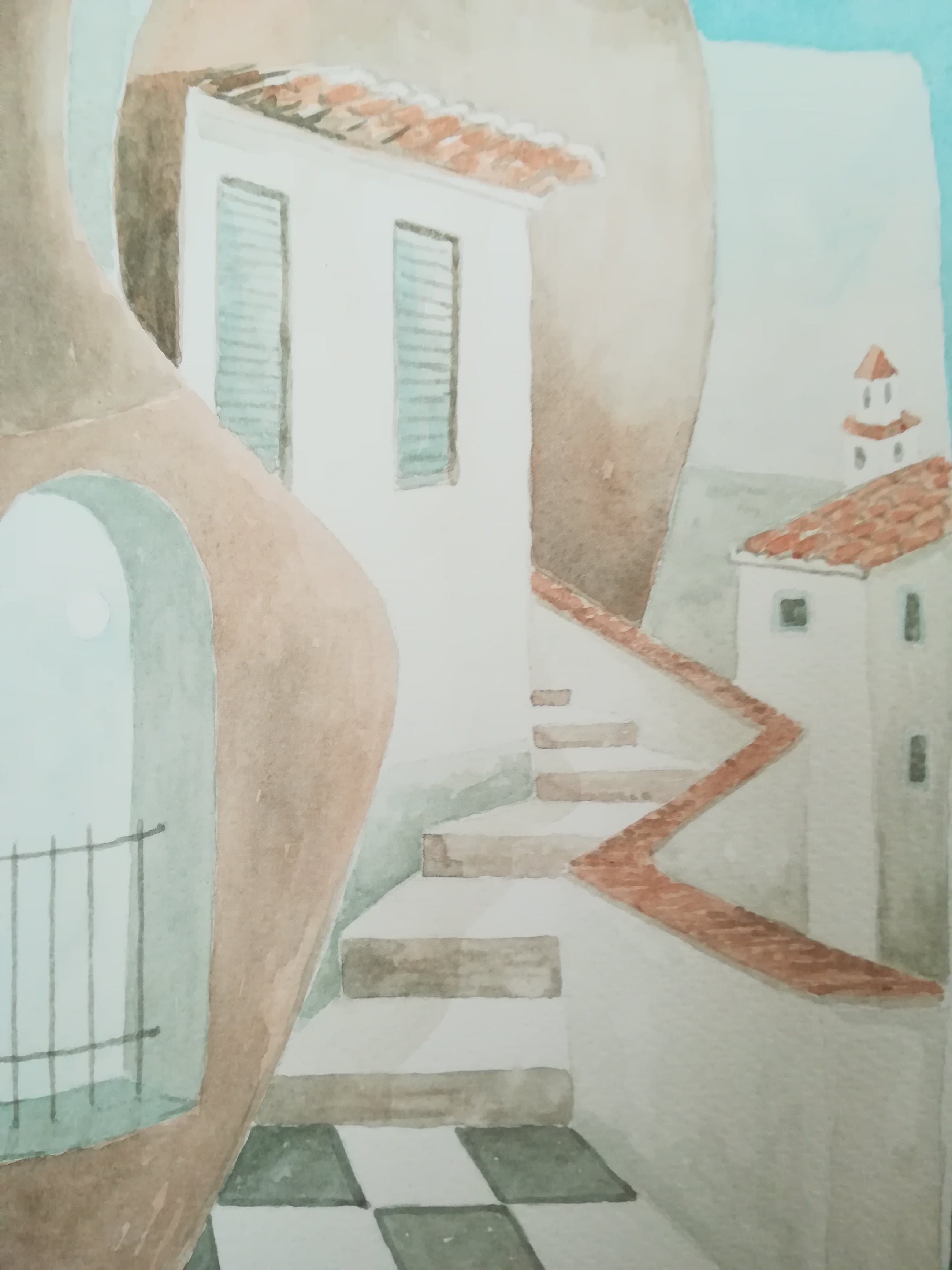 De kunstenaar Kirsch -rechtsonder gesigneerd- biedt ons een impressie van een Zuid-Europees dorpje, geflankeerd door grote kruiken.