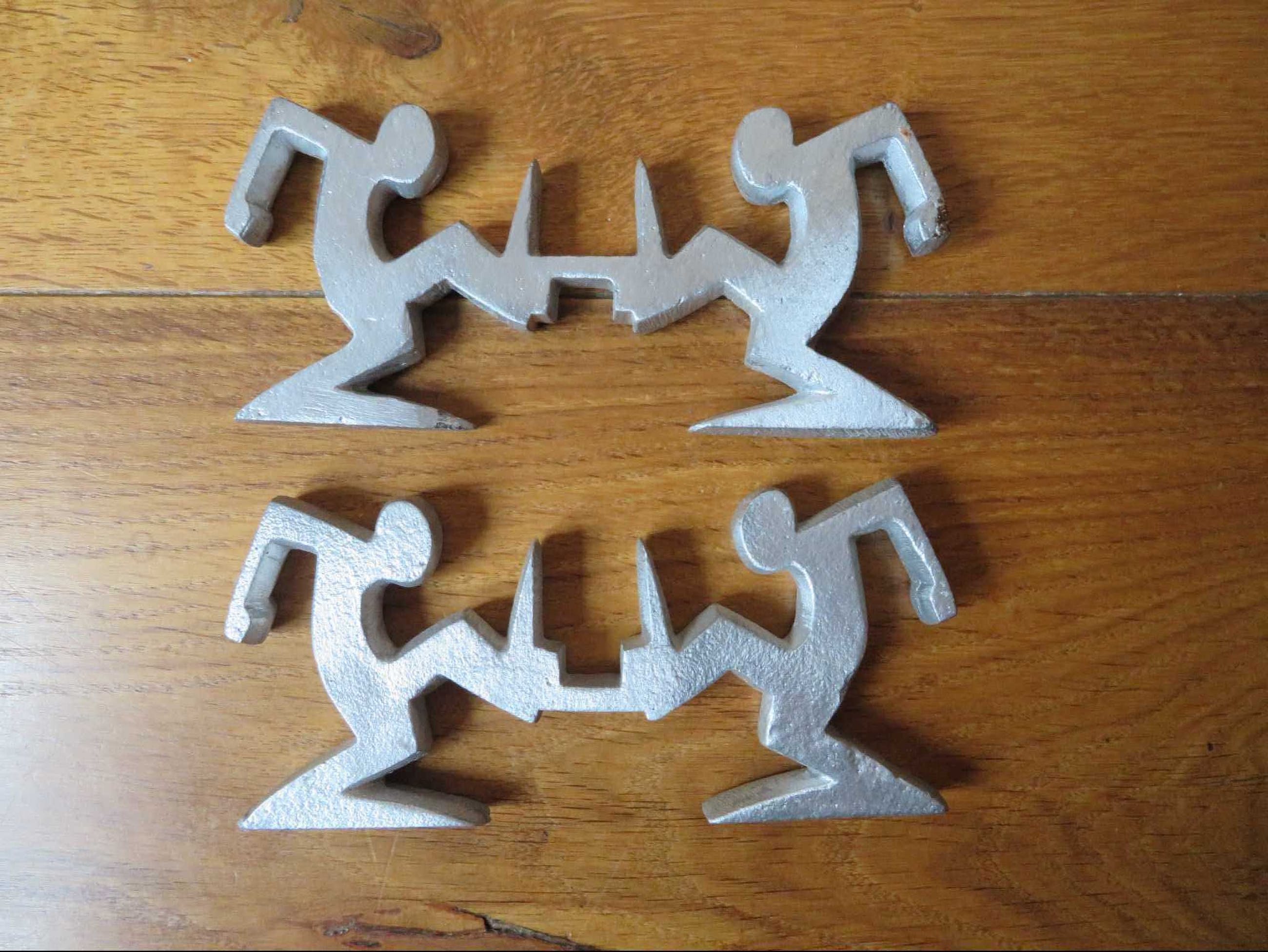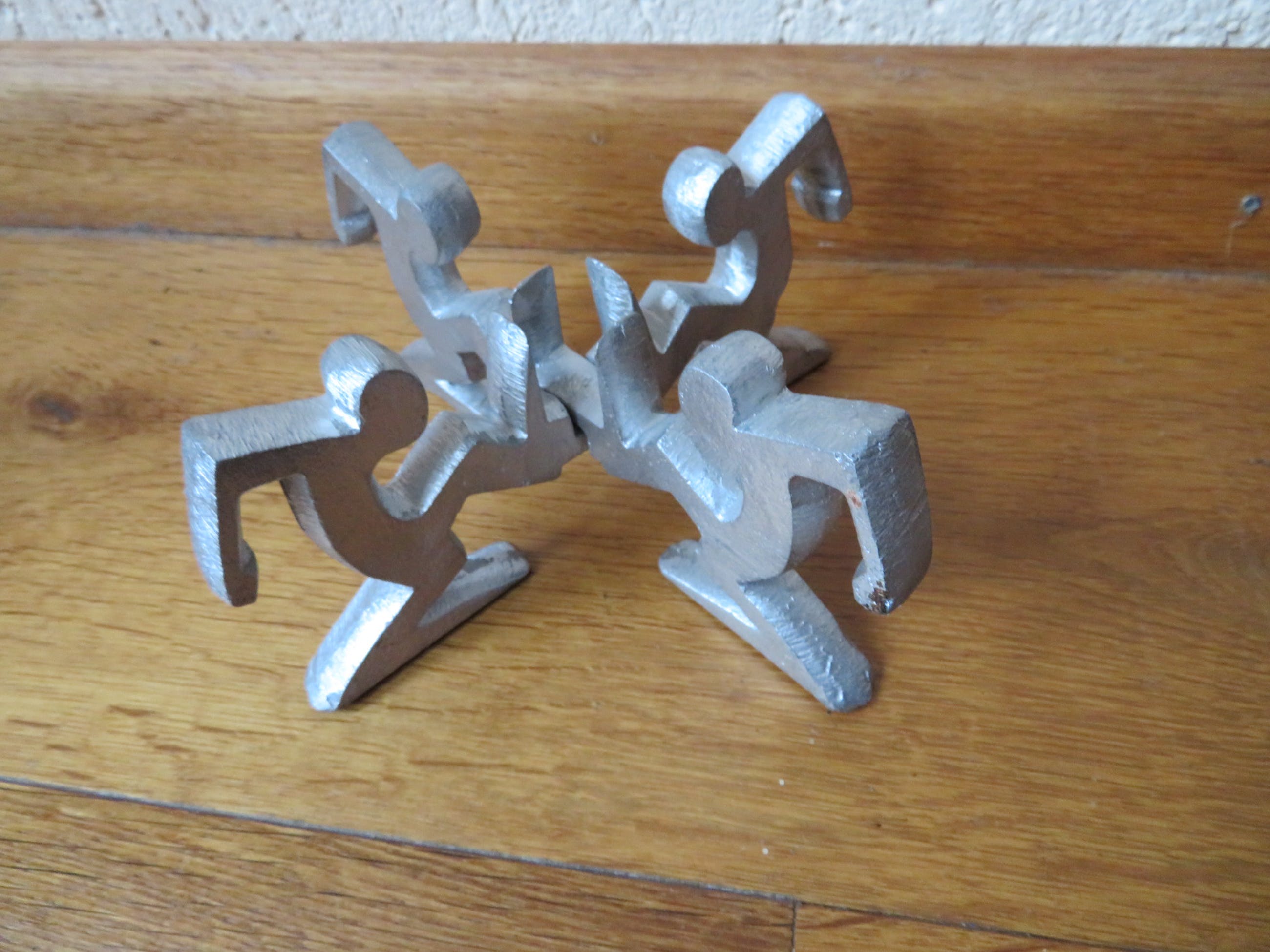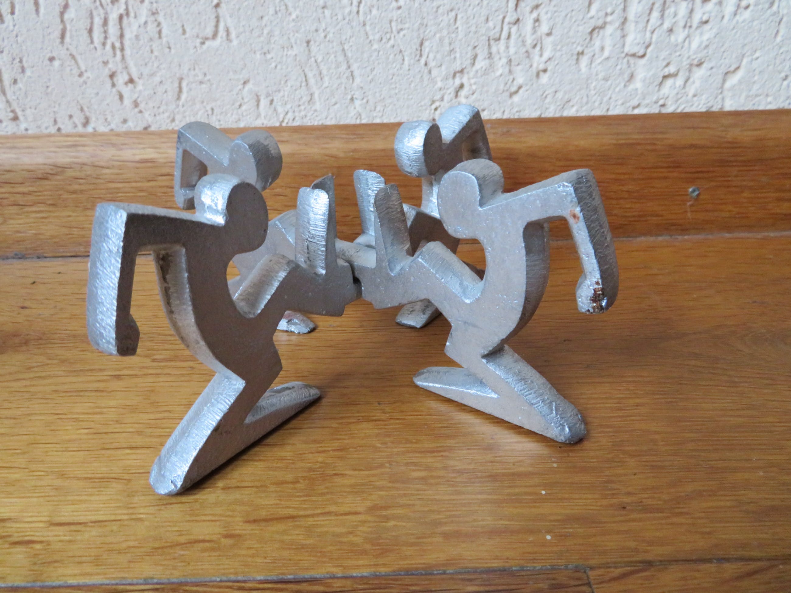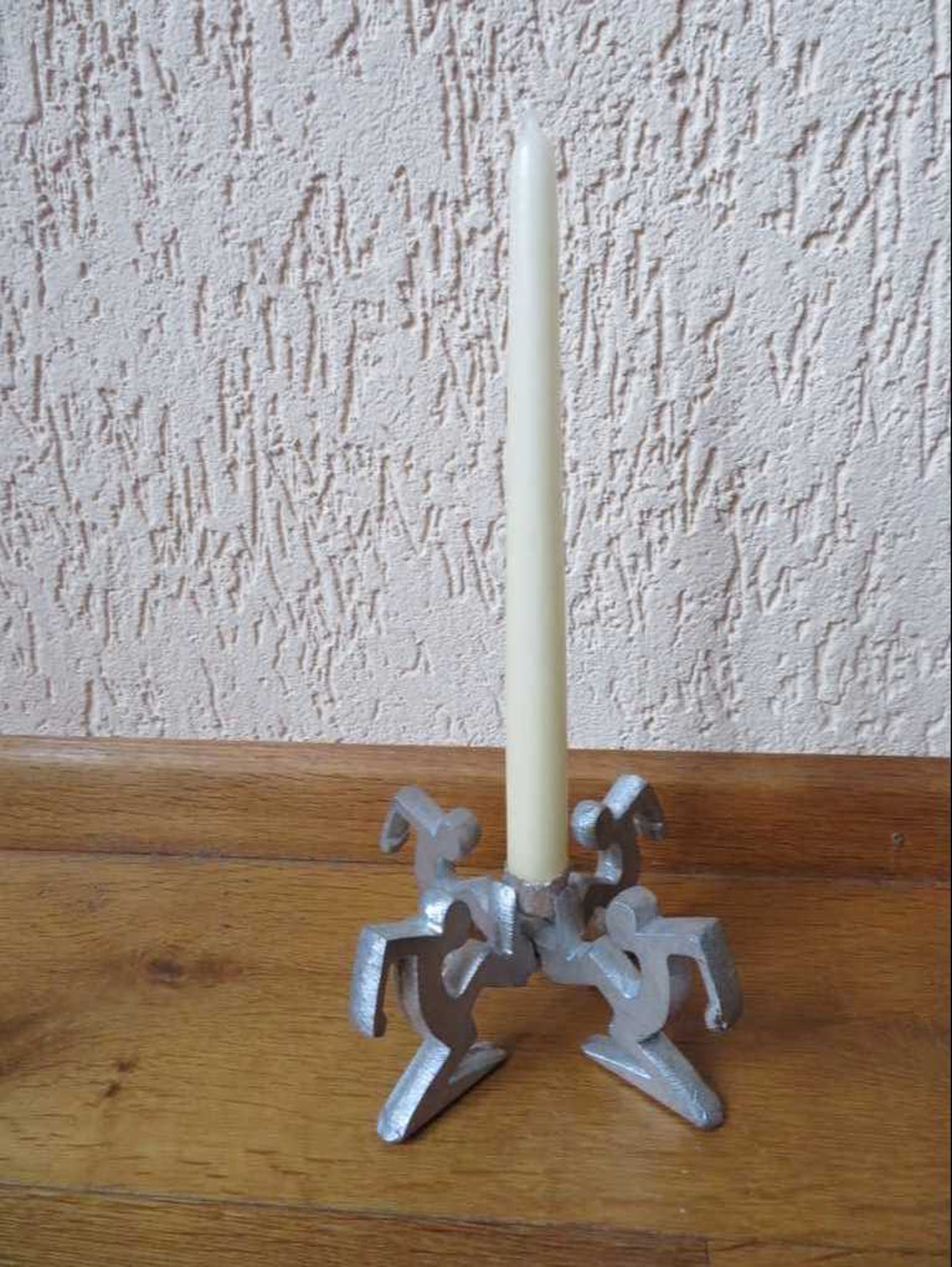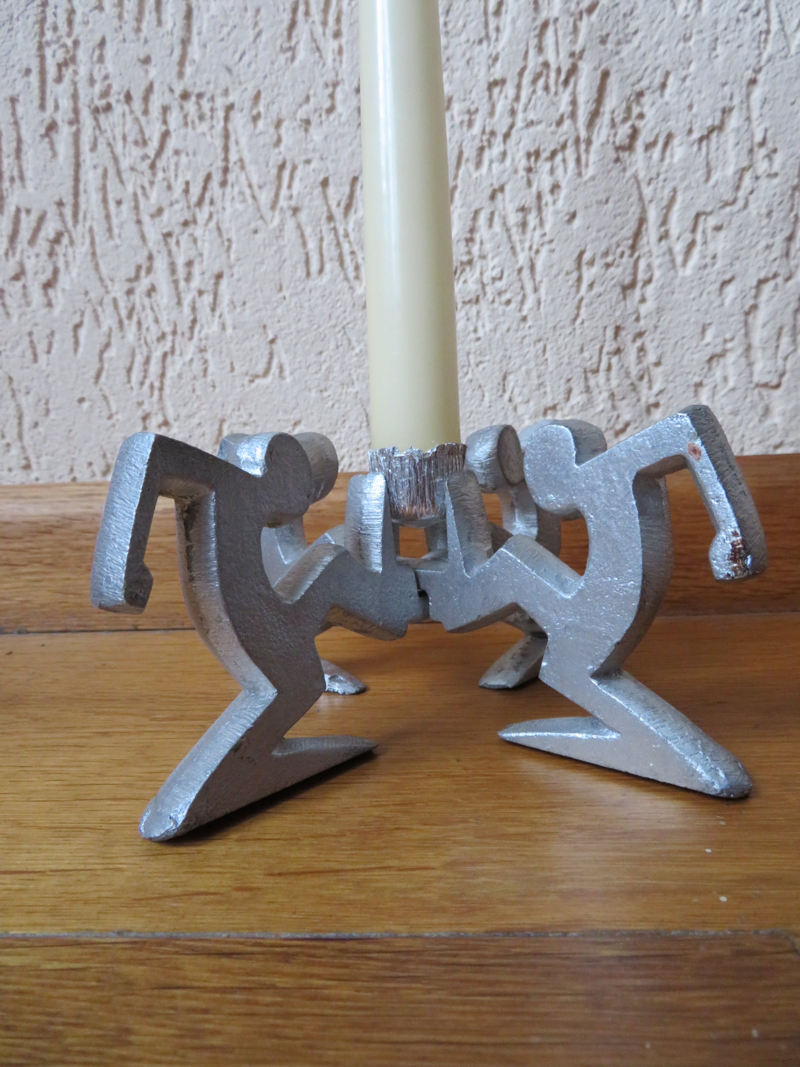 Een kandelaar gemaakt van massief aluminium, bestaande uit 2 delen die niet helemaal gelijk aan elkaar zijn, waardoor het precies in elkaar past. De 4 figuren van Mister Linea vormen zo een stevige basis voor een kaars. De kandelaar is in goede staat en heeft kleine gebruikerssporen.