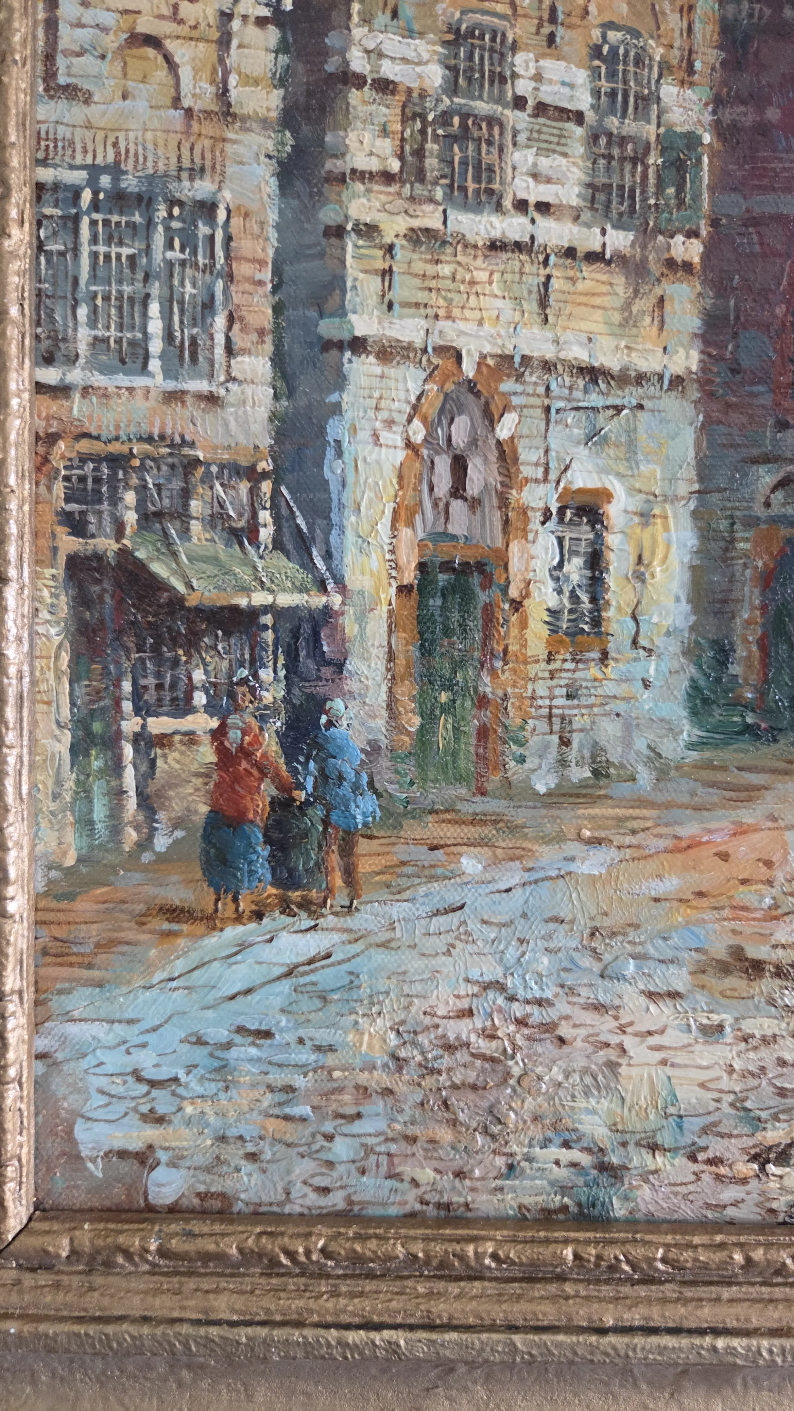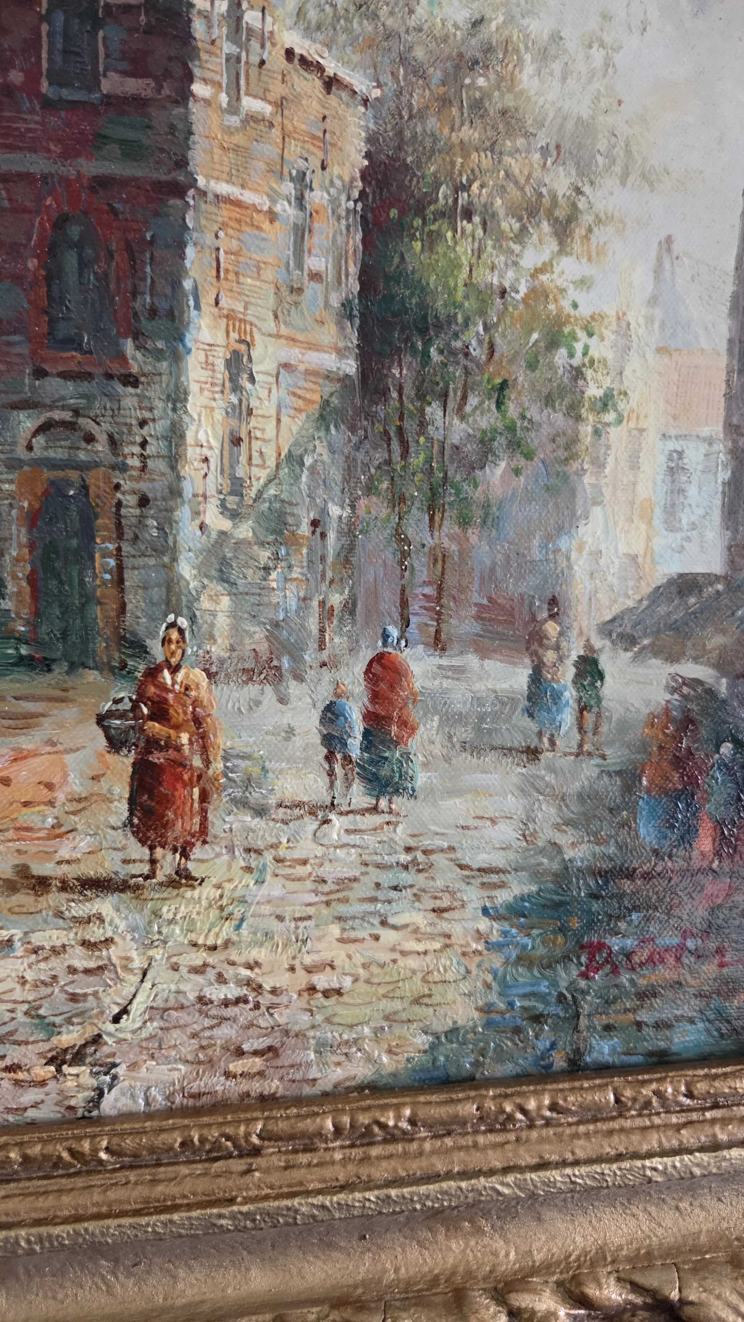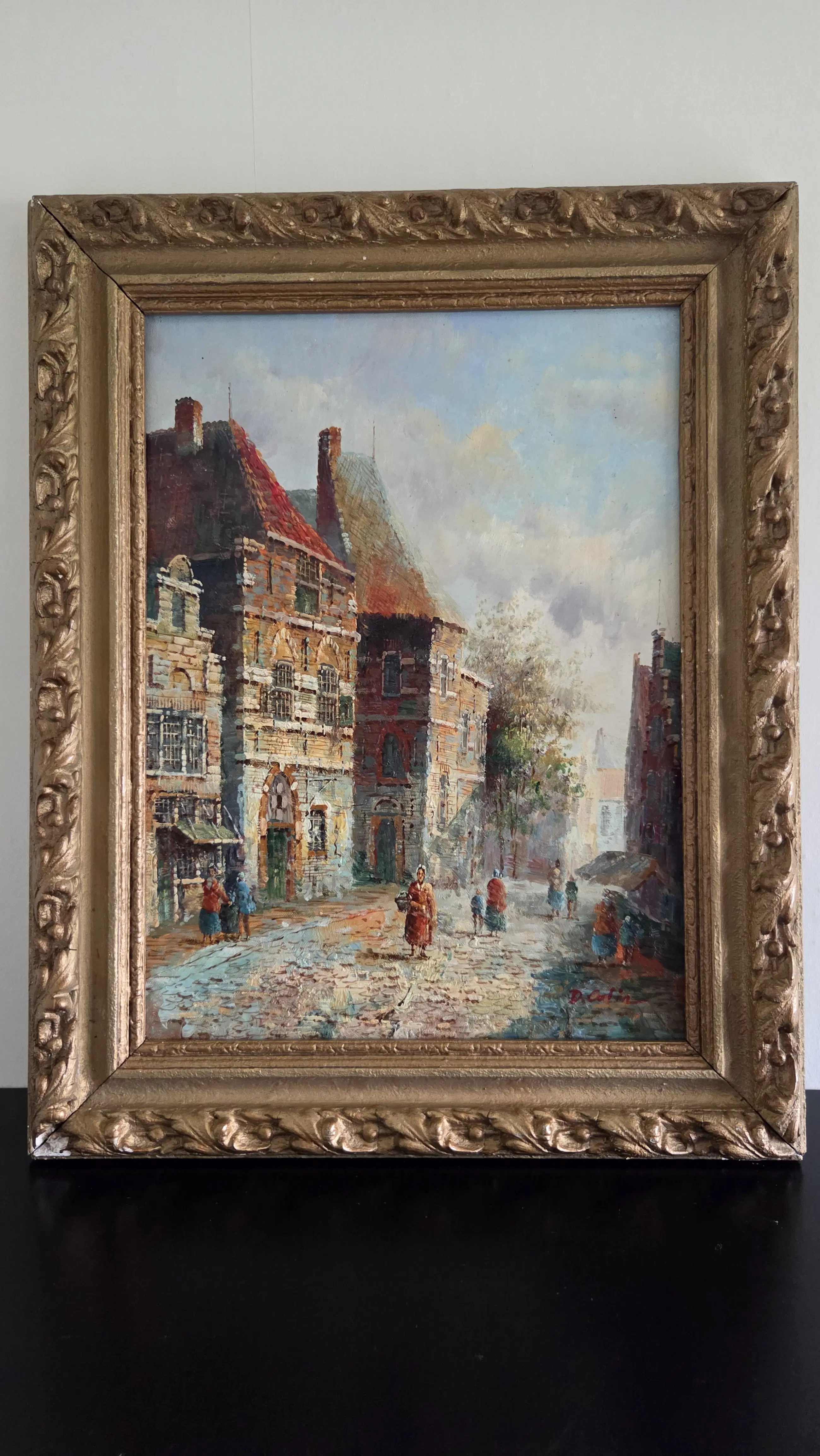 Ter veiling aangeboden: een karaktervol en kleurrijk straatgezicht van de hand van de kunstenaar Daniel Colin (D. Colin). In tegenstelling tot de strakke lijnvoering van de klassieke romantiek, hanteert Colin in dit werk een lossere, impressionistische stijl. Met vlotte, trefzekere penseelstreken zijn de historische gevels en de wandelende figuren neergezet, wat het werk een heerlijke dynamiek en textuur geeft.