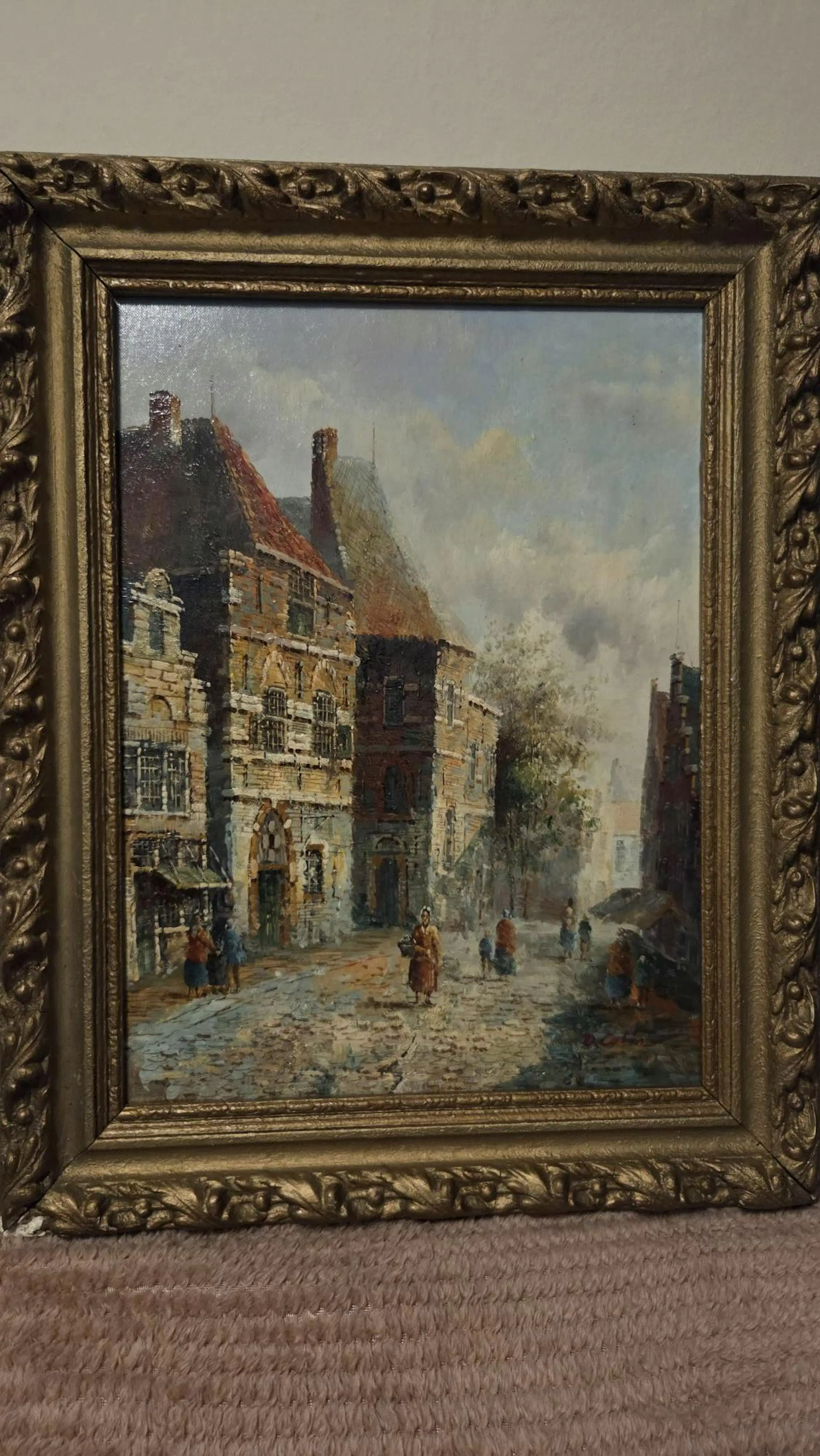 Techniek: Olieverf op paneel, waarbij de verf met een hoorbare 'toets' (impasto) is aangebracht, wat zorgt voor een prachtige dieptewerking in de bestrating en de gevels.