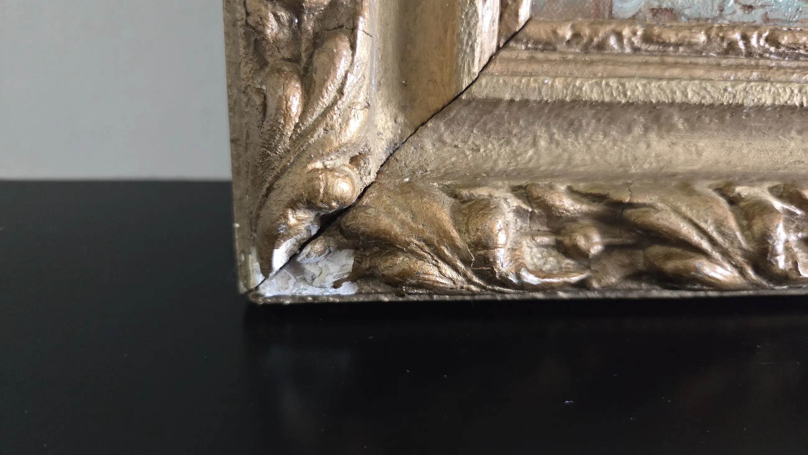 Lijst: Het schilderij is gevat in een klassieke, goudkleurige houten lijst voorzien van een elegant doorlopend bladmotief (guirlande).