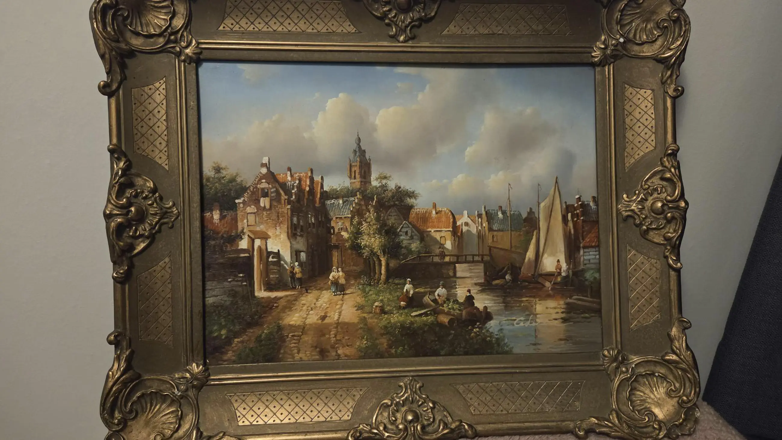 Stijl en Look: Dit werk is uitgevoerd in de traditie van de Hollandse Romantiek. De kunstenaar heeft met veel precisie de lichtval op de bakstenen gevels en de subtiele spiegeling in het water gevangen. Door het gebruik van een paneel als ondergrond zijn de details zeer scherp gebleven. Het warme kleurenpalet en de Hollandse wolkenlucht geven het schilderij een tijdloze en rustieke uitstraling.
