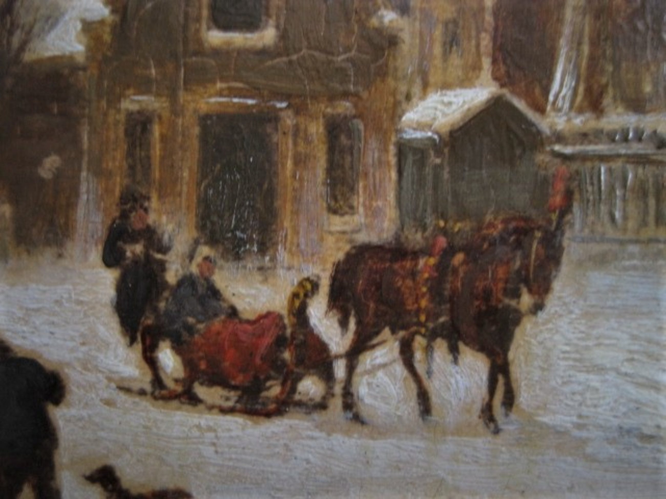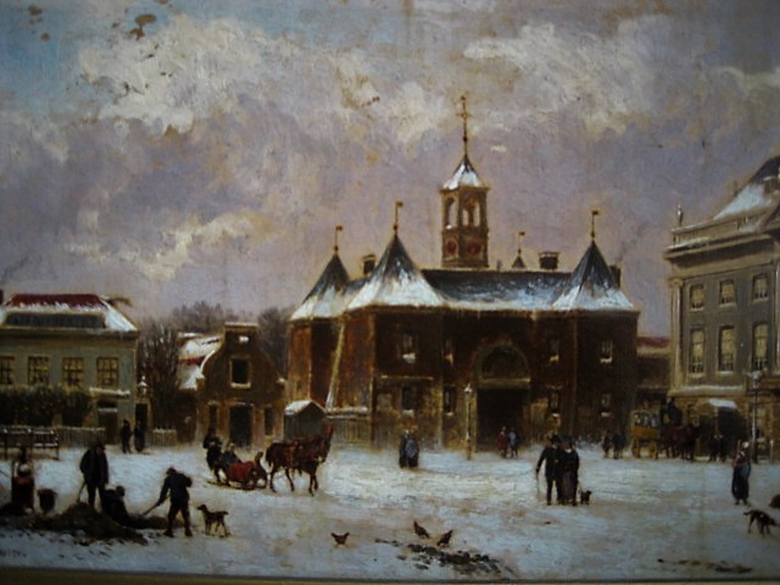 Goed geschilderd oud olieverf op eikenhouten paneel met voorstelling van een besneeuwd Leidseplein met de Leidsepoort te Amsterdam. Rechts is de Stadsschouwburg te herkennen. Linksonder gesigneerd.