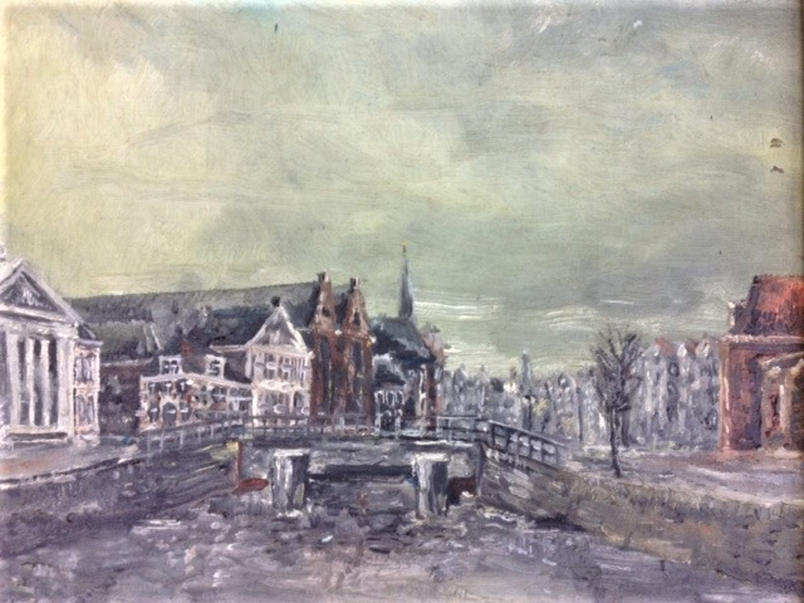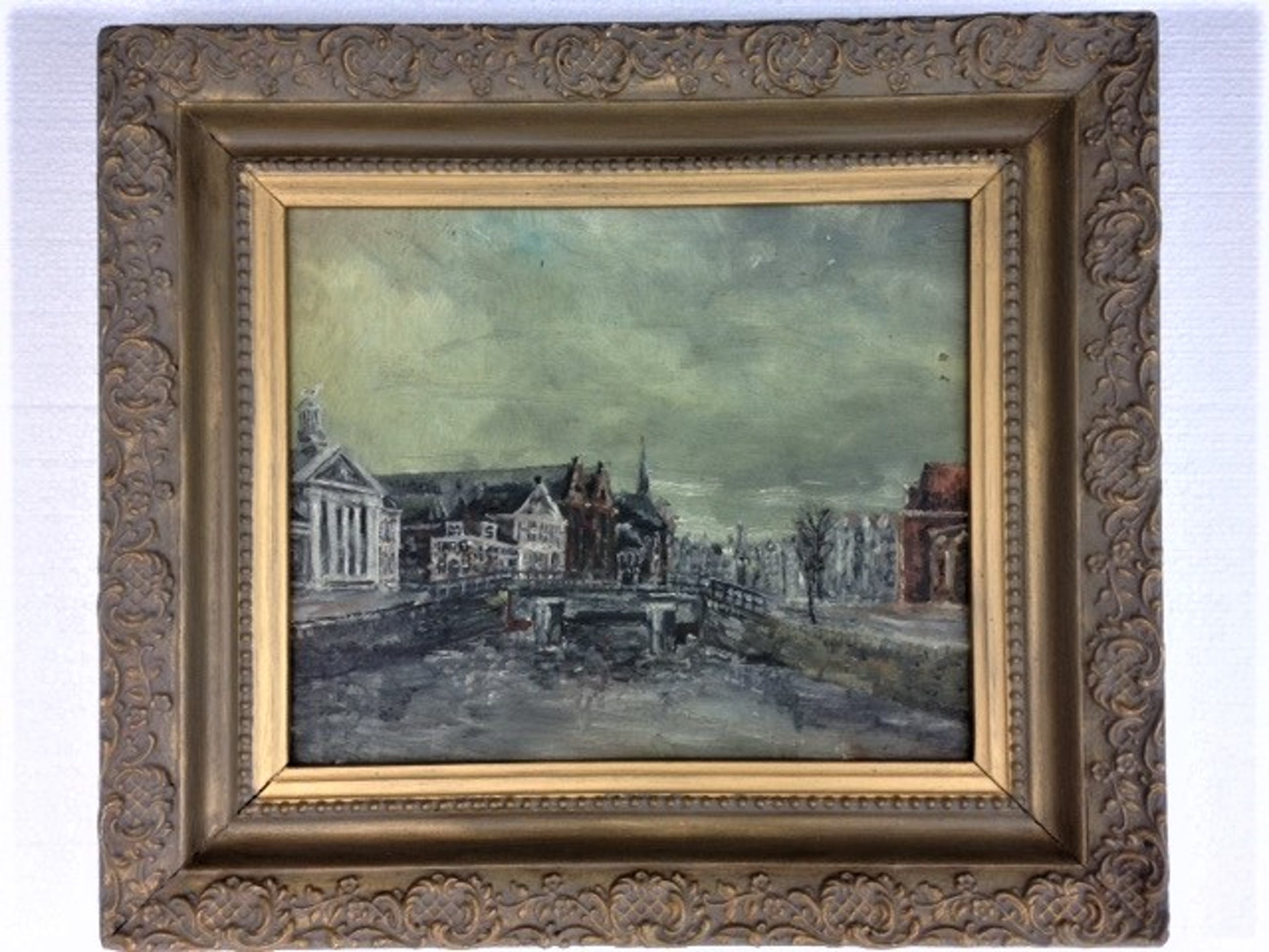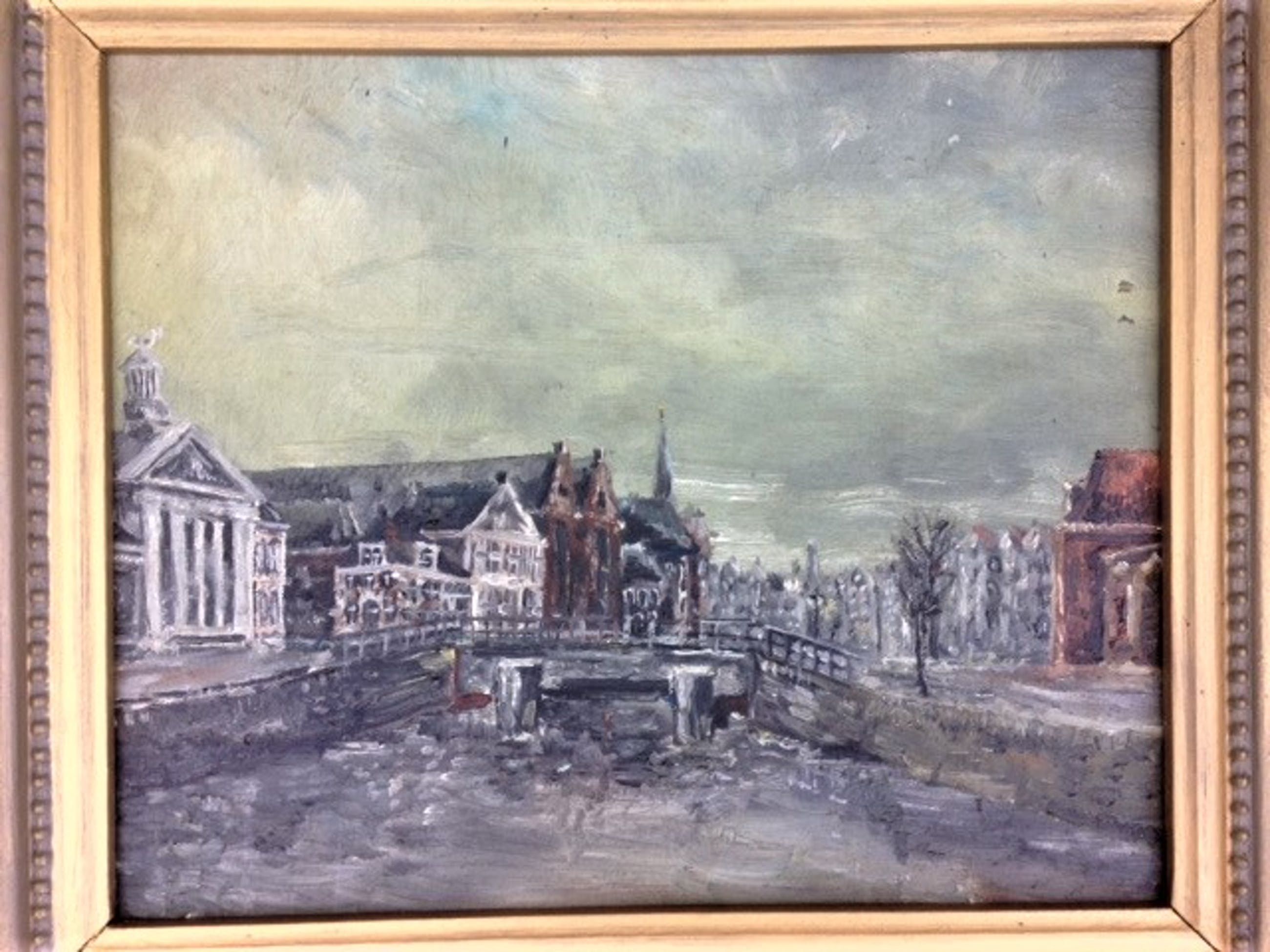 Oud stadsgezicht. Naam van de kunstenaar is niet bekend. Het werk is namelijk niet gesigneerd. Techniek: olieverf op doek, op hardboard.