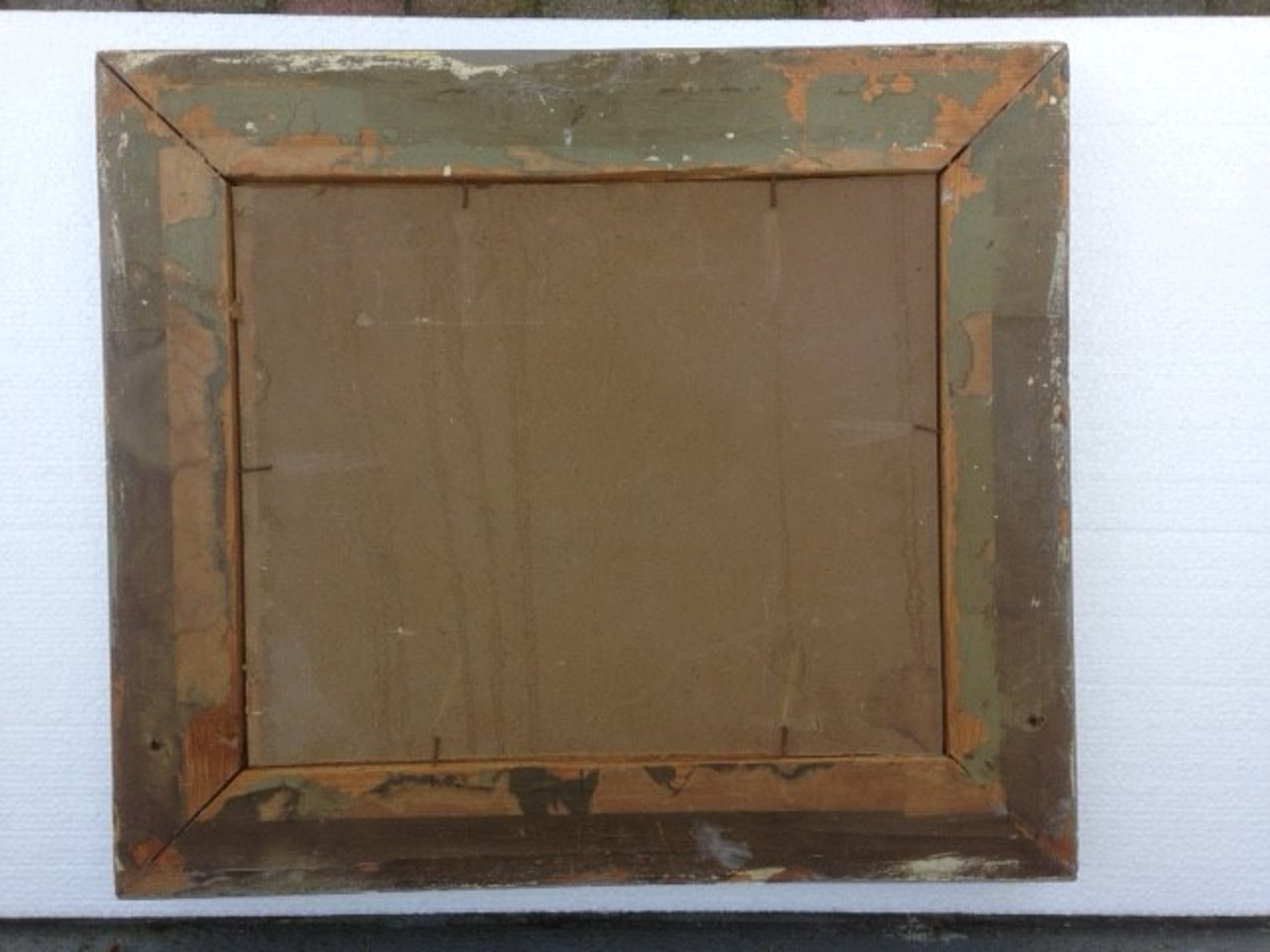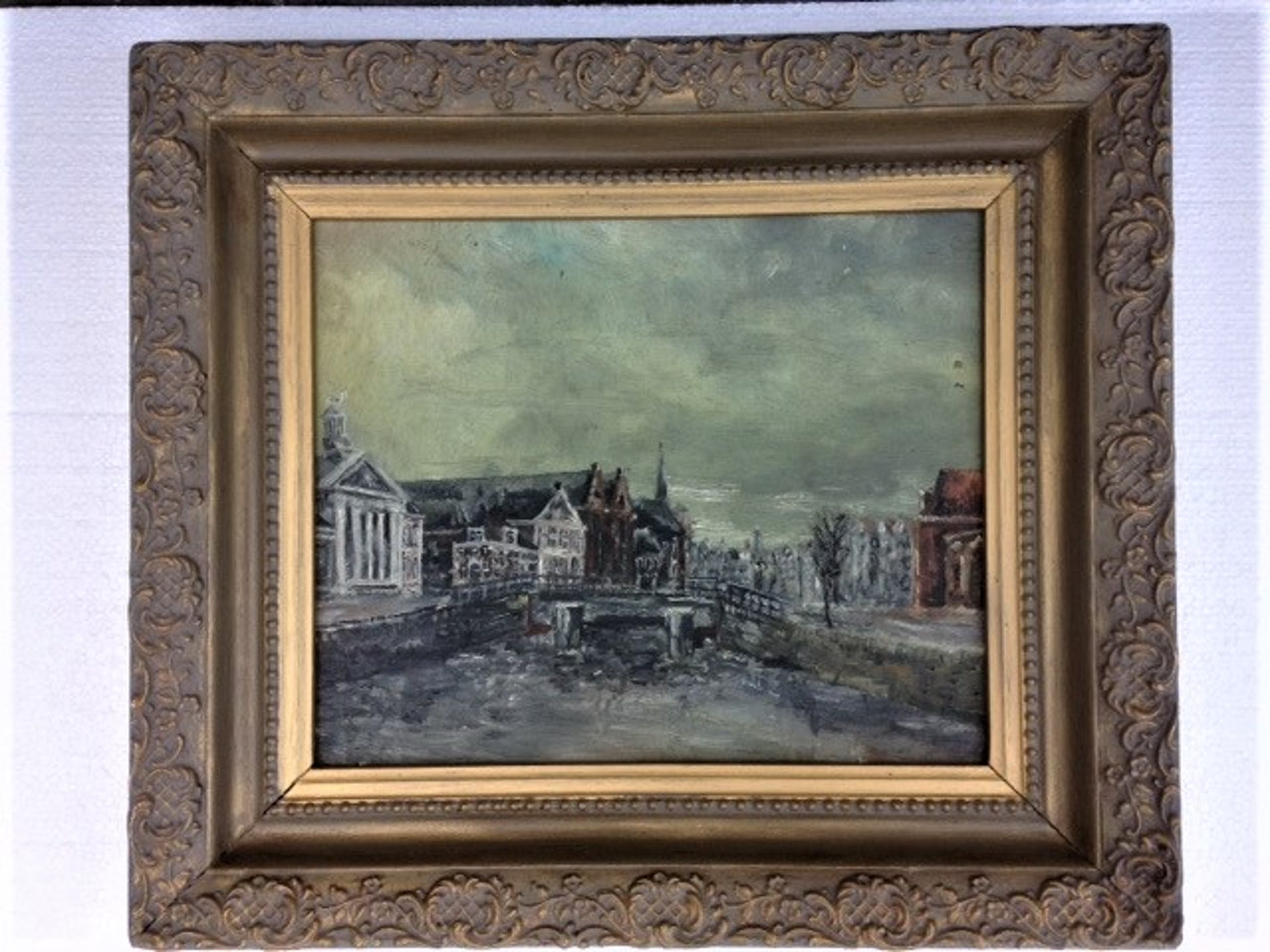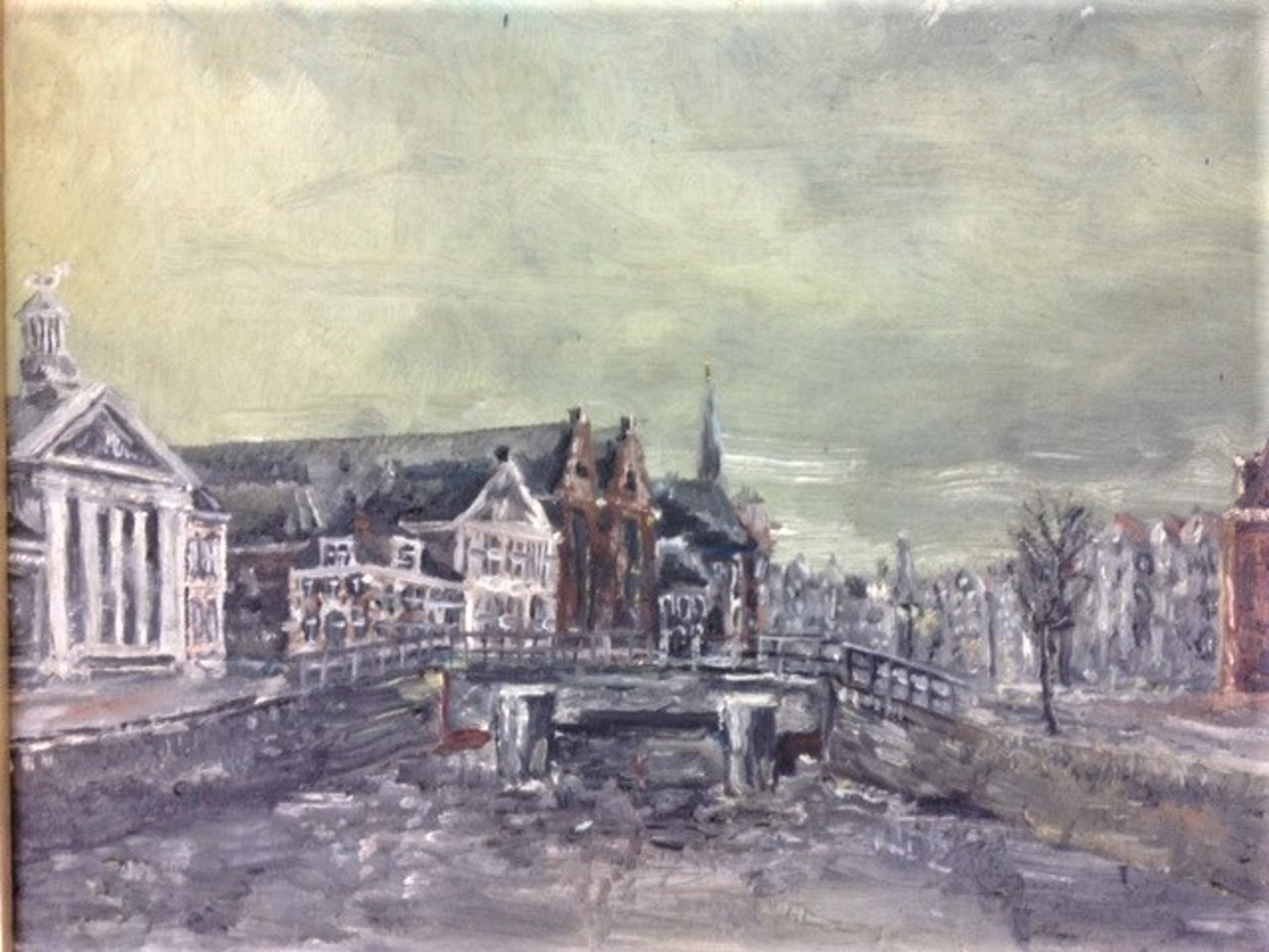 Oud stadsgezicht. Naam van de kunstenaar is niet bekend. Het werk is namelijk niet gesigneerd. Techniek: olieverf op doek, op hardboard.