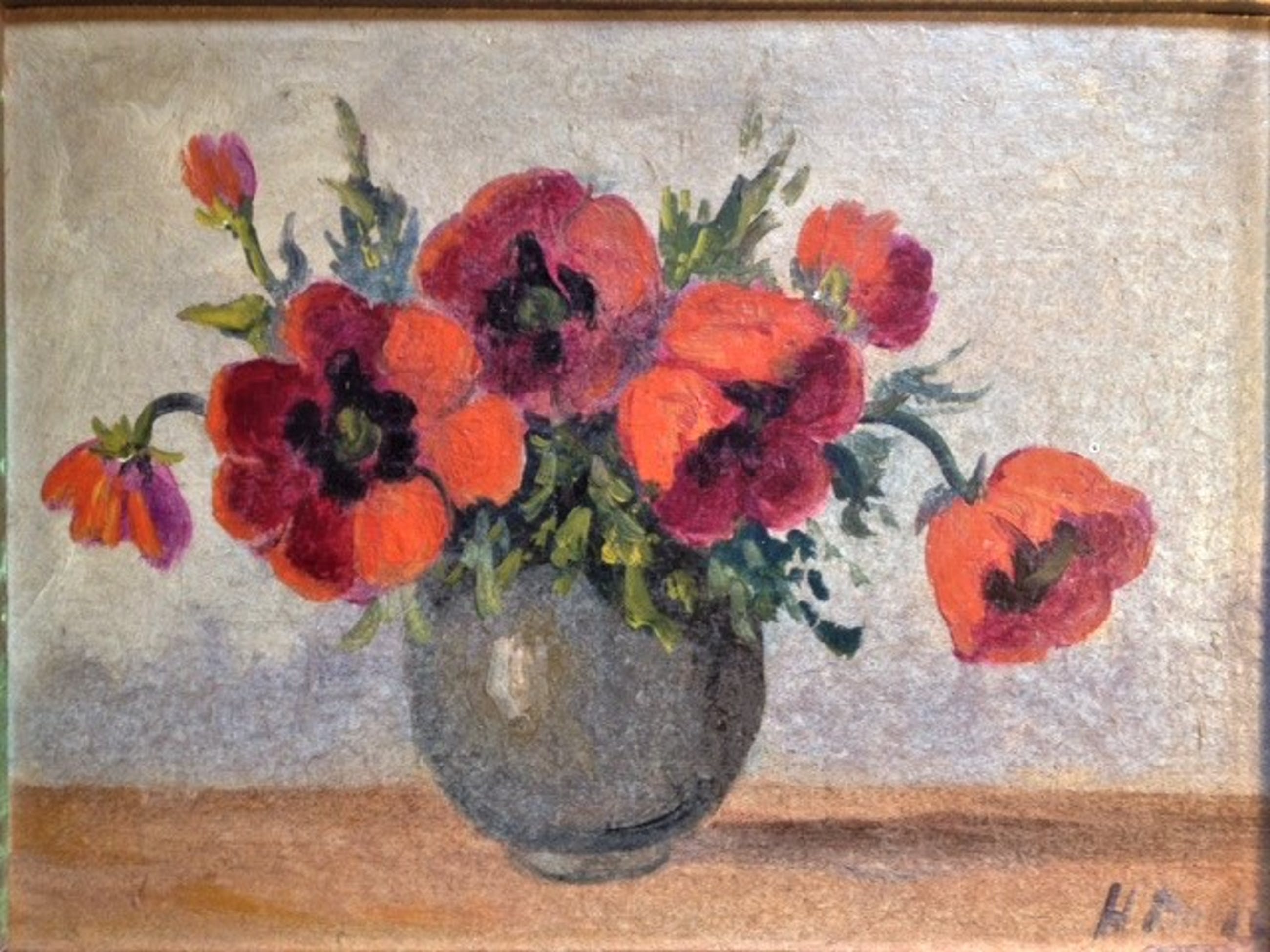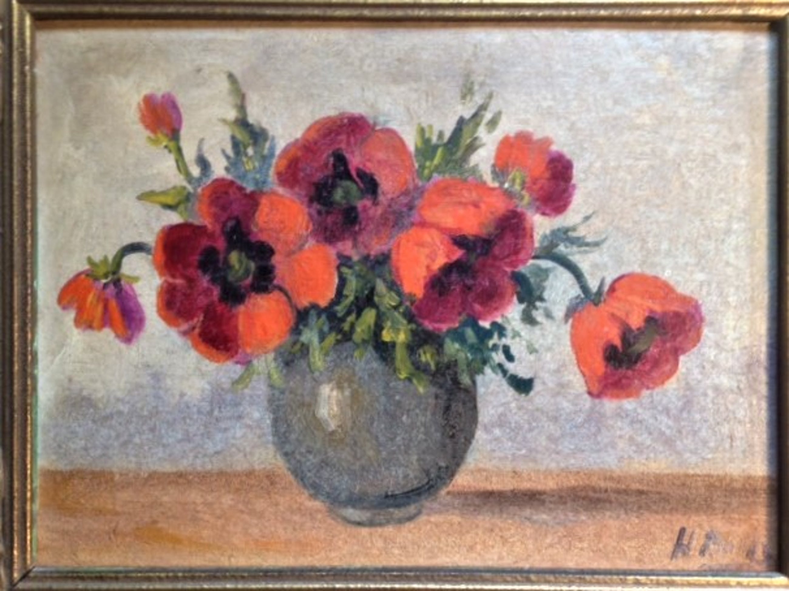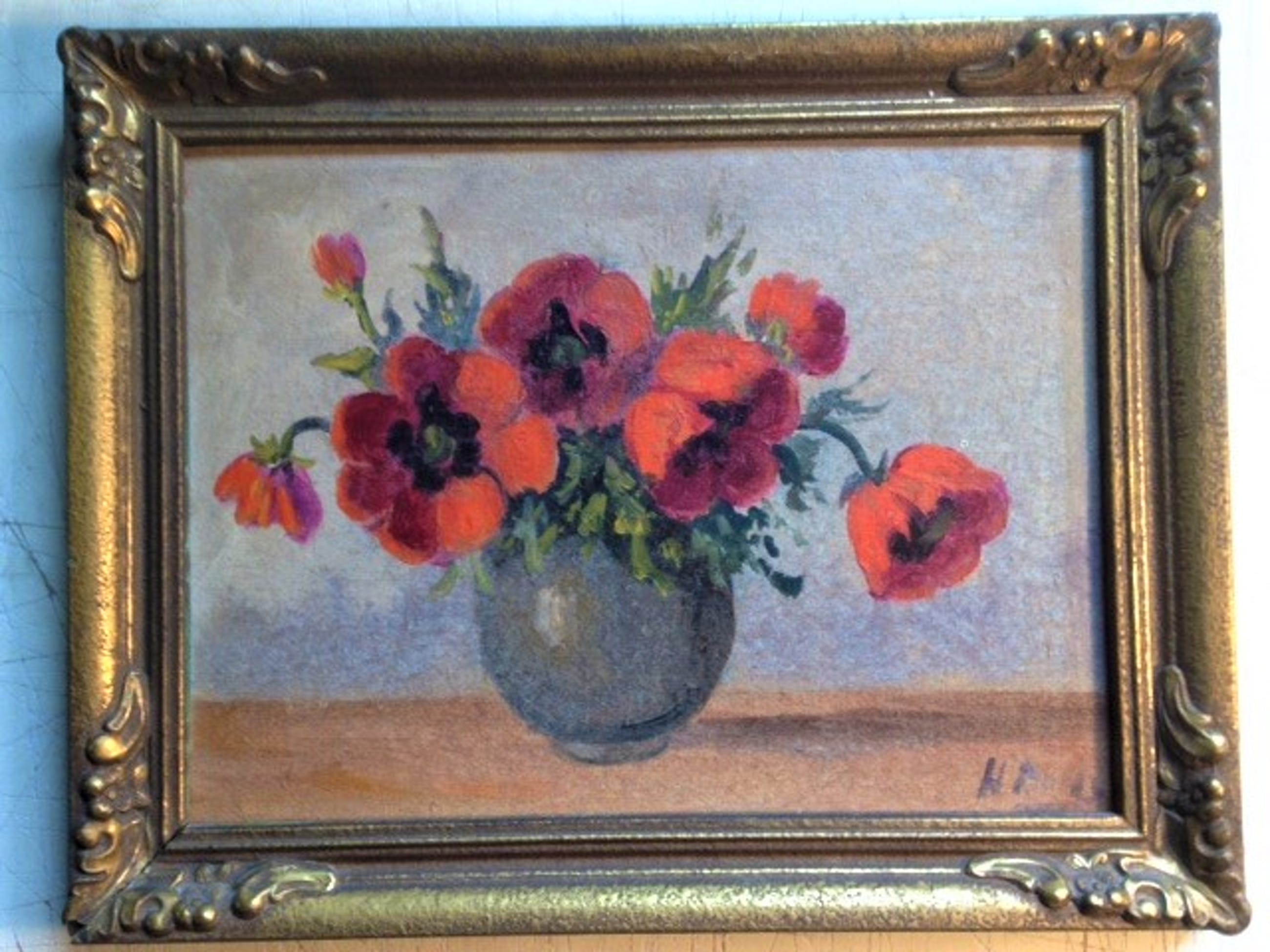 Heel oud werk. Klaprozen op een vaas. De naam van de schilder is niet goed leesbaar. Gesigneerd aan de rechter onderzijde. Olieverf op paneel. De afmetingen van het paneel zijn: 25 cm x 18 cm. Inclusief de lijst zijn de afmetingen: 29 cm x 23 cm. Verkeert ondanks de ouderdom nog in een goede staat.