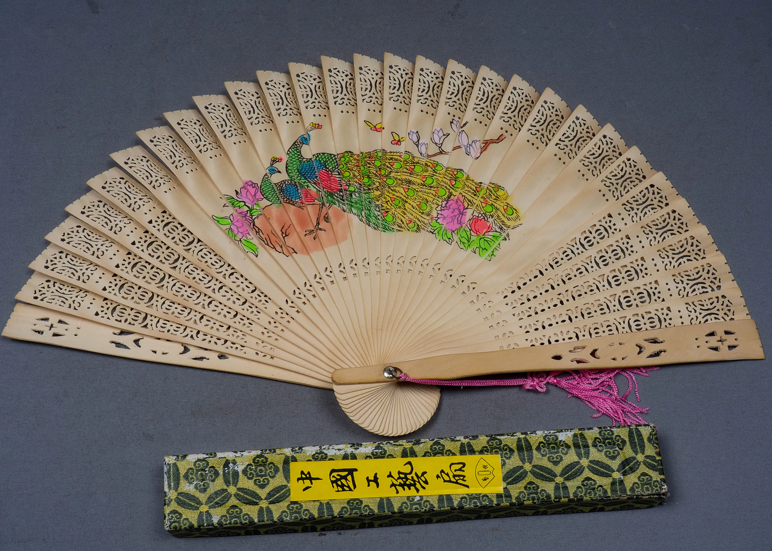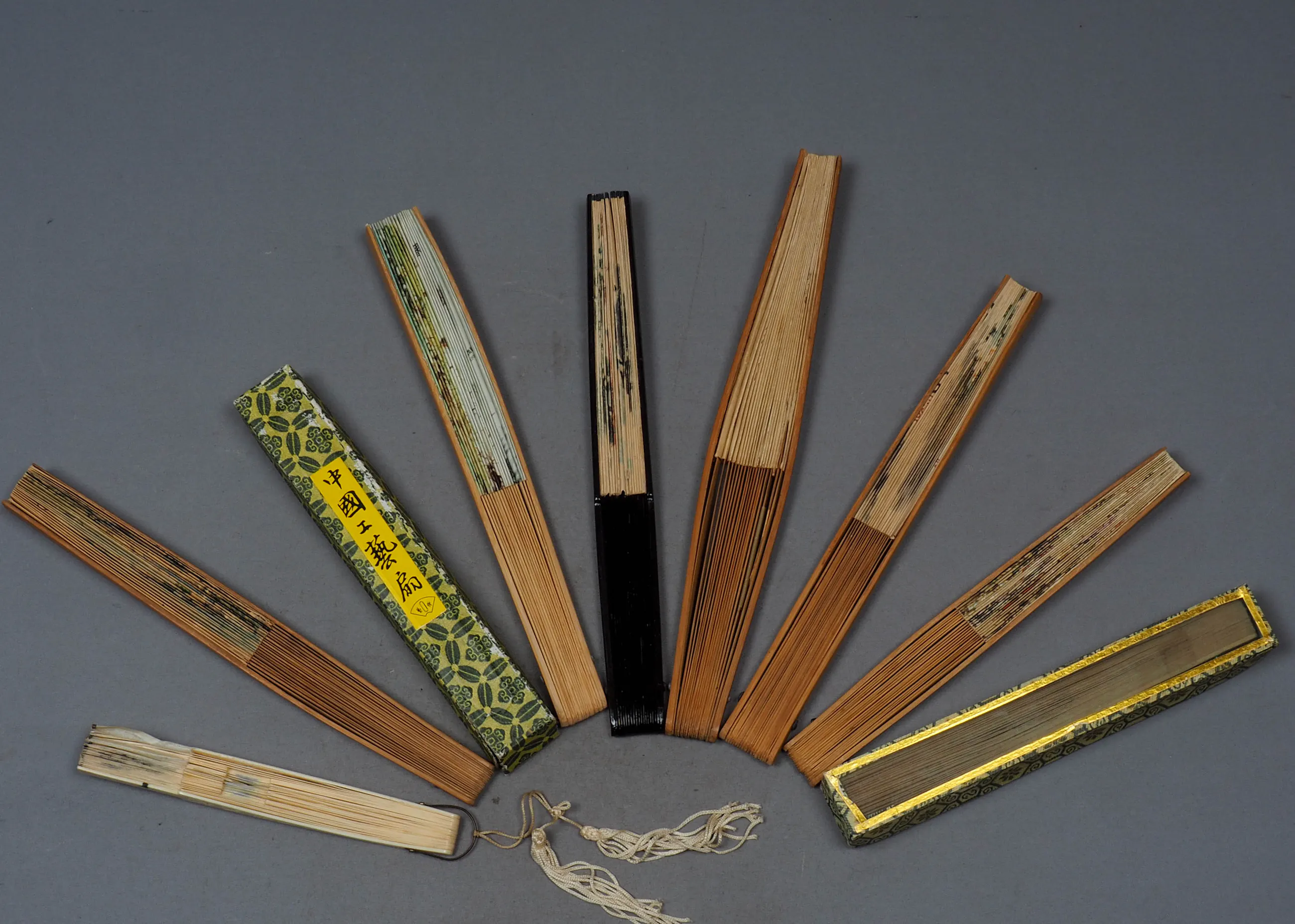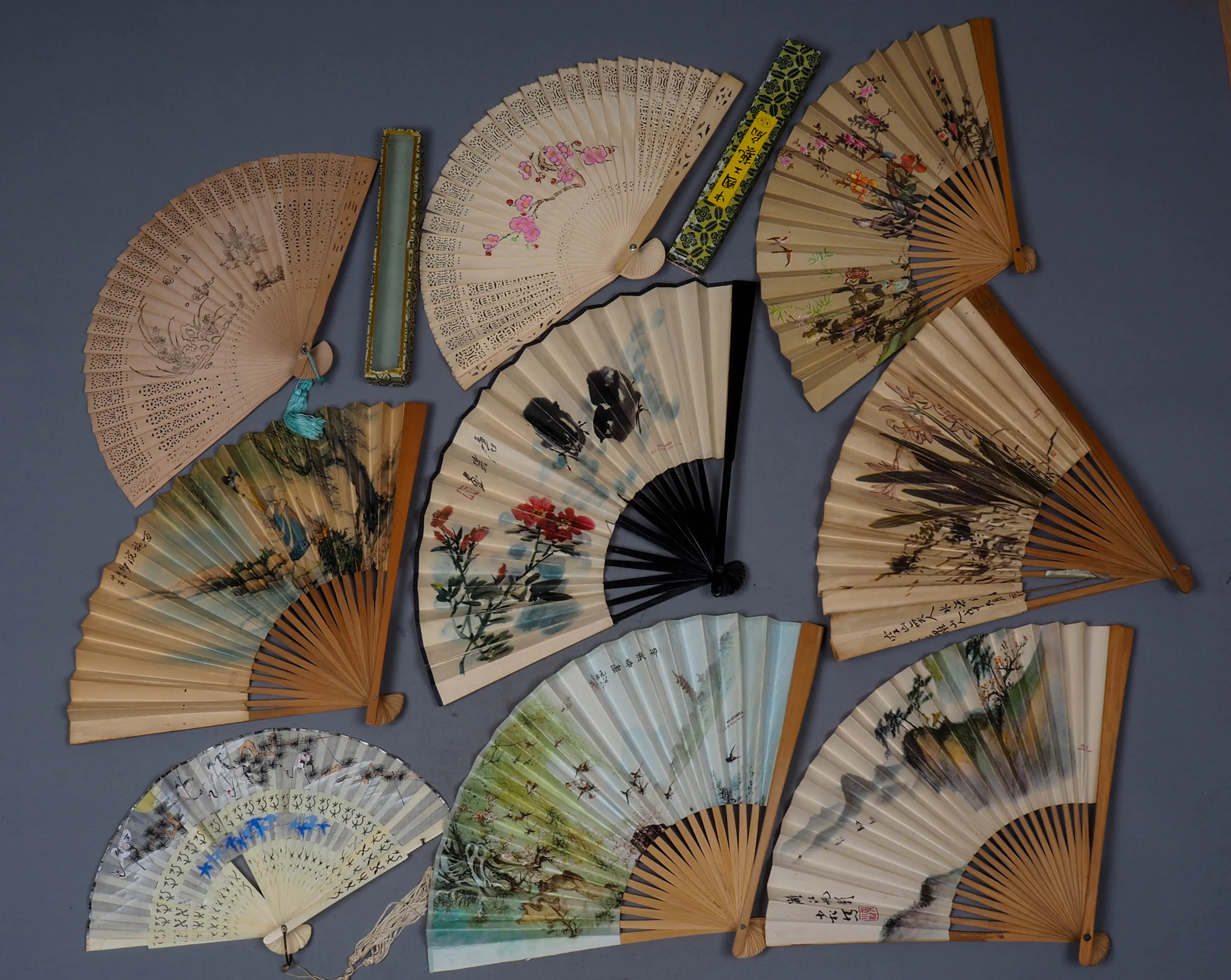 Een collectie van 9 hand waaiers, de meeste gesigneerd met "made in China", of "made in the peoples republic of China". 8 stuks van hout en papier, 1 van been en doek. alles in redelijke staat, zie de foto's. Ingeklapt is de langste 29 centimeter. datering jaren 50/60 van de vorige eeuw.