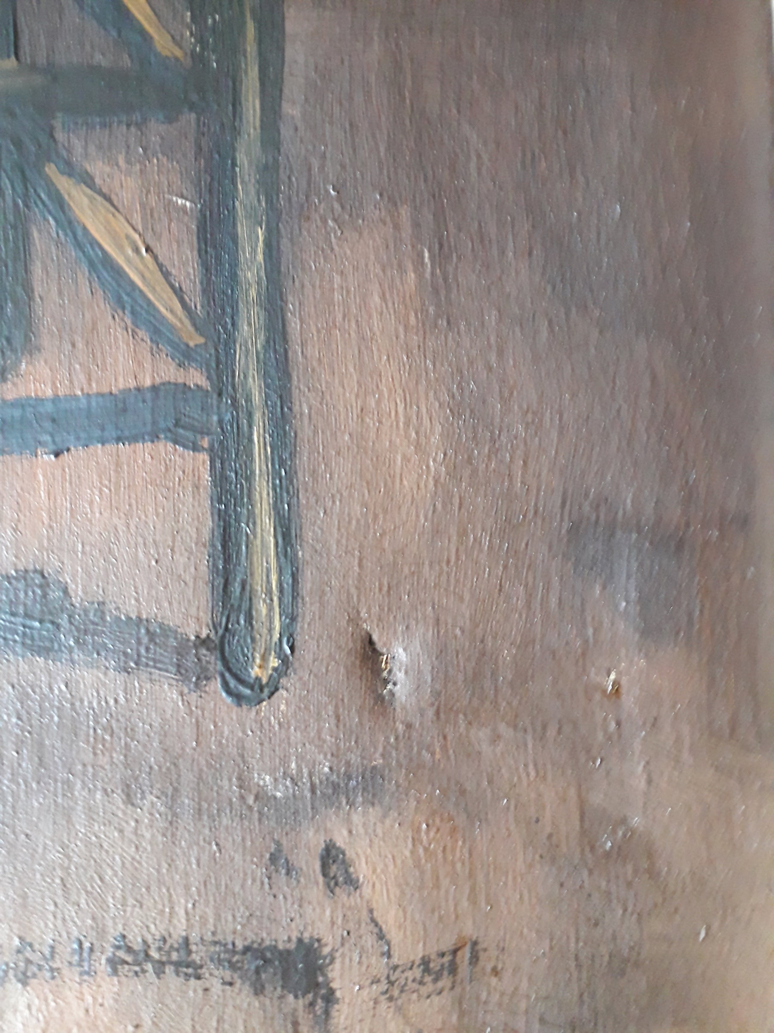 Het werk komt uit de boedel van onze moeder. De conditie is goed, het werk heeft één kleine schade (zie foto). Het werk is gesigneerd echter slecht leesbaar, A.J. van Eyk of van Eek.
