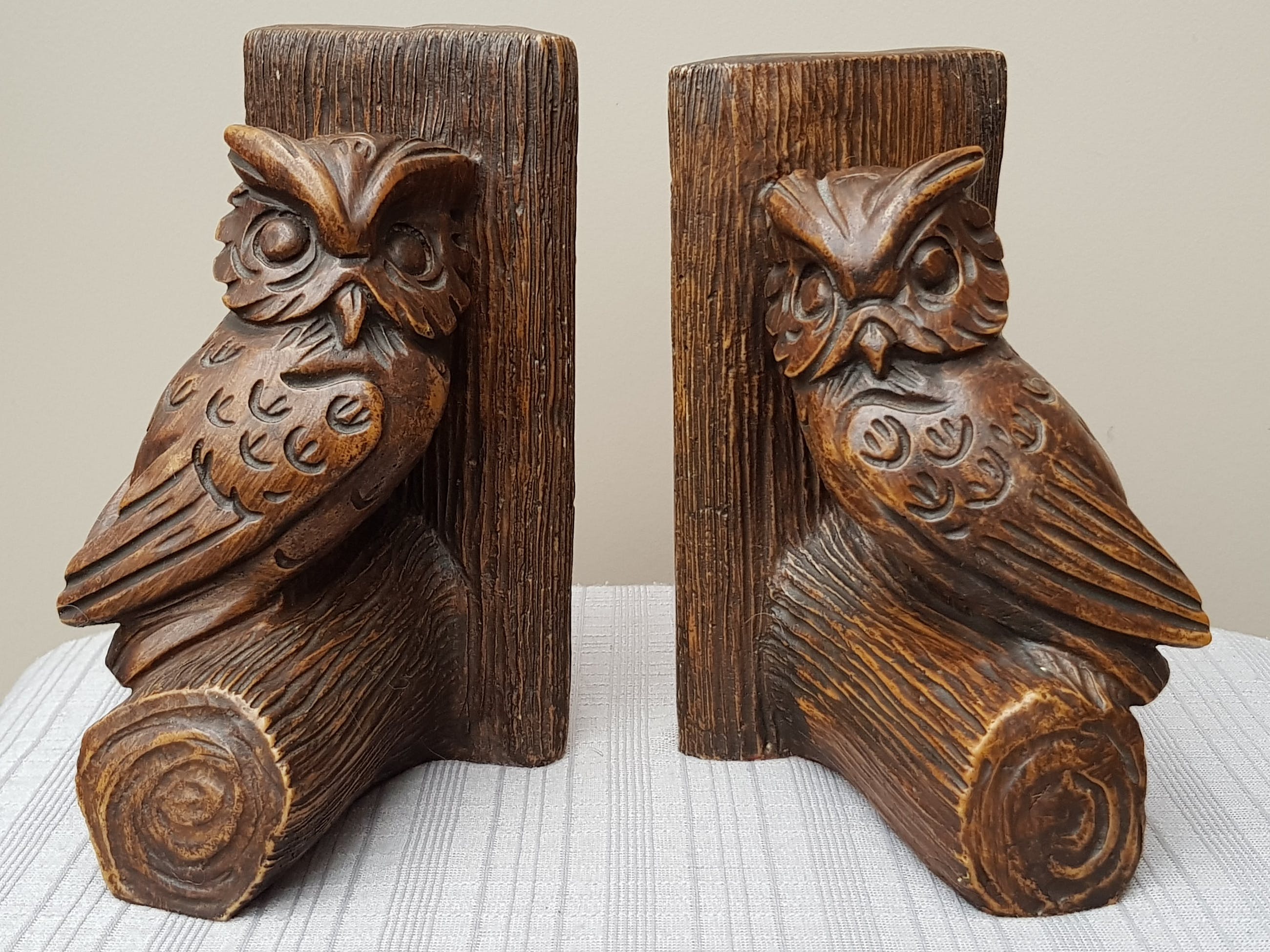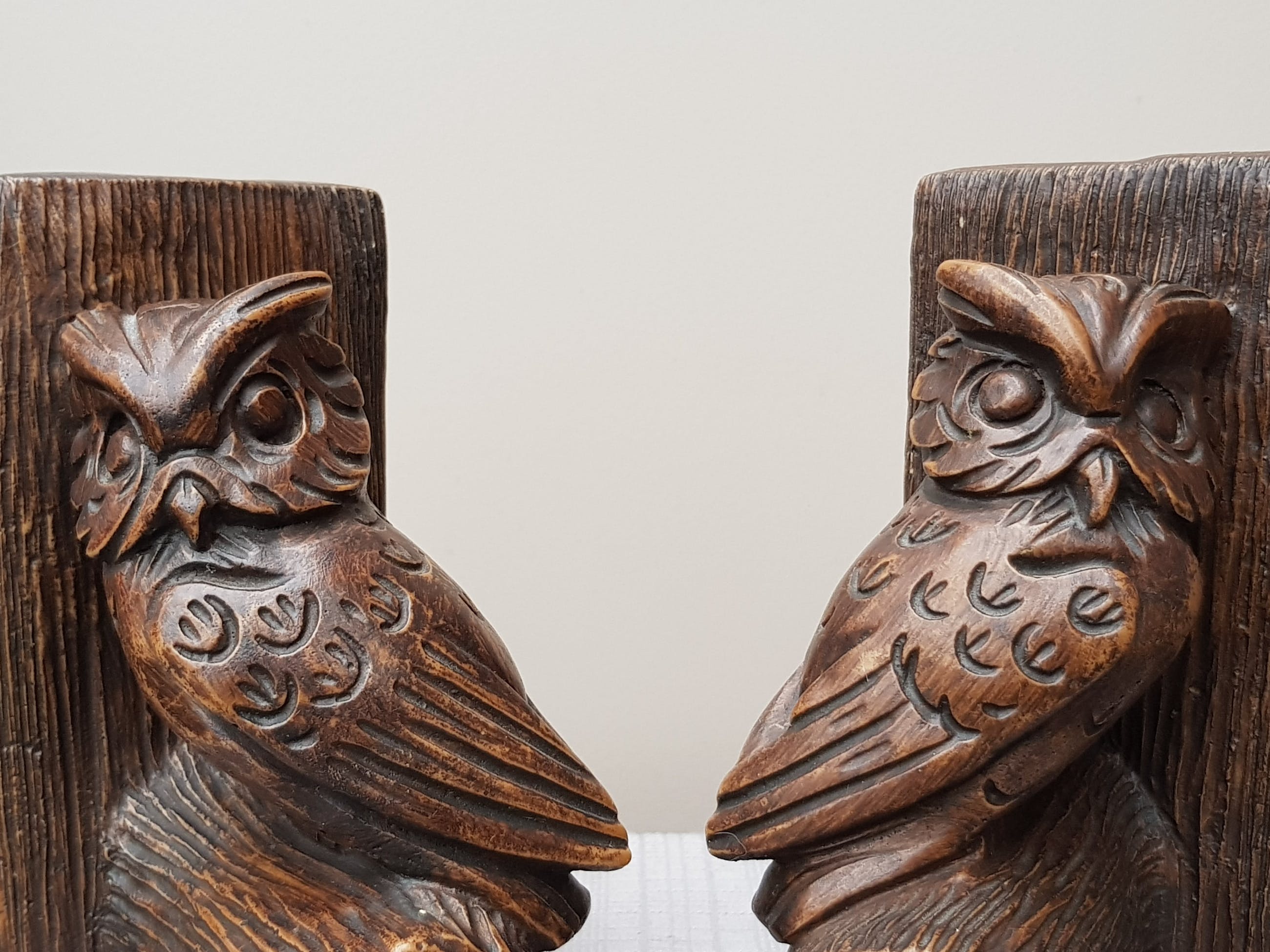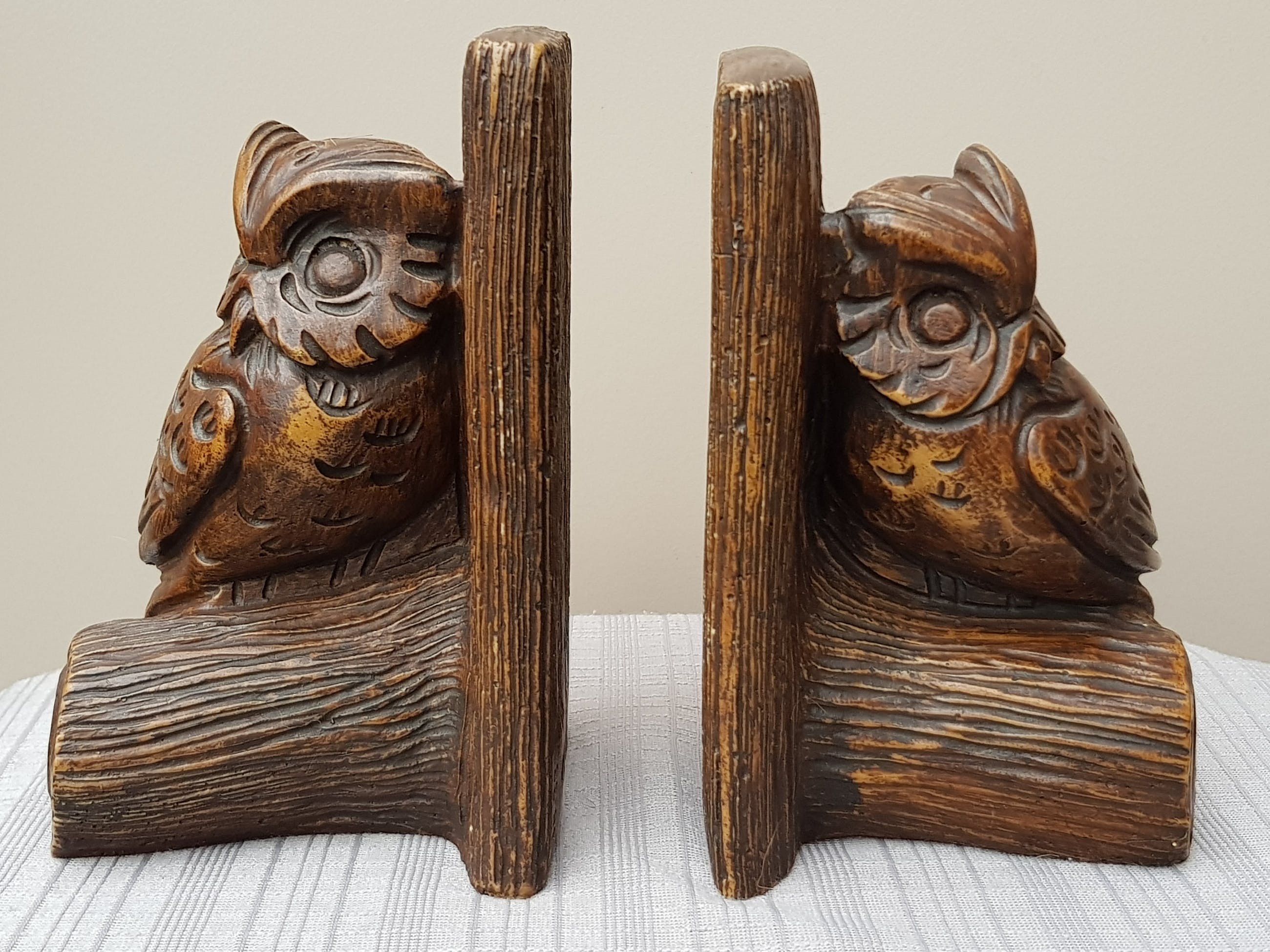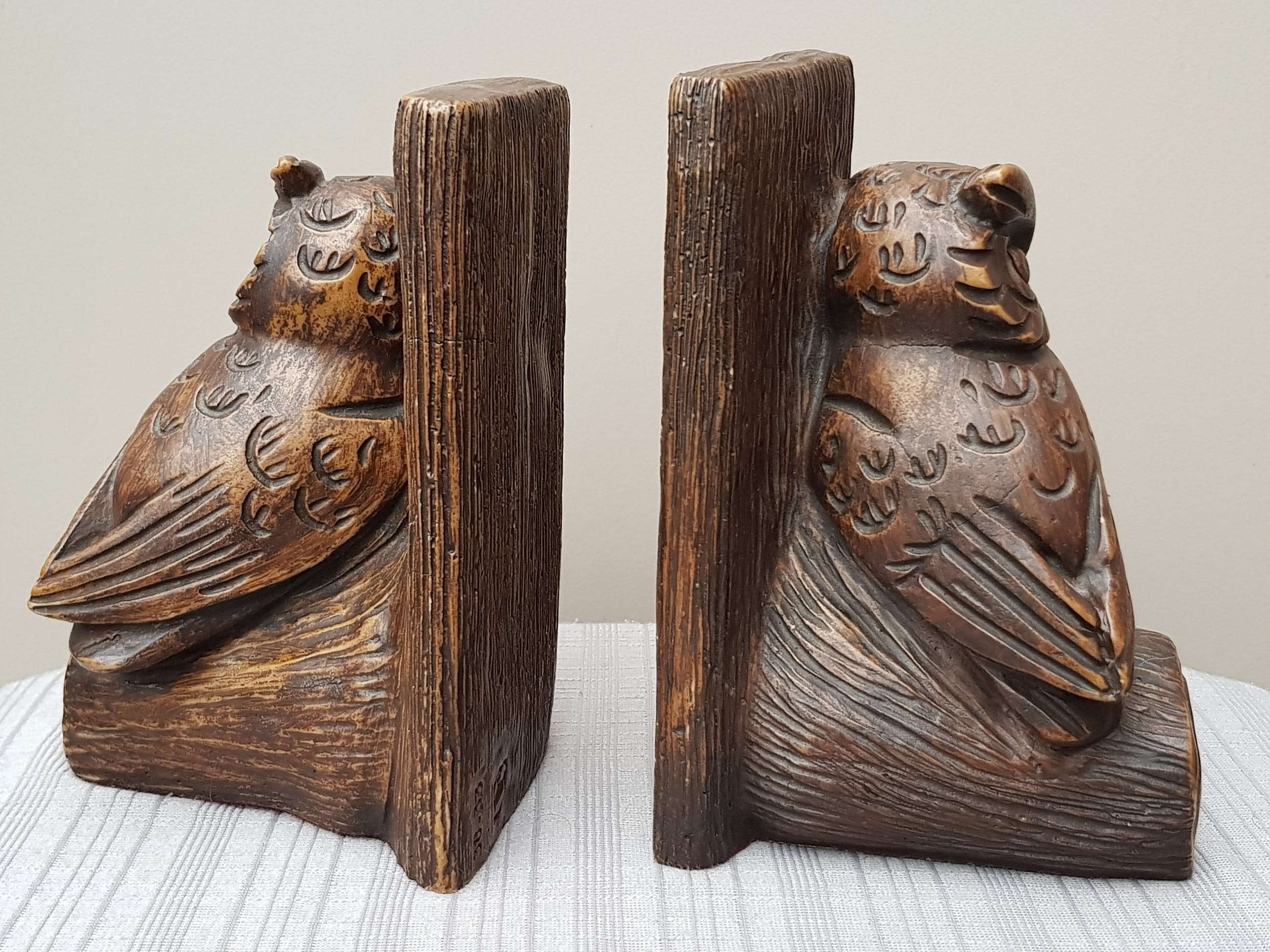 Een paar boekensteunen in de vorm van uilen. Gemaakt van kunsthars. Gesigneerd, maar voor mij onleesbaar. Afm: H, 15.5 x B, 8 x D, 10 cm. Gewicht: 1695 gram. Conditie, in perfecte staat. Bij verzenden wordt het extra goed ingepakt.