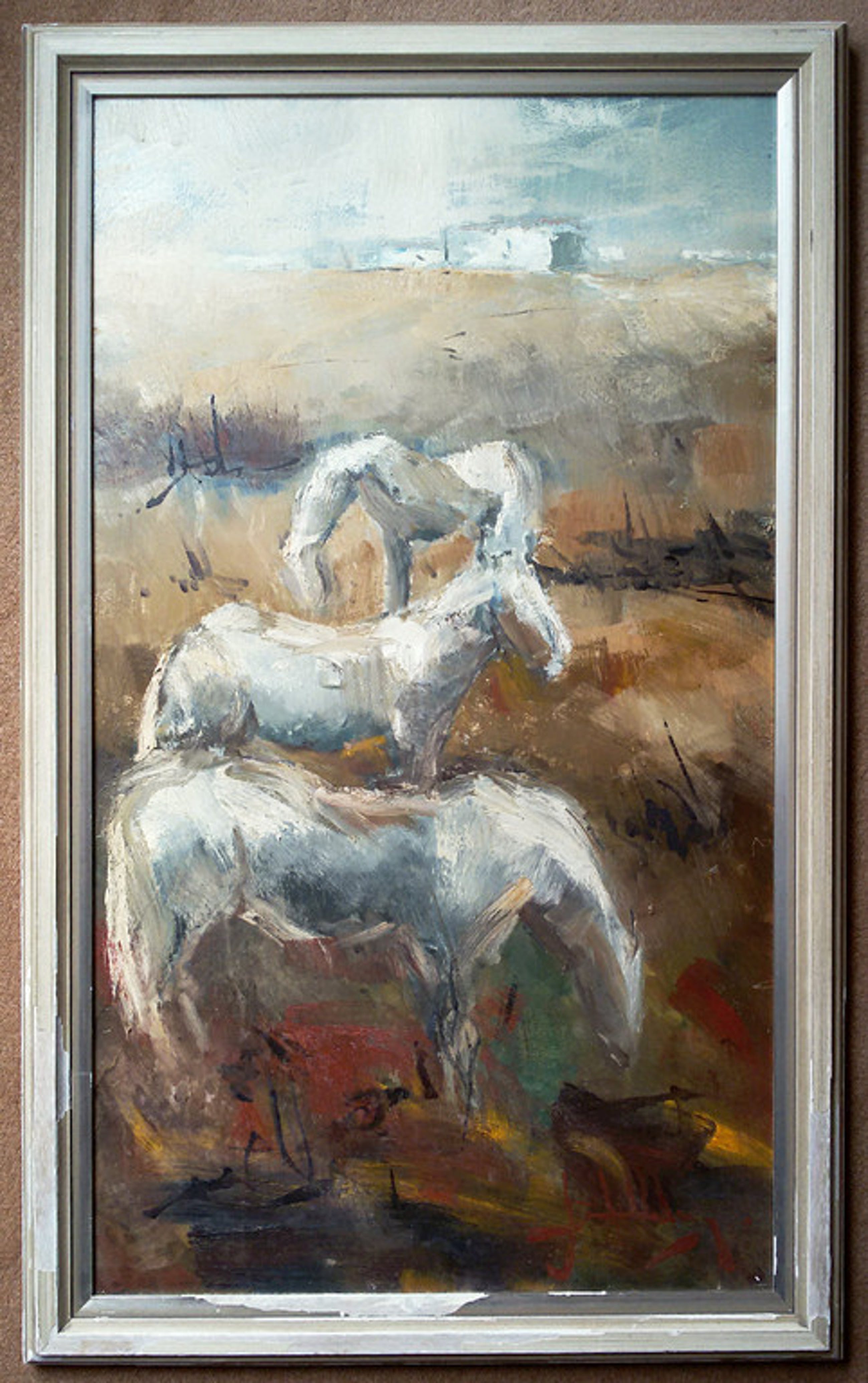 Zeer goed geschilderd werk van een vooralsnog onbekende kunstena(a)r(es). Olieverf op paneel, gesigneerd rechtsonder, maar door mij totaal niet te ontcijferen. In goede conditie, al moet misschien het onderste gedeelte op bepaalde plaatsen opnieuw gevernist worden. Het paneel is ingelijst maar de lijst bladdert en moet liefst gestript worden en opnieuw geverfd, of het werk moet helemaal opnieuw worden ingelijst. Samengevat; deze ruwe edelsteen vraagt wat liefde en aandacht maar als het dat krijgt dan is het eindresultaat een geslepen 50 karaats diamant.