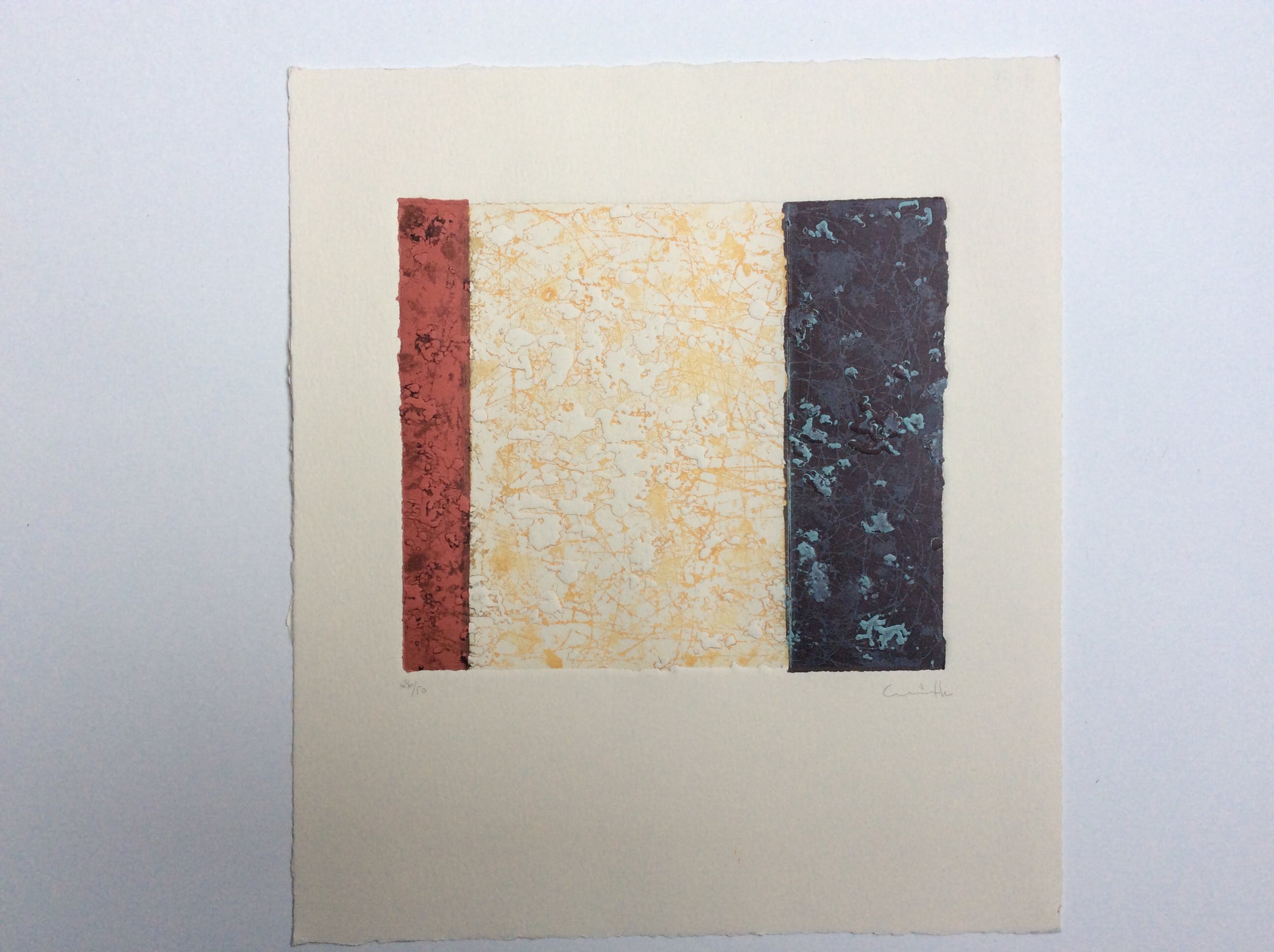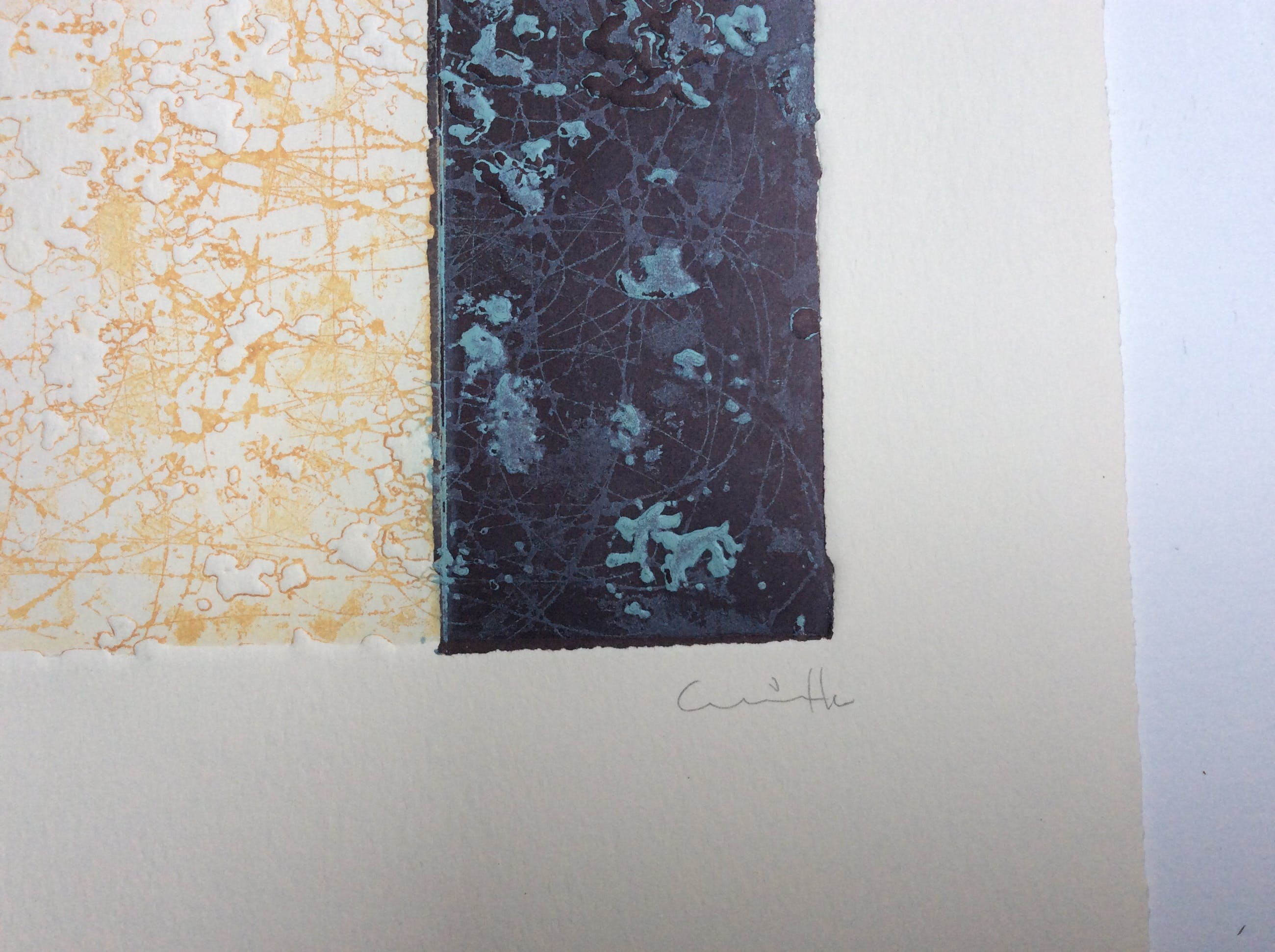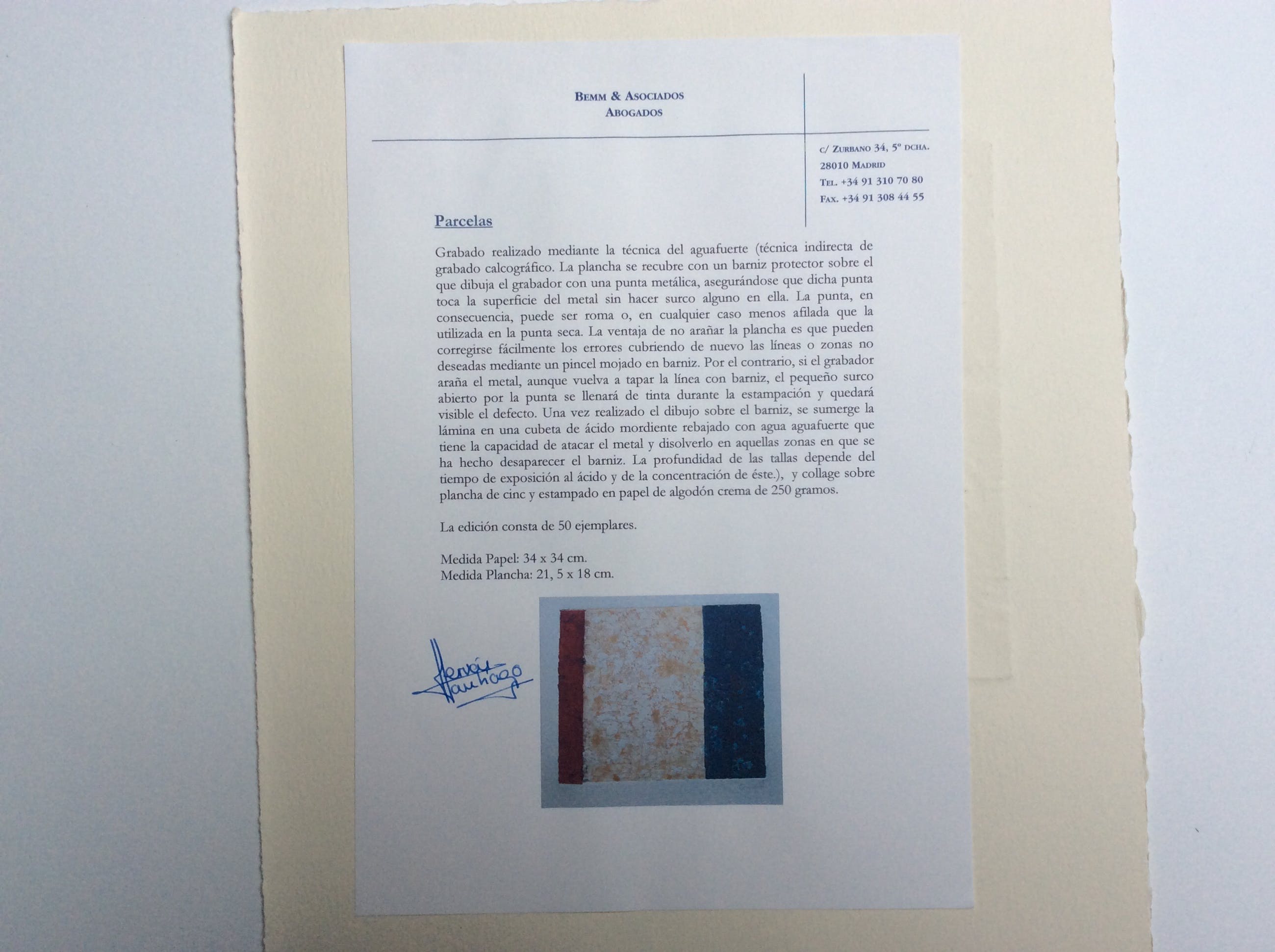 Intrigerende kleuren ets in 3 tonen, van onbekende kunstenaar, mogelijk van Spaanse afkomst. Titel: Parcelas. Formaat incl. 34 x 30 cm, grootte ets 18 x21 cm. Onderin potlood gesigneerd en genummerd, 26/50 Achterop apart voorzien van informatie plus gesigneerd.