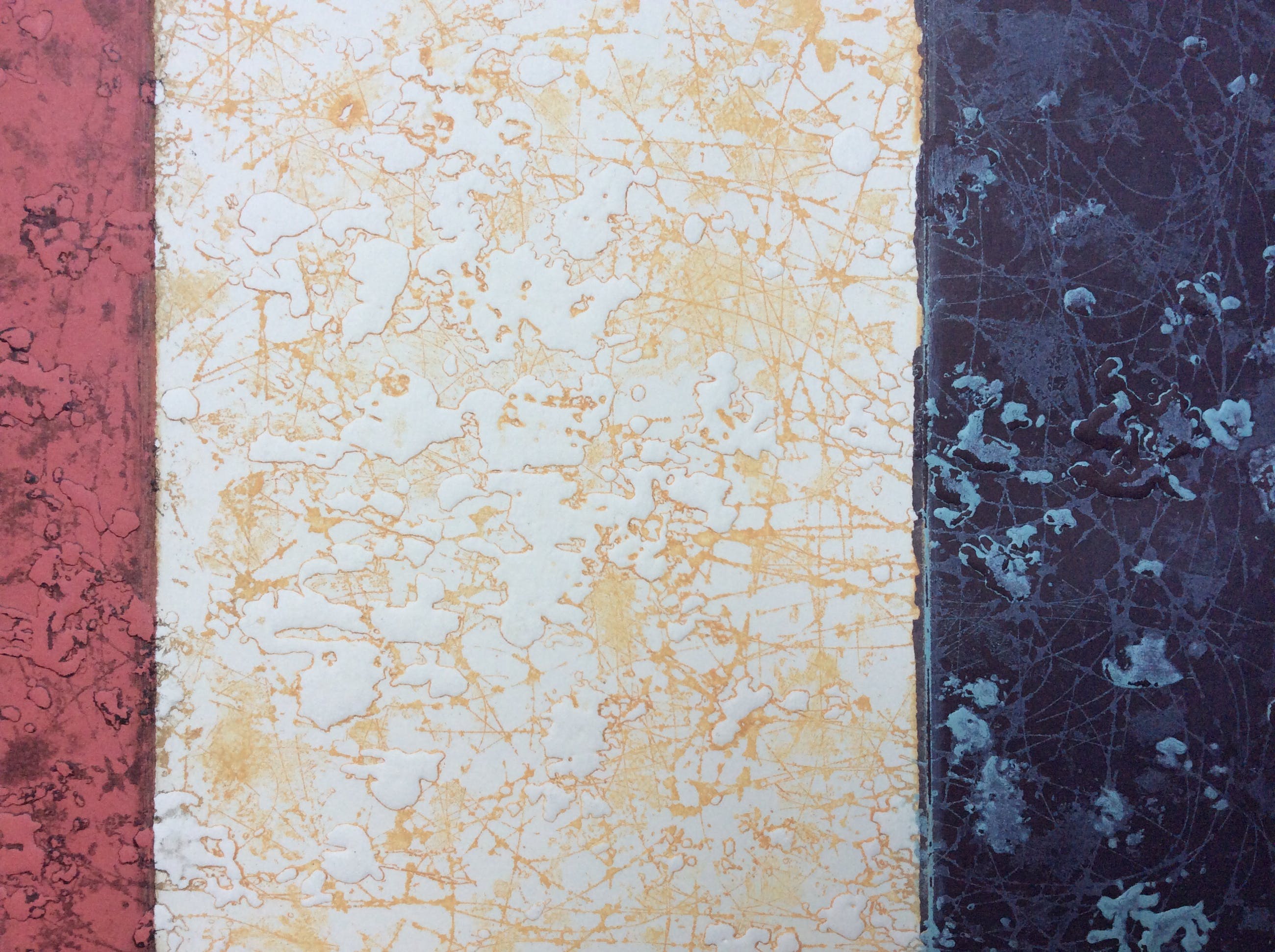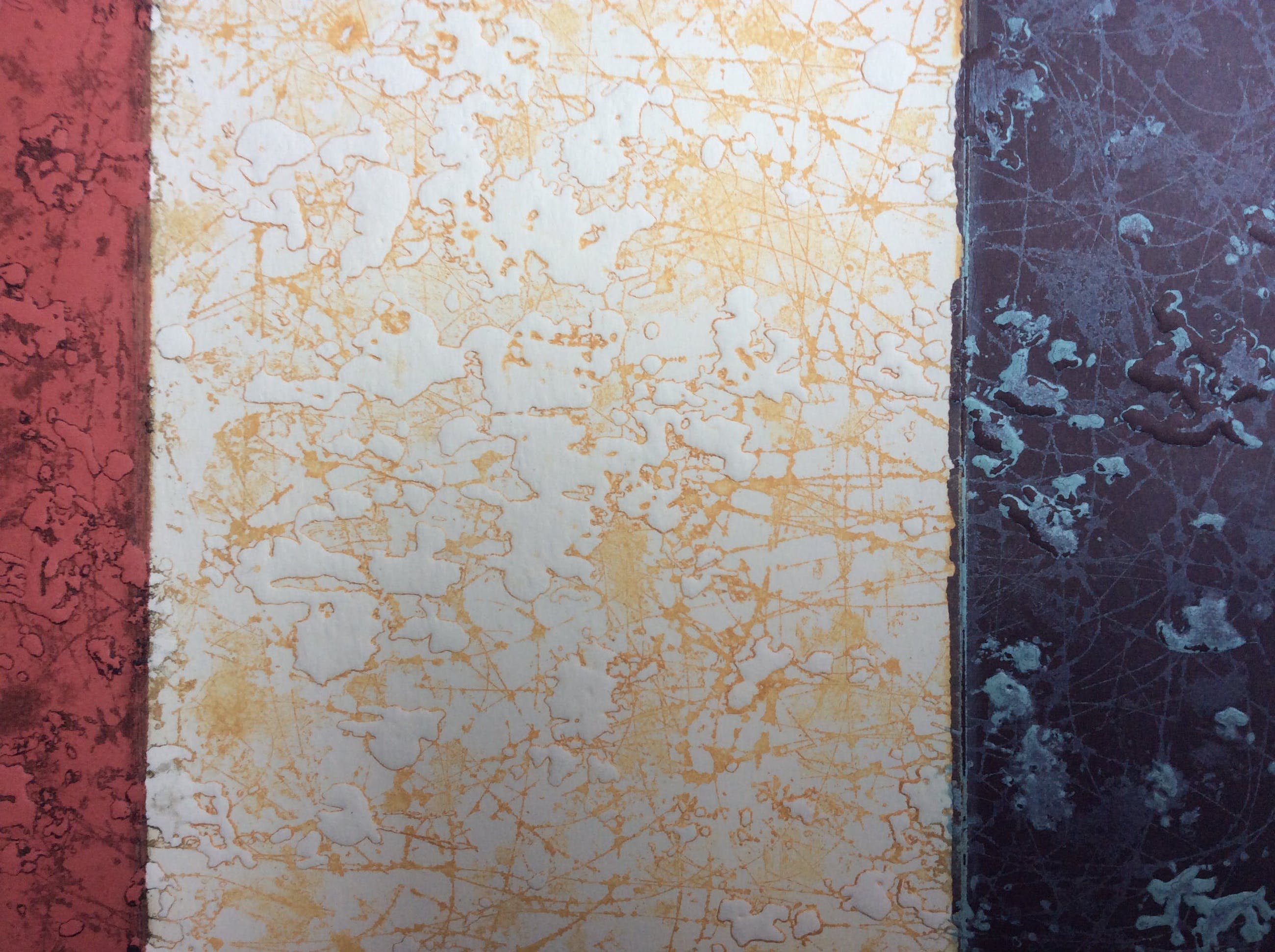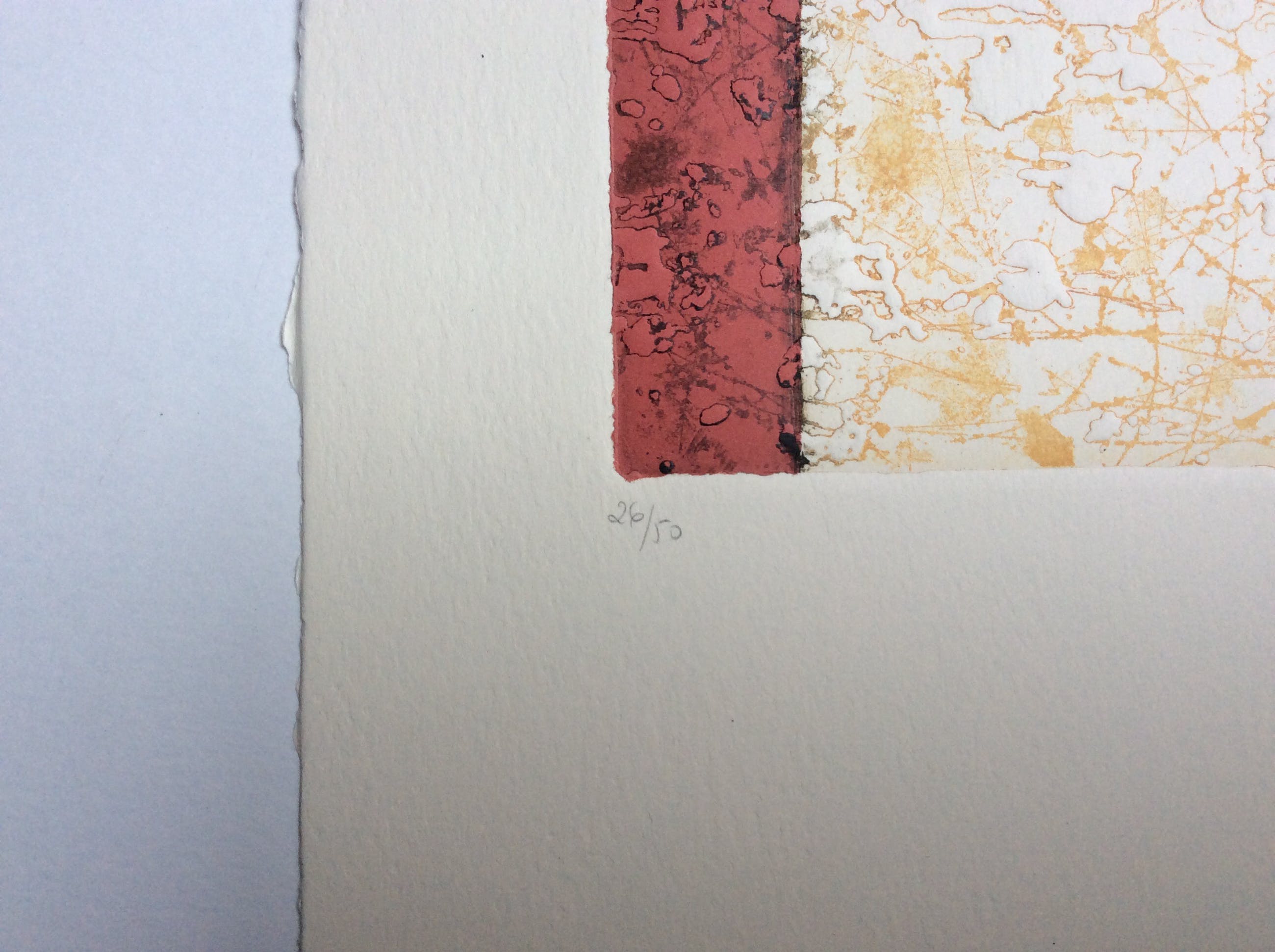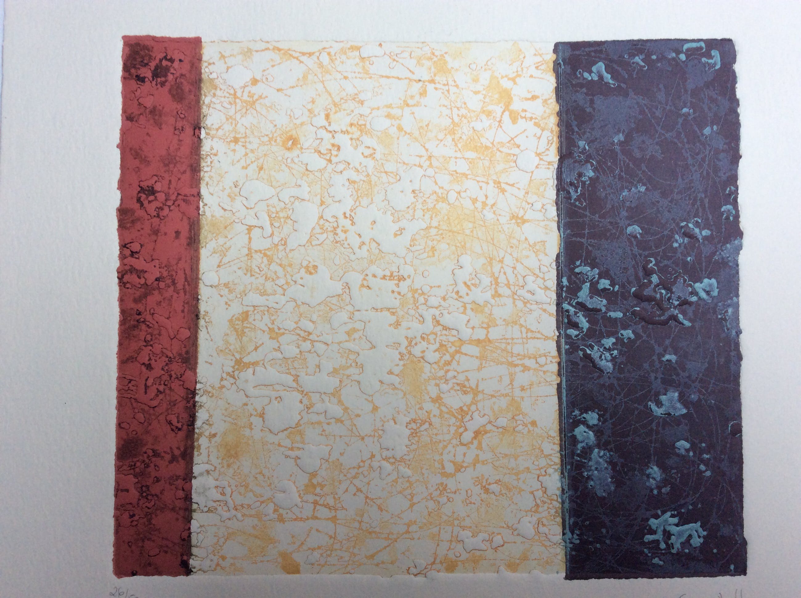 Intrigerende kleuren ets in 3 tonen, van onbekende kunstenaar, mogelijk van Spaanse afkomst. Titel: Parcelas. Formaat incl. 34 x 30 cm, grootte ets 18 x21 cm. Onderin potlood gesigneerd en genummerd, 26/50 Achterop apart voorzien van informatie plus gesigneerd.