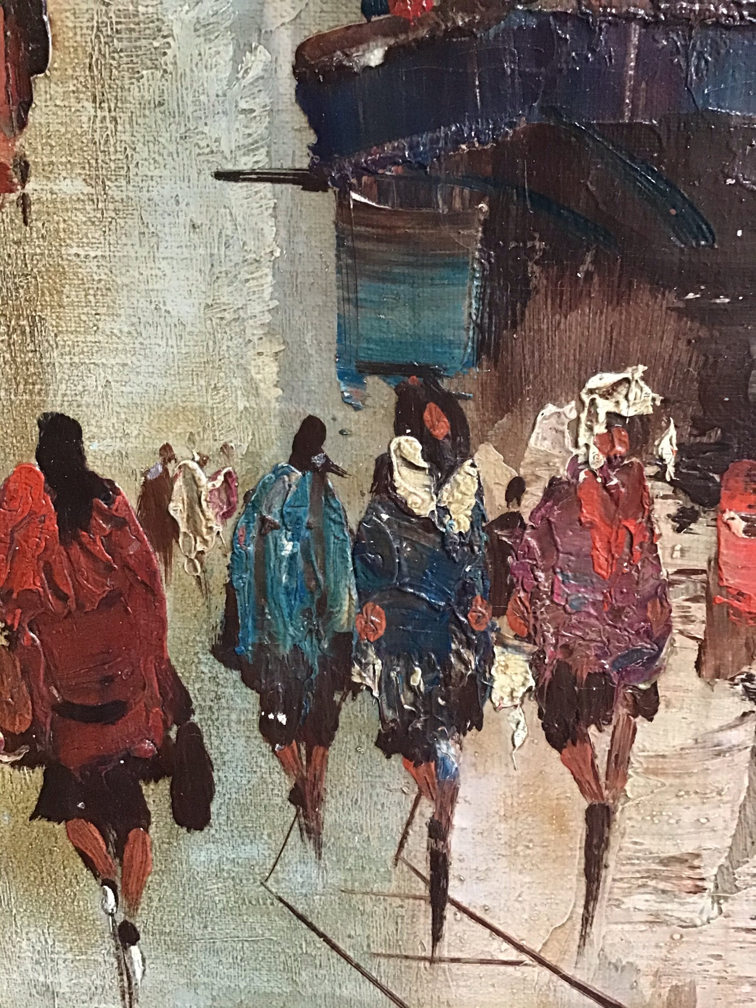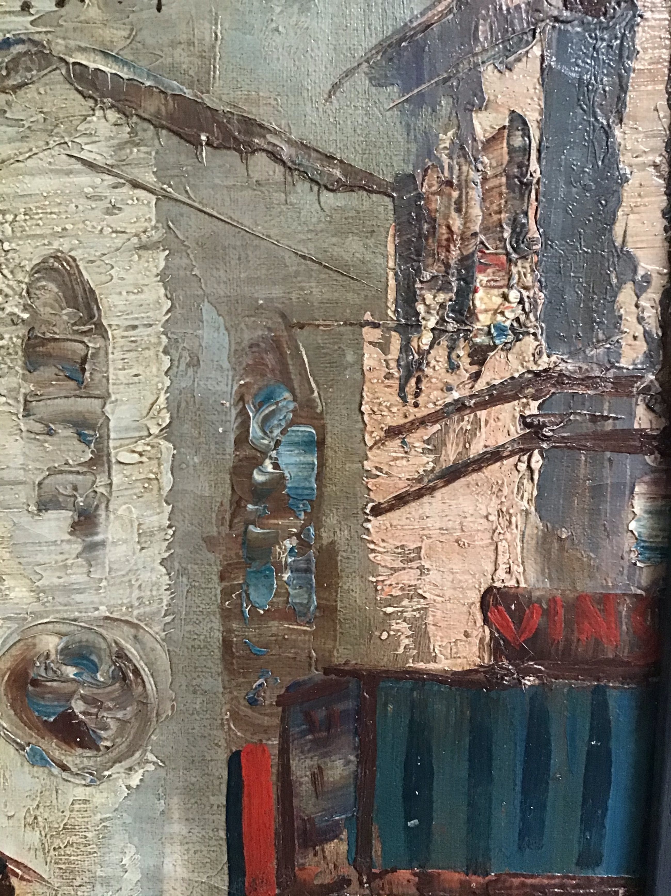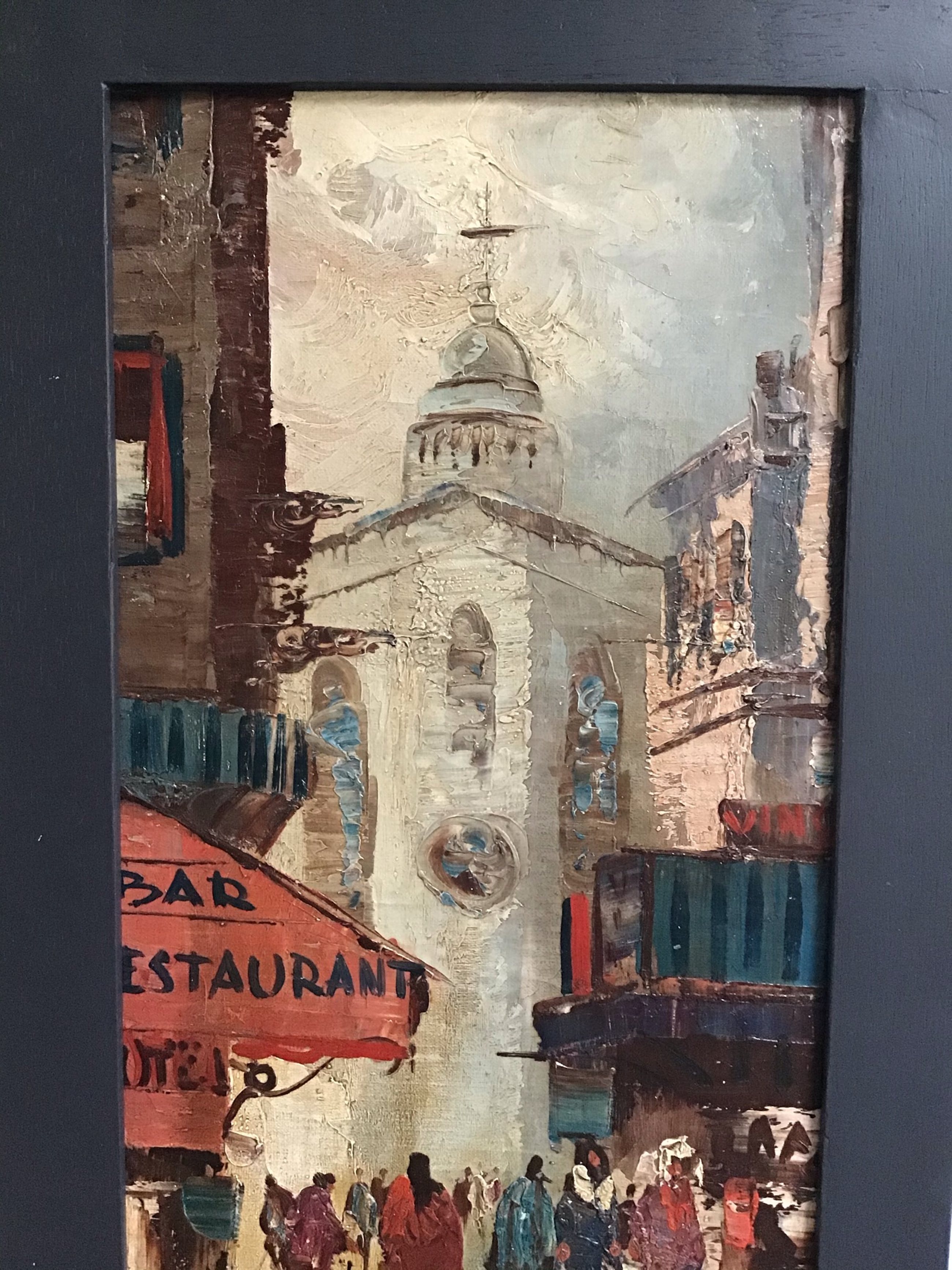 Deel van een werk verlijmd op een paneel. Impressionistisch beeld van flanerende dames in Parijs. Zit goed in de verf.