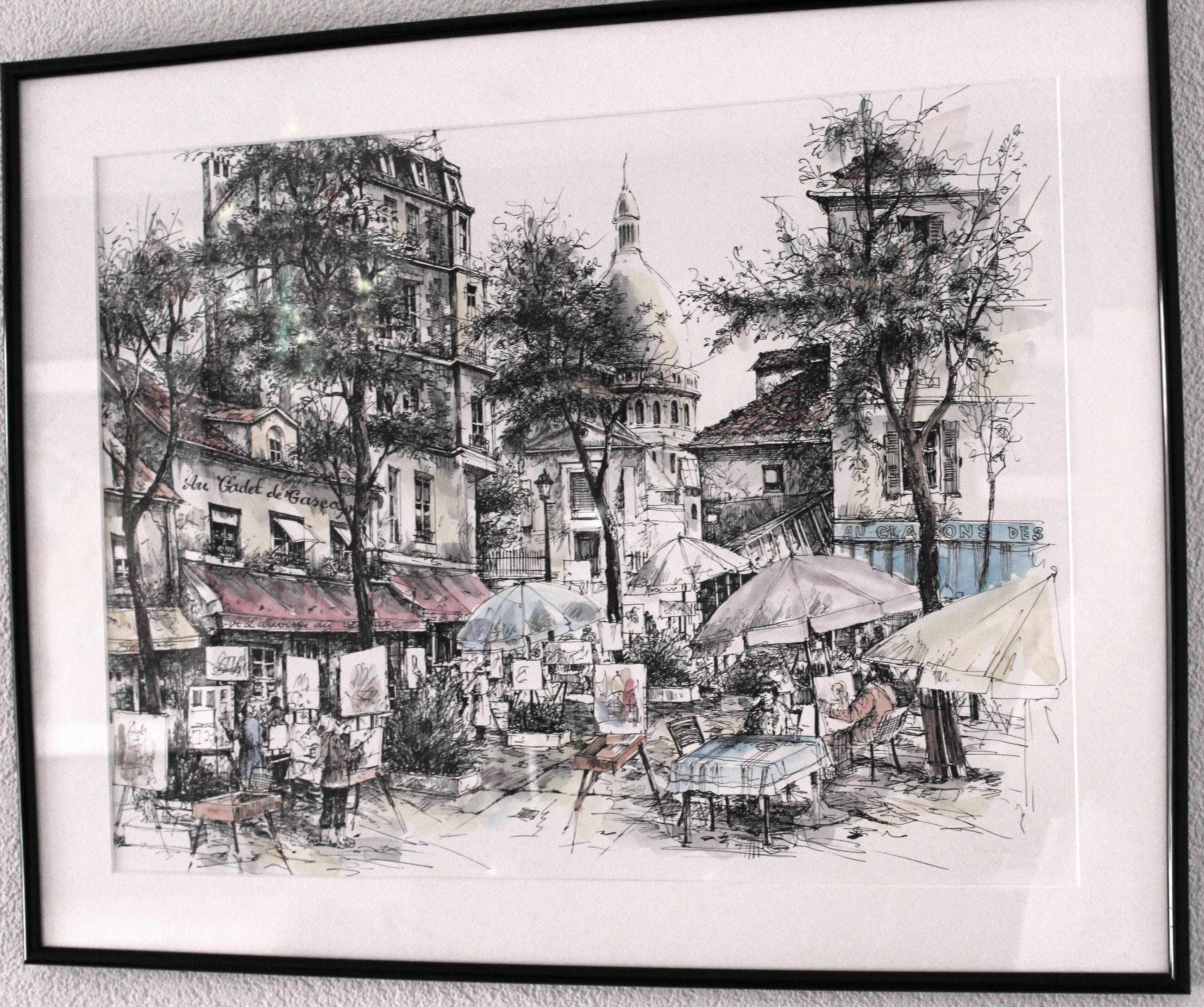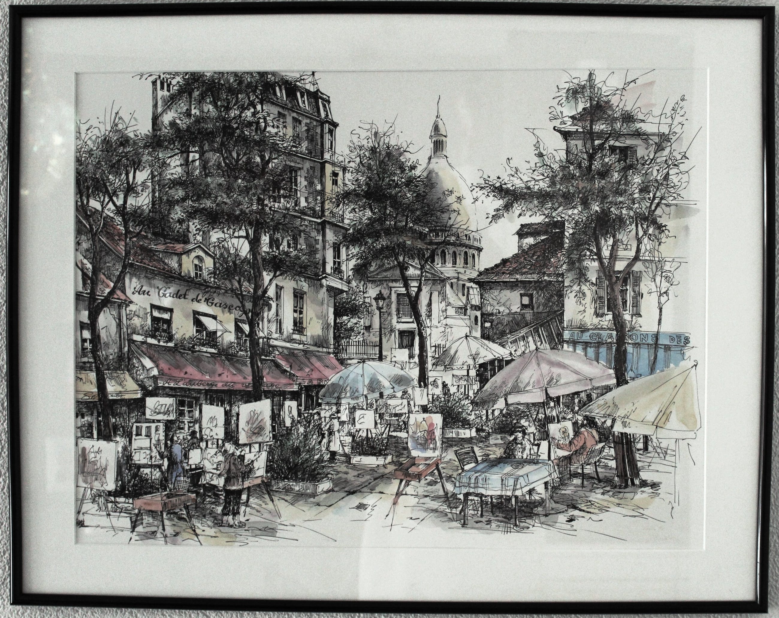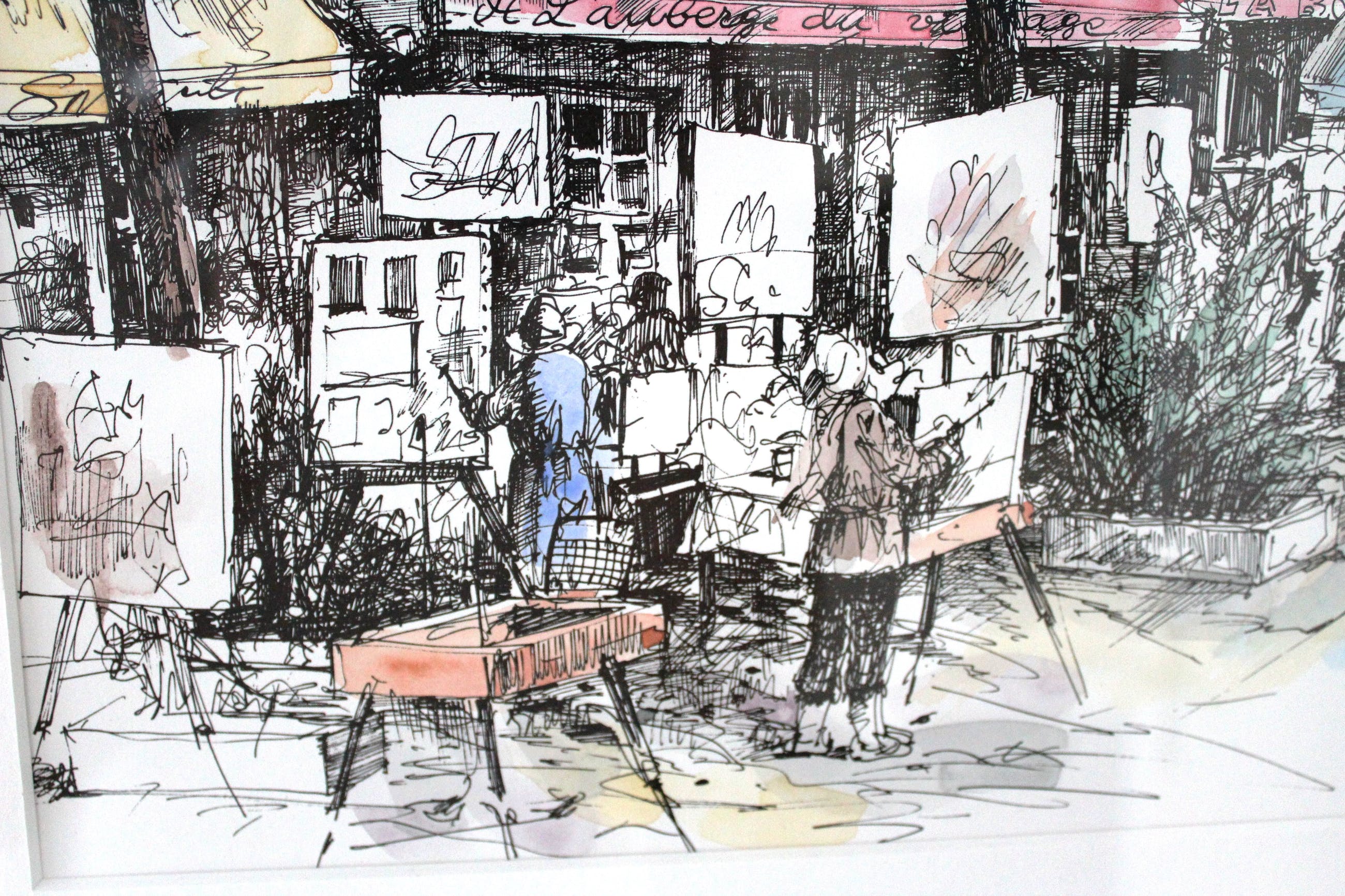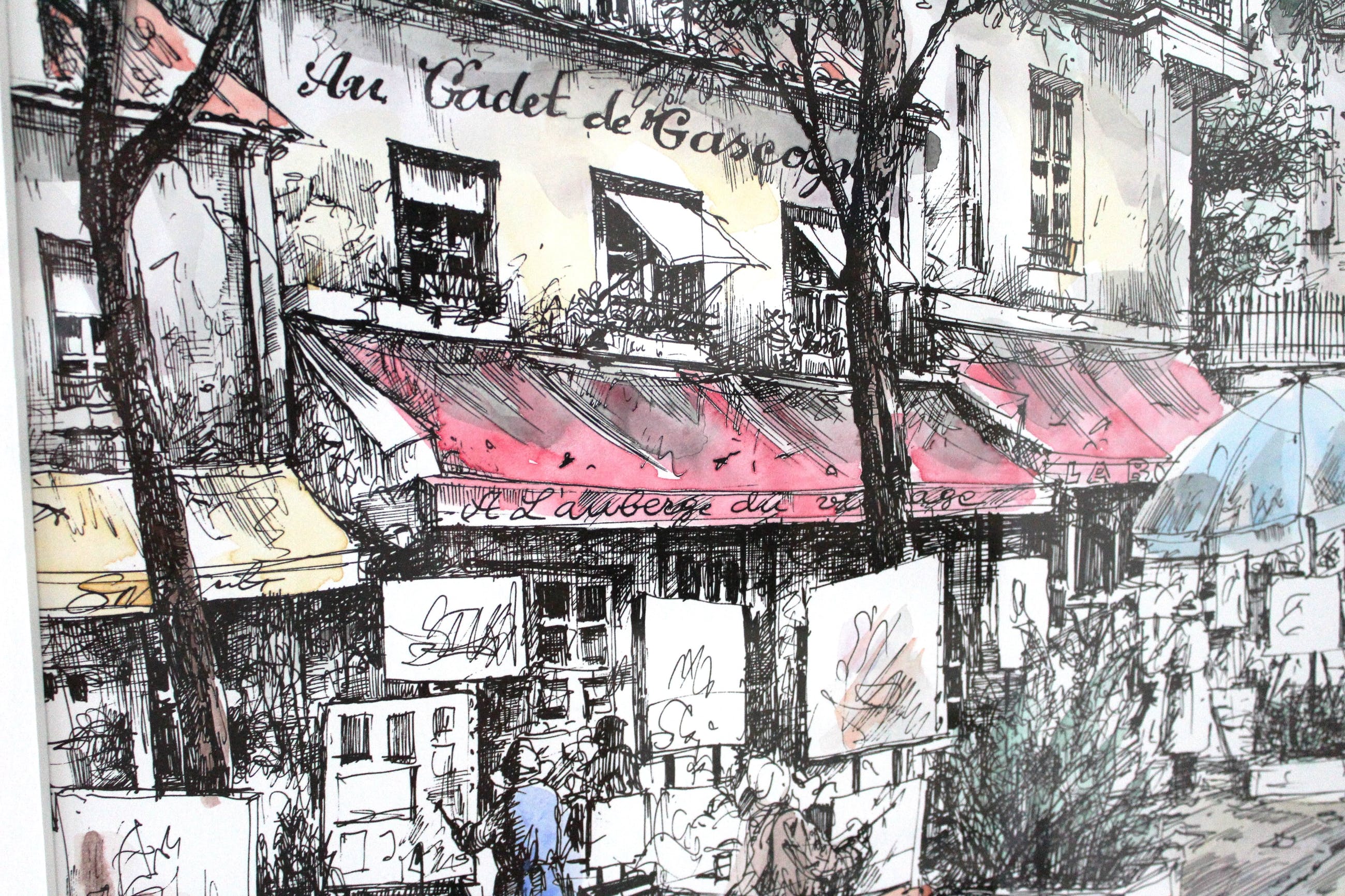 Ingelijste pentekening /aquarel met een voorstelling van het plein "Place du Tertre" in Parijs 1932 met op de achtergrond het beroemde Franse restaurant "Au Cadet de Gascogne".