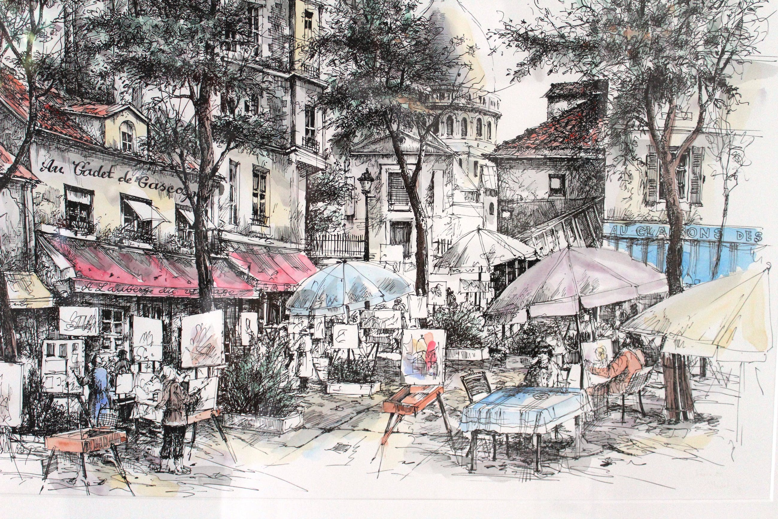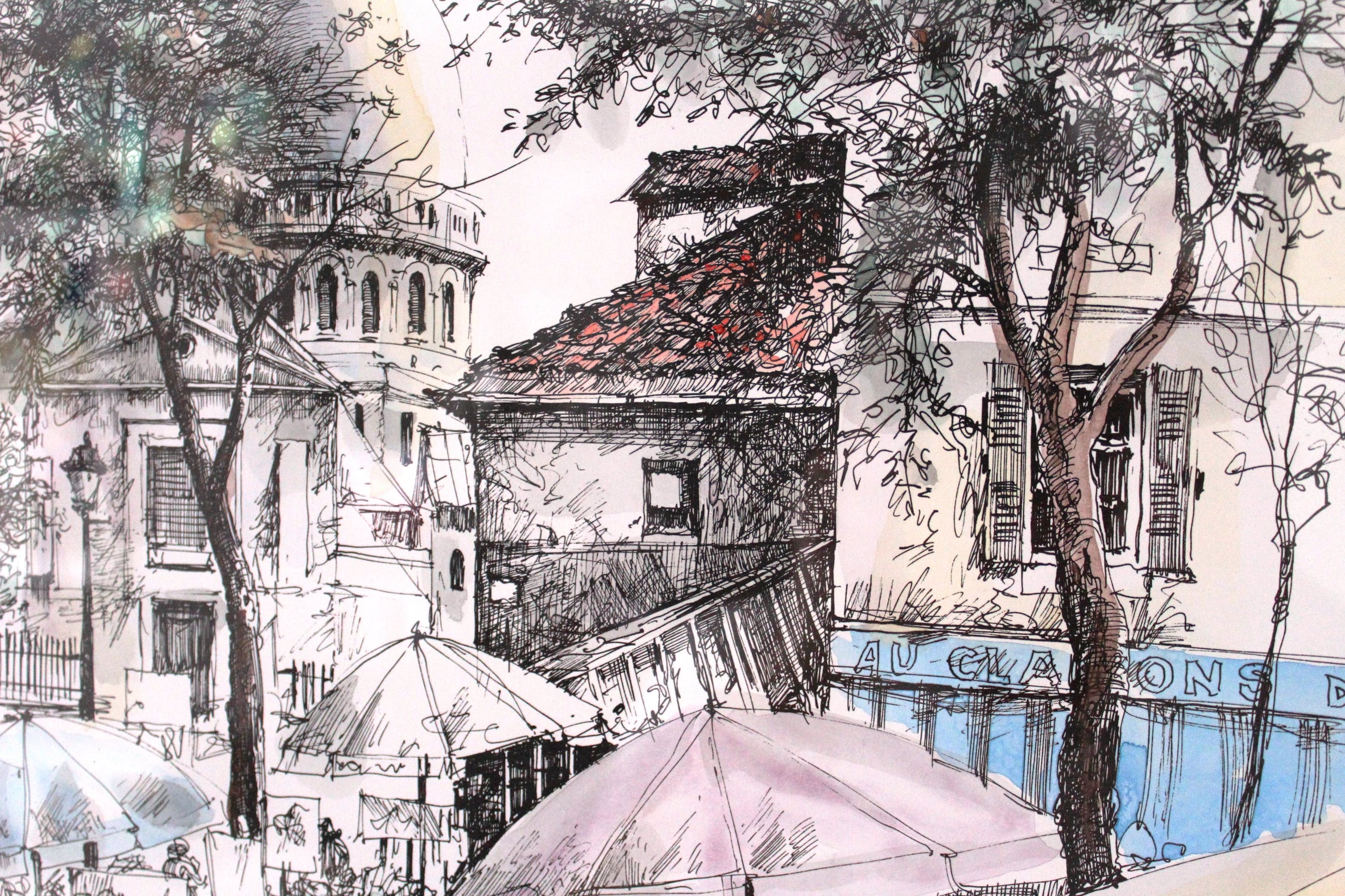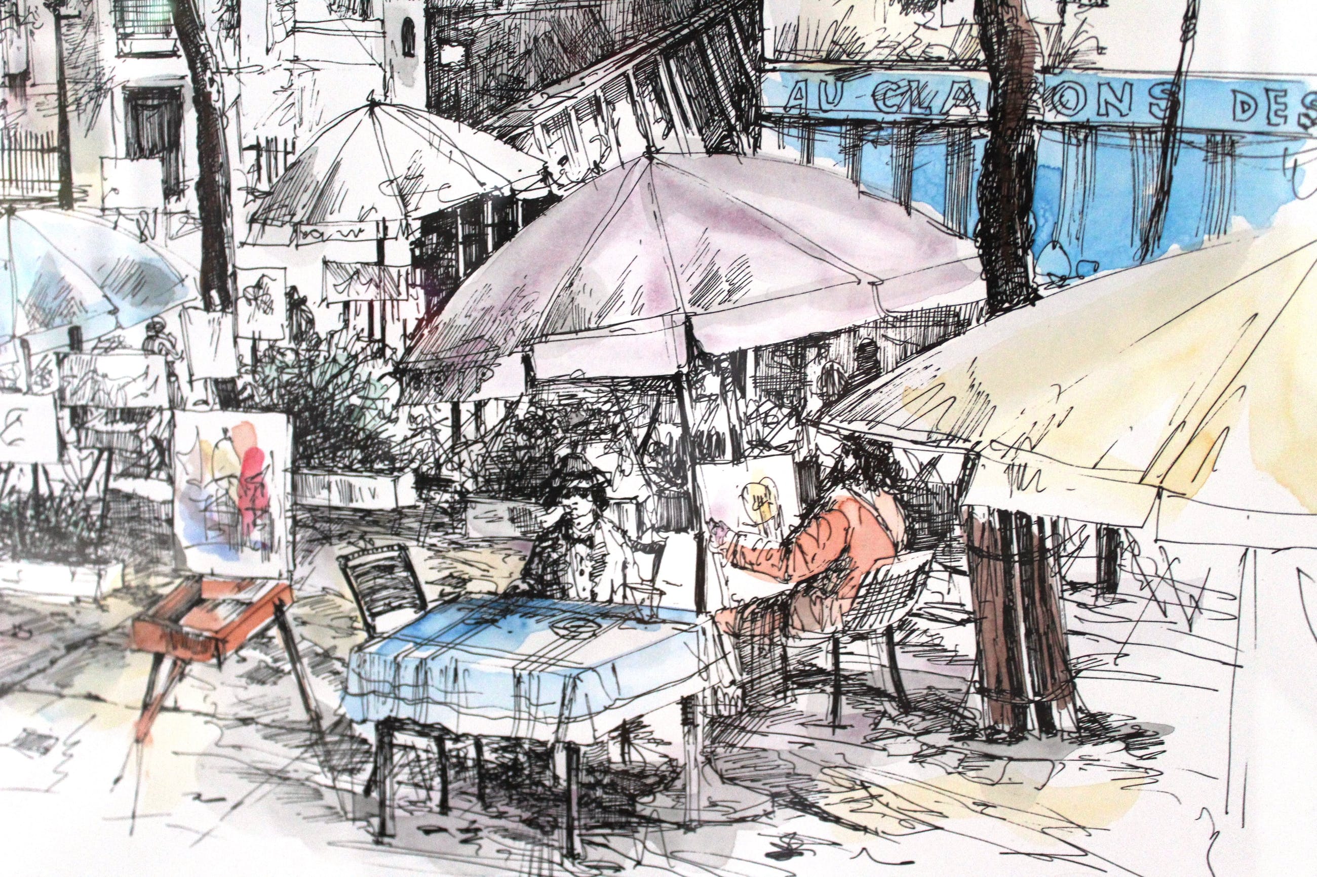 Ingelijste pentekening /aquarel met een voorstelling van het plein "Place du Tertre" in Parijs 1932 met op de achtergrond het beroemde Franse restaurant "Au Cadet de Gascogne".