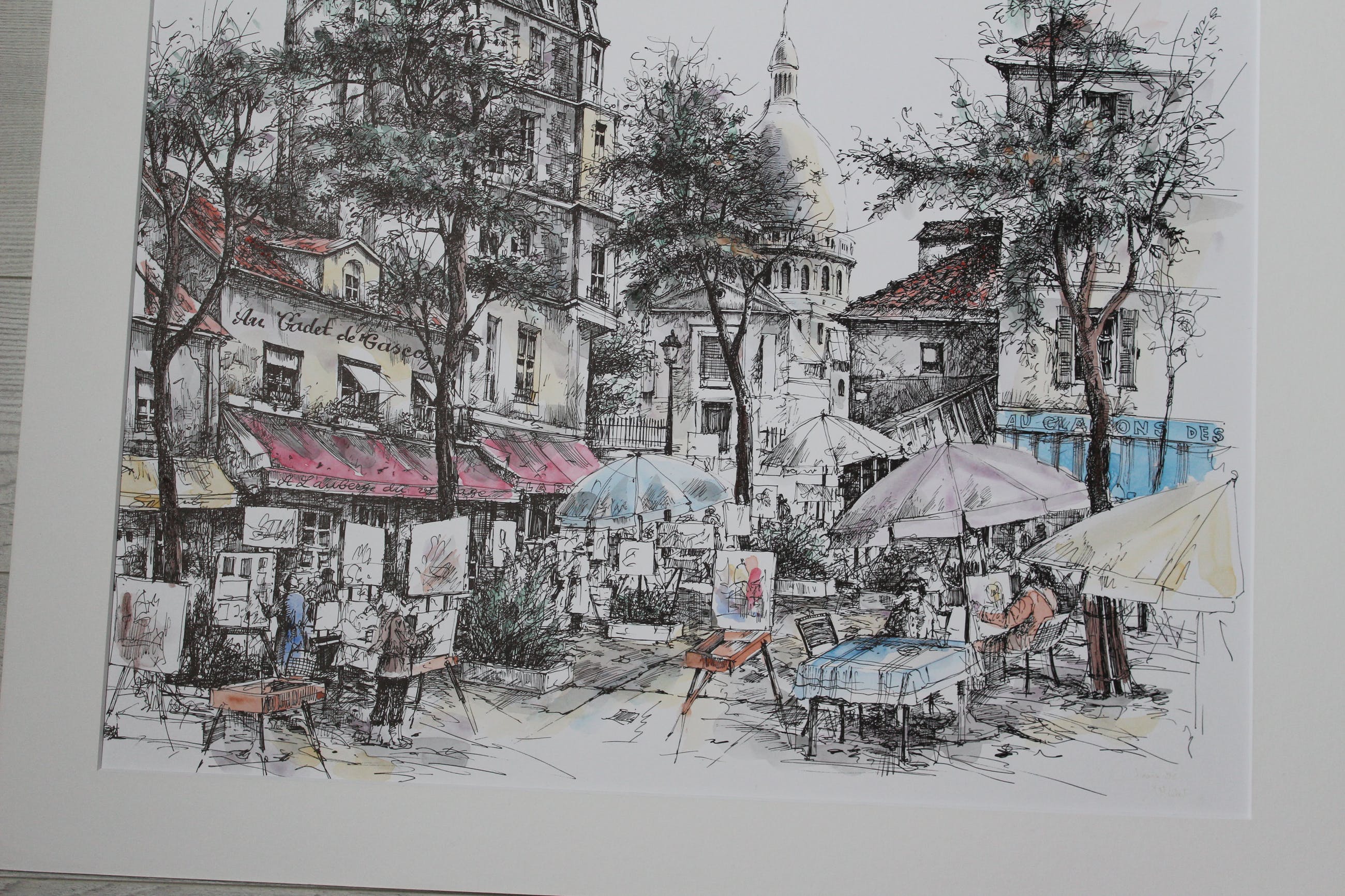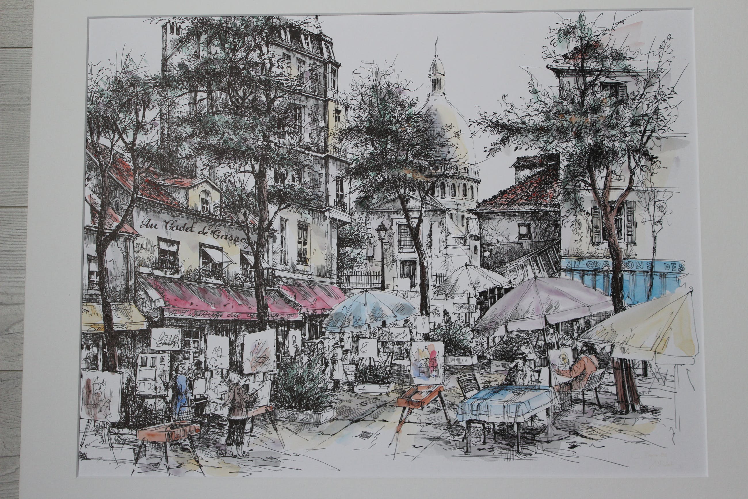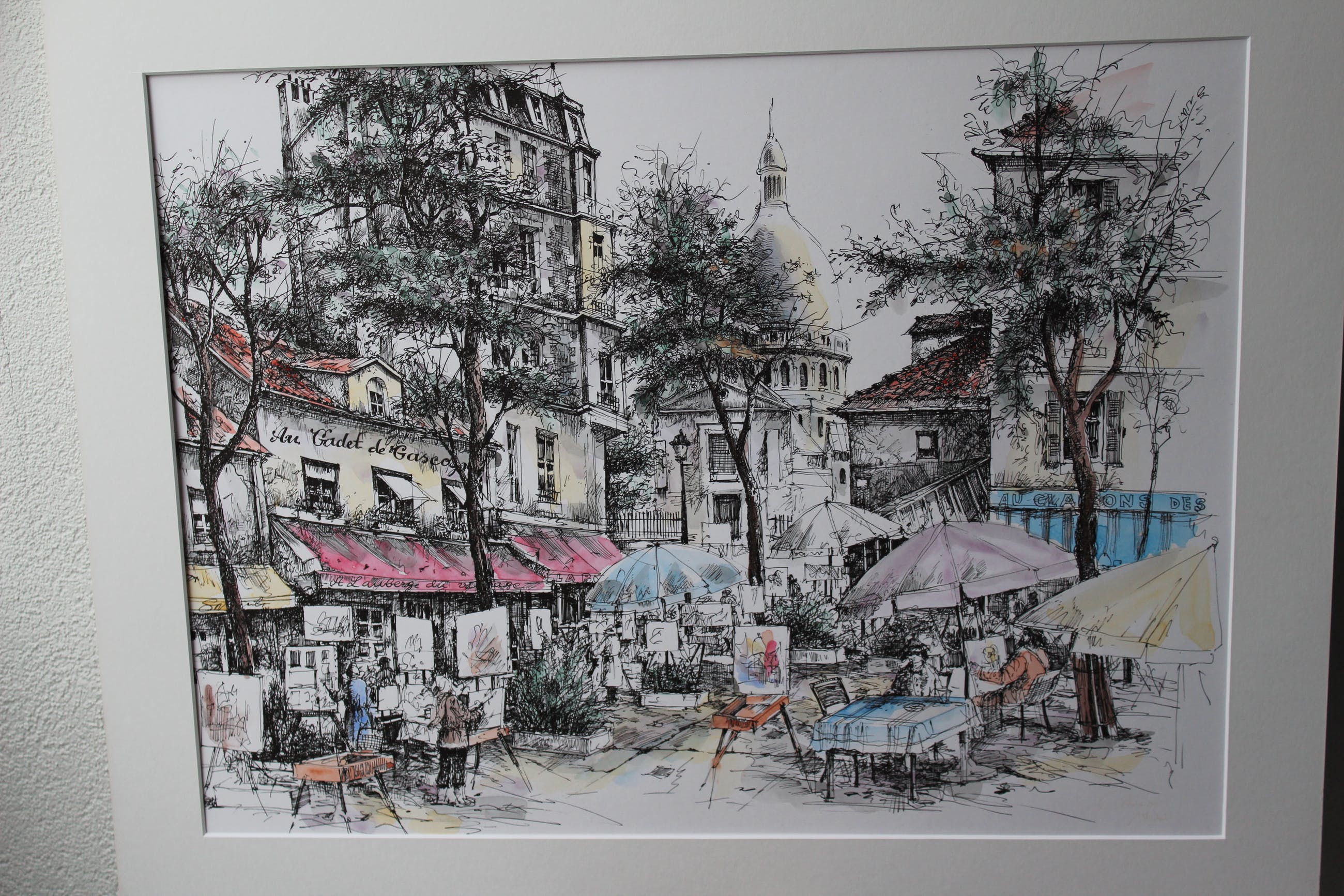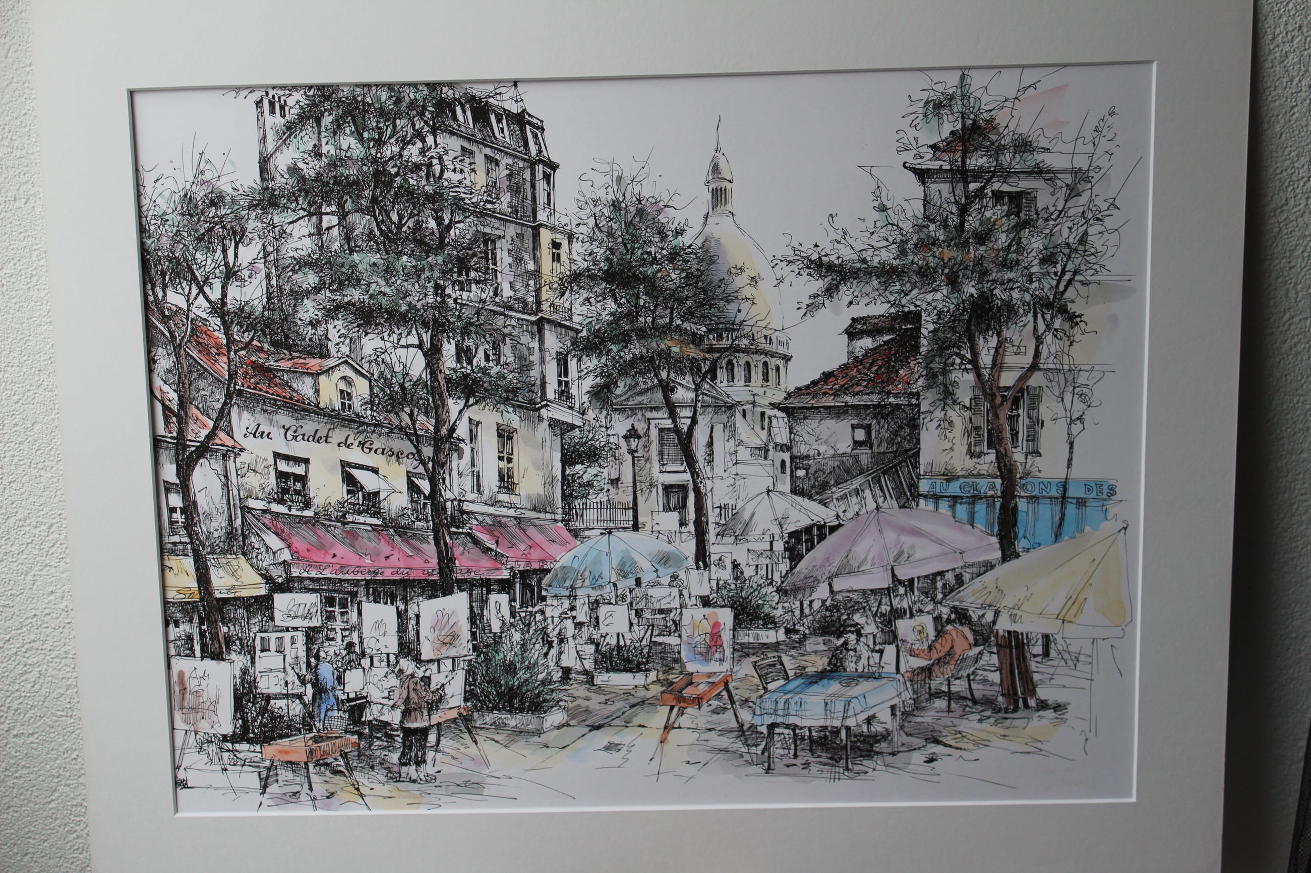 Ingelijste pentekening /aquarel met een voorstelling van het plein "Place du Tertre" in Parijs 1932 met op de achtergrond het beroemde Franse restaurant "Au Cadet de Gascogne".