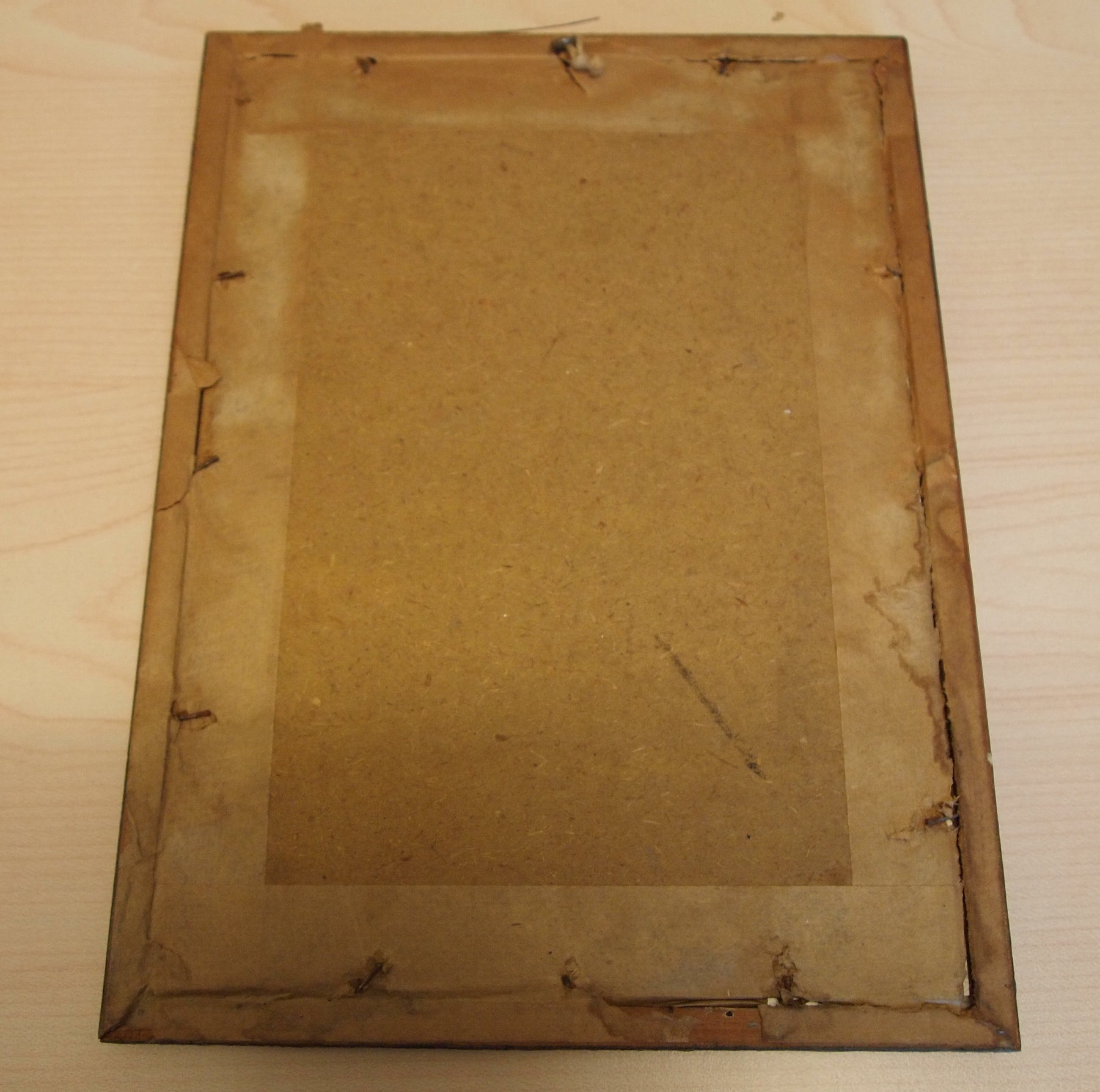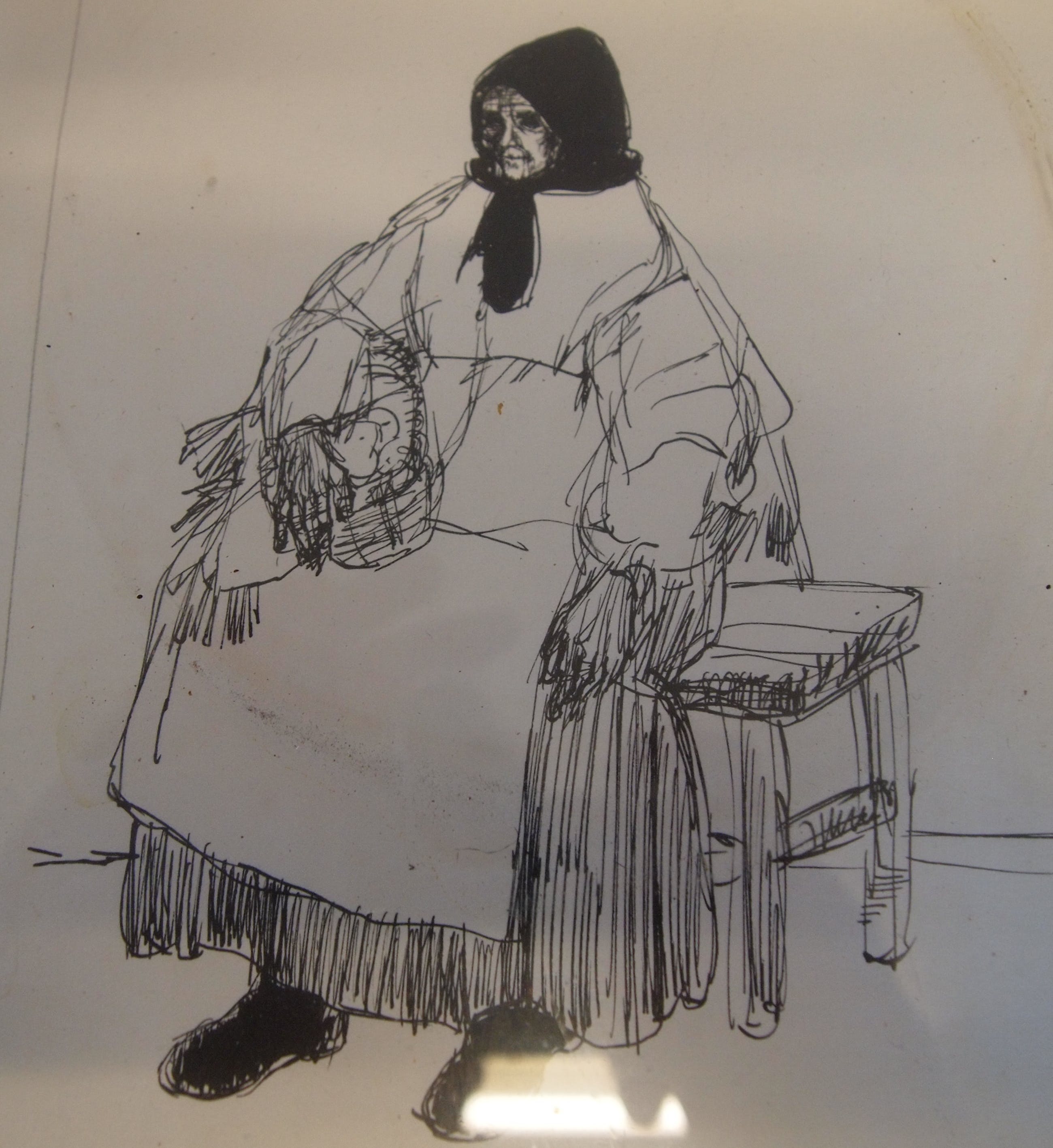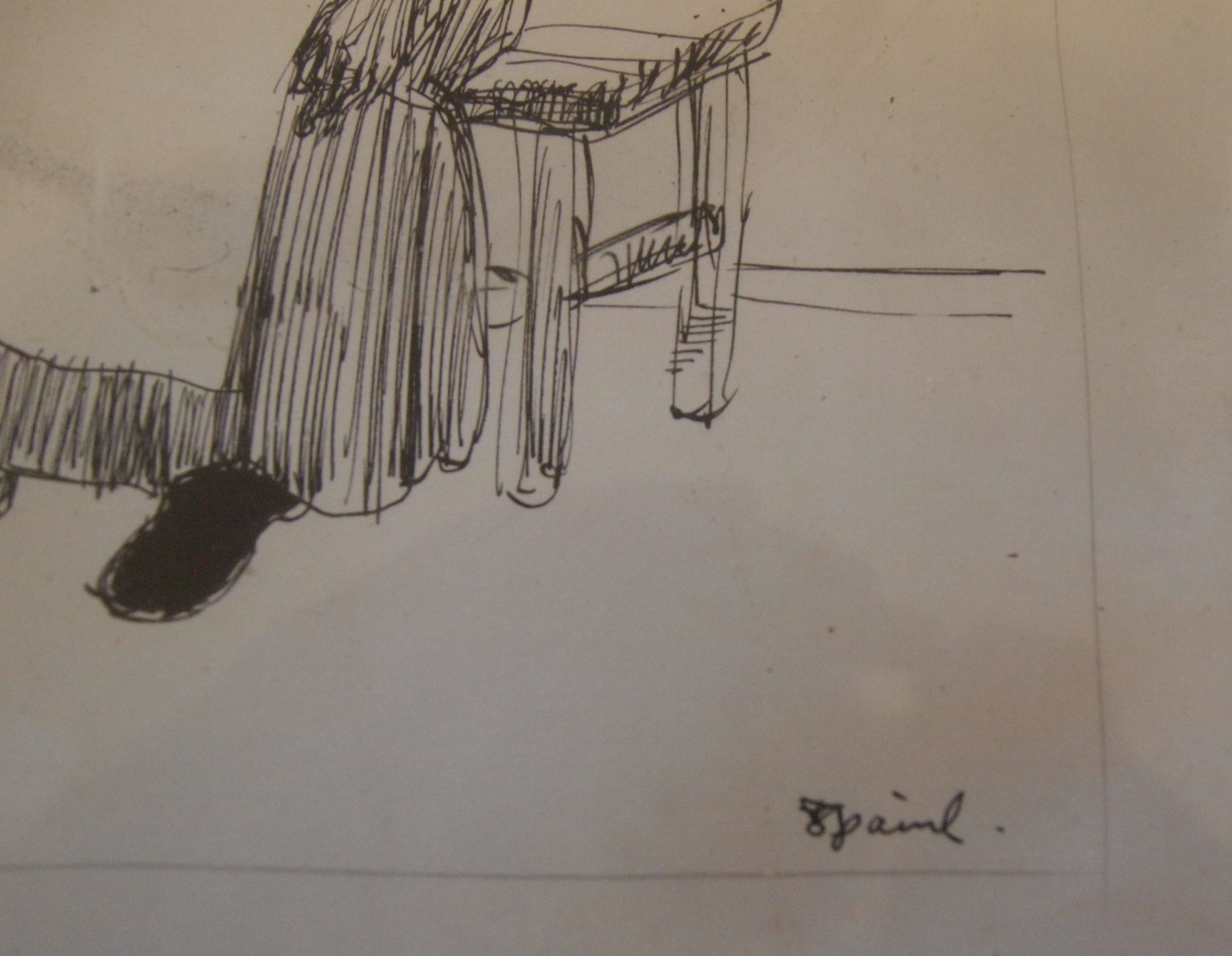 Pentekening van een Boerin zittend op een kruk. De passe partout en het werk hebben wat watervlekjes. Rechtsonder gesigneerd. Kunstenaar onbekend.