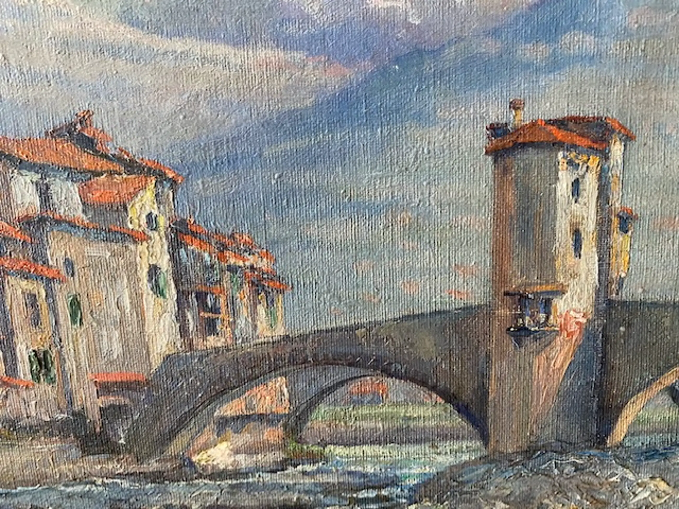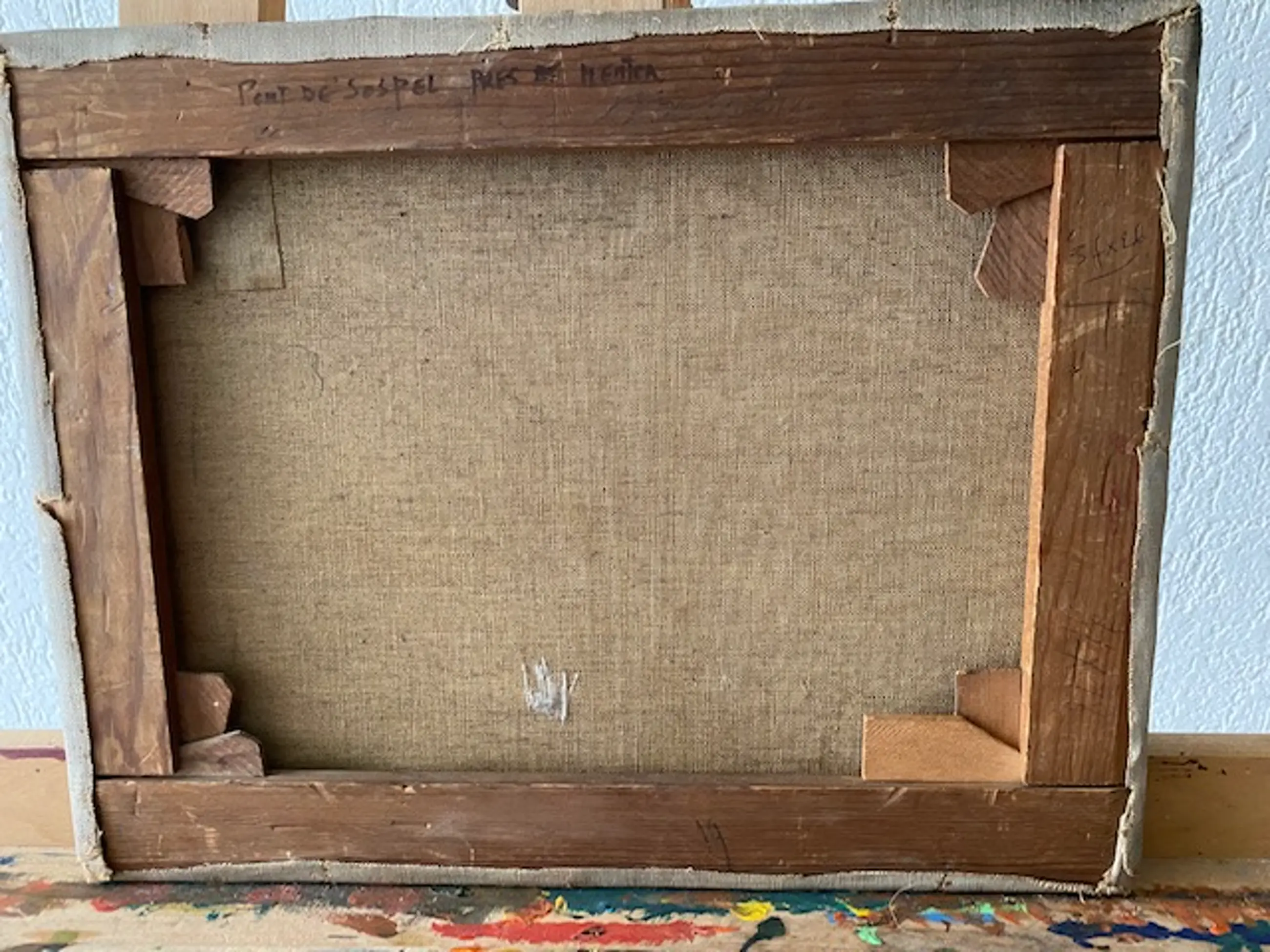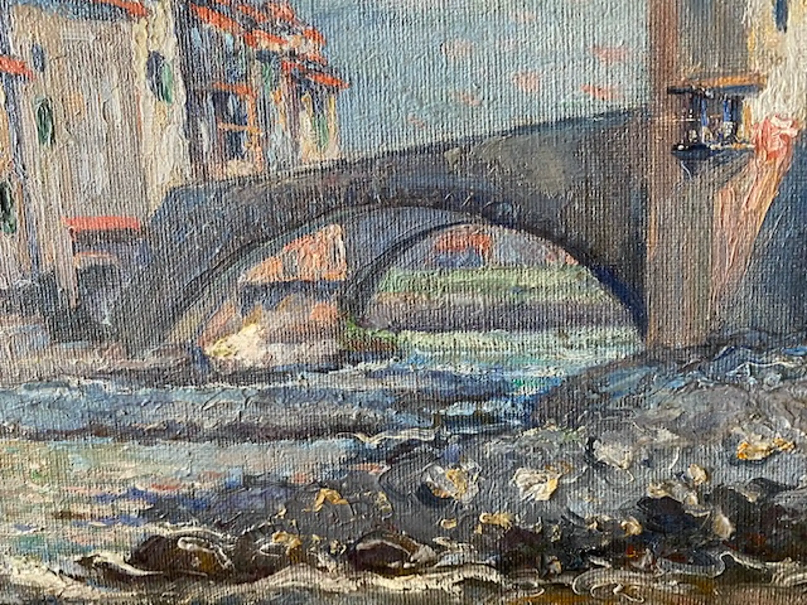 Op doek geschilderde impressie van de brug over de Bévéra. Sospel is een gemeente in het Franse departement Alpes-Maritimes (regio Provence-Alpes-Côte d'Azur) en de plaats maakt deel uit van het arrondissement Nice. Opgezet in fraaie pasteltinten