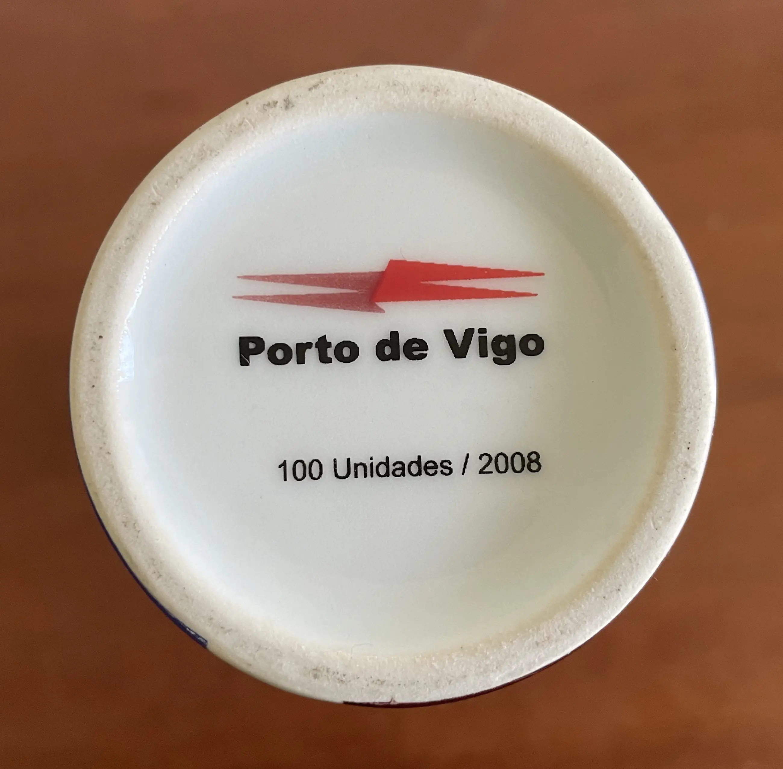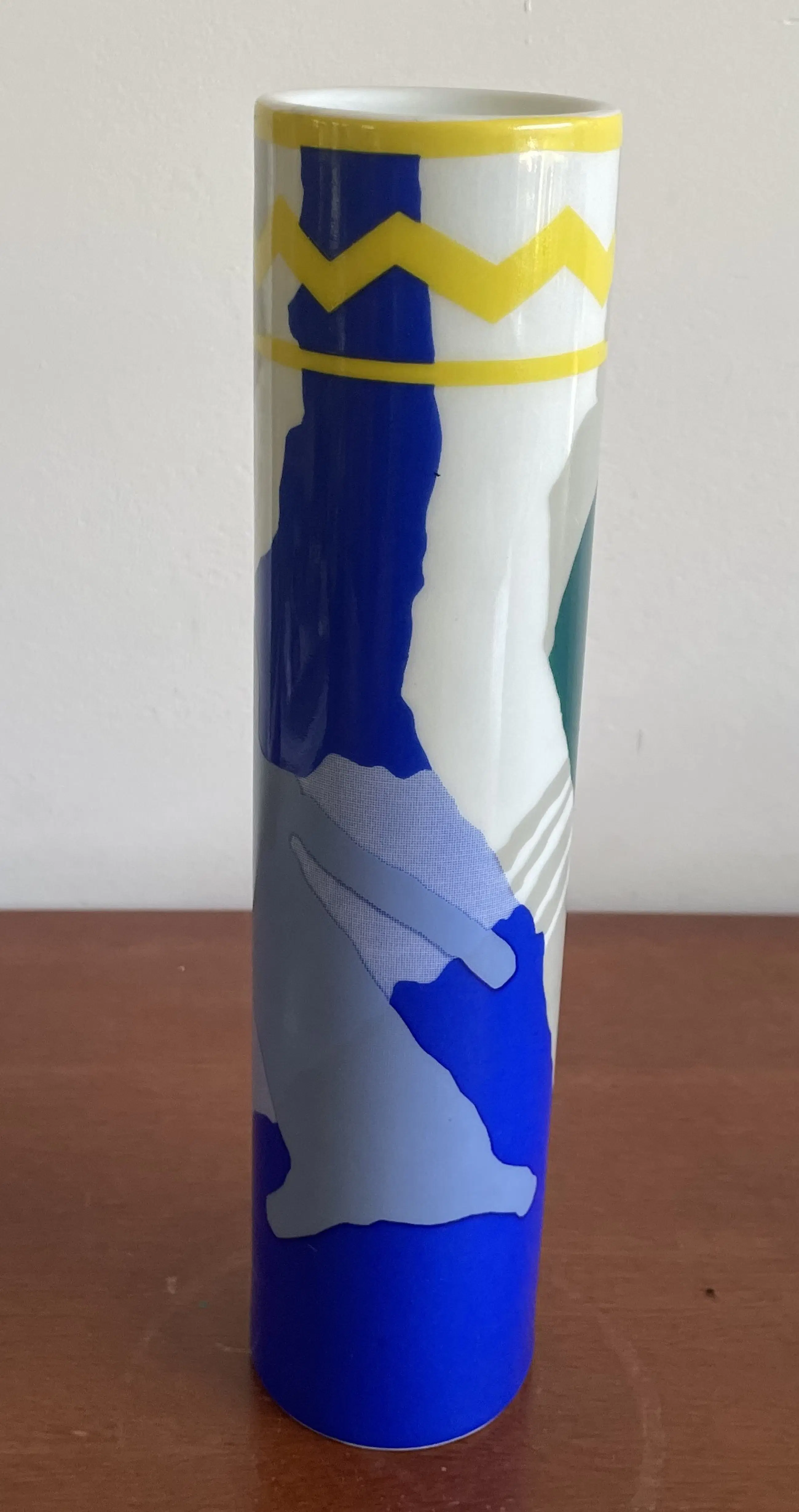 Design porseleinen cilinder met kleurrijk abstract decor uitgevoerd ter ere van het 100 jarig van de haven van Vigo in Spanje in 2008. Op de vaas gesigneerd, maar ontwerper of kunstenaar onbekend. In zeer goede conditie.