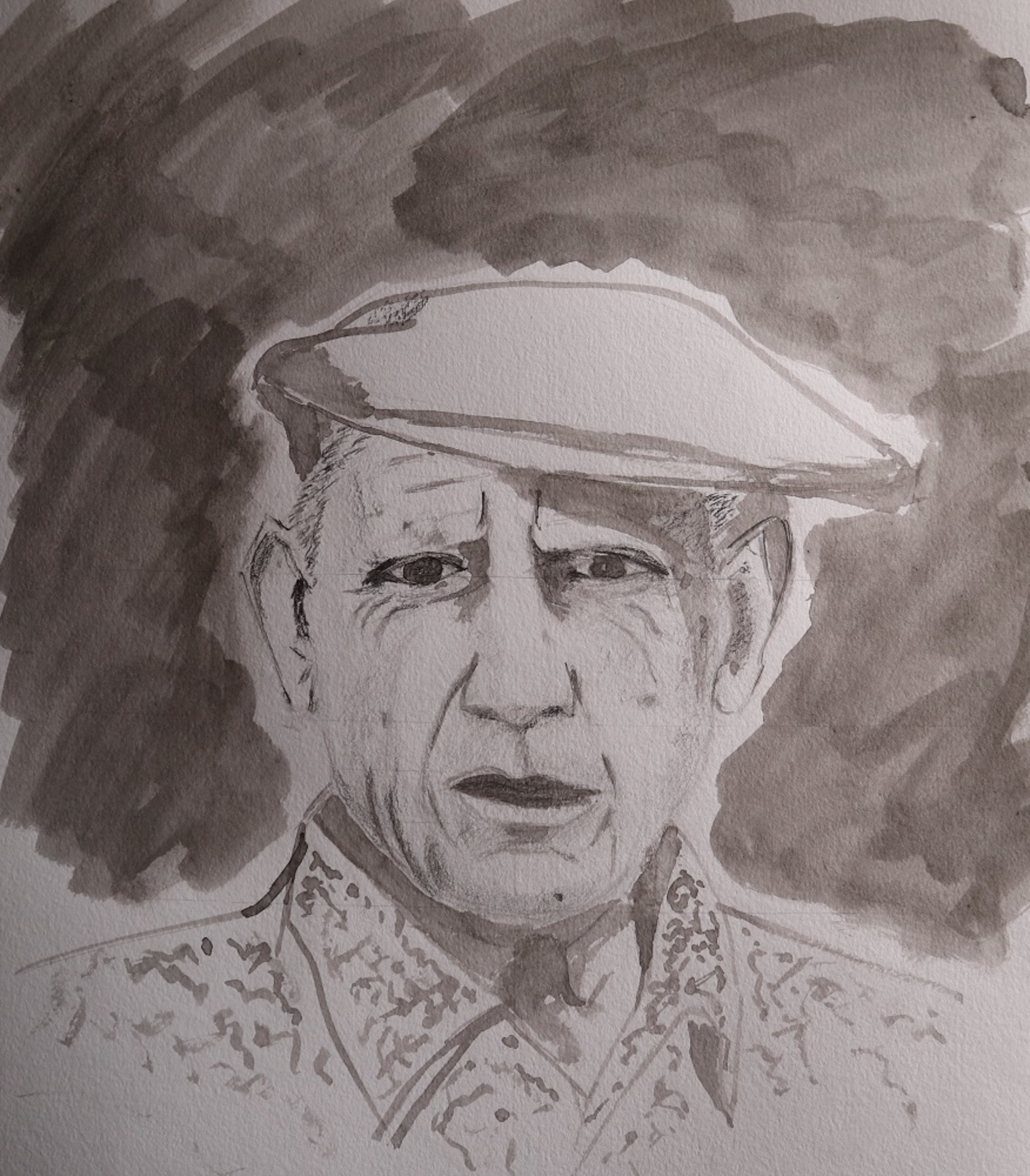 Mooi portret van Picasso op latere leeftijd. Gemengde techniek.