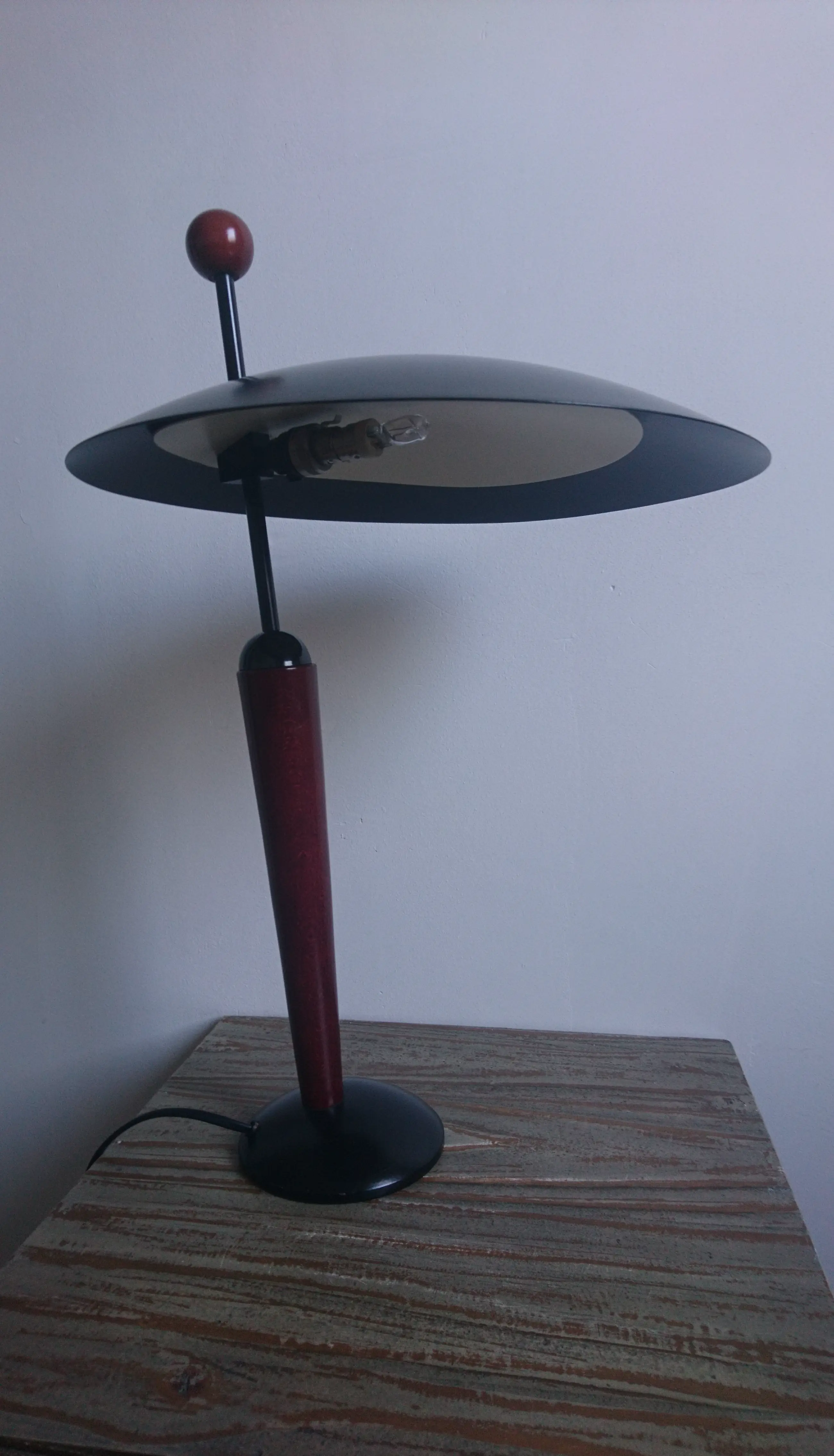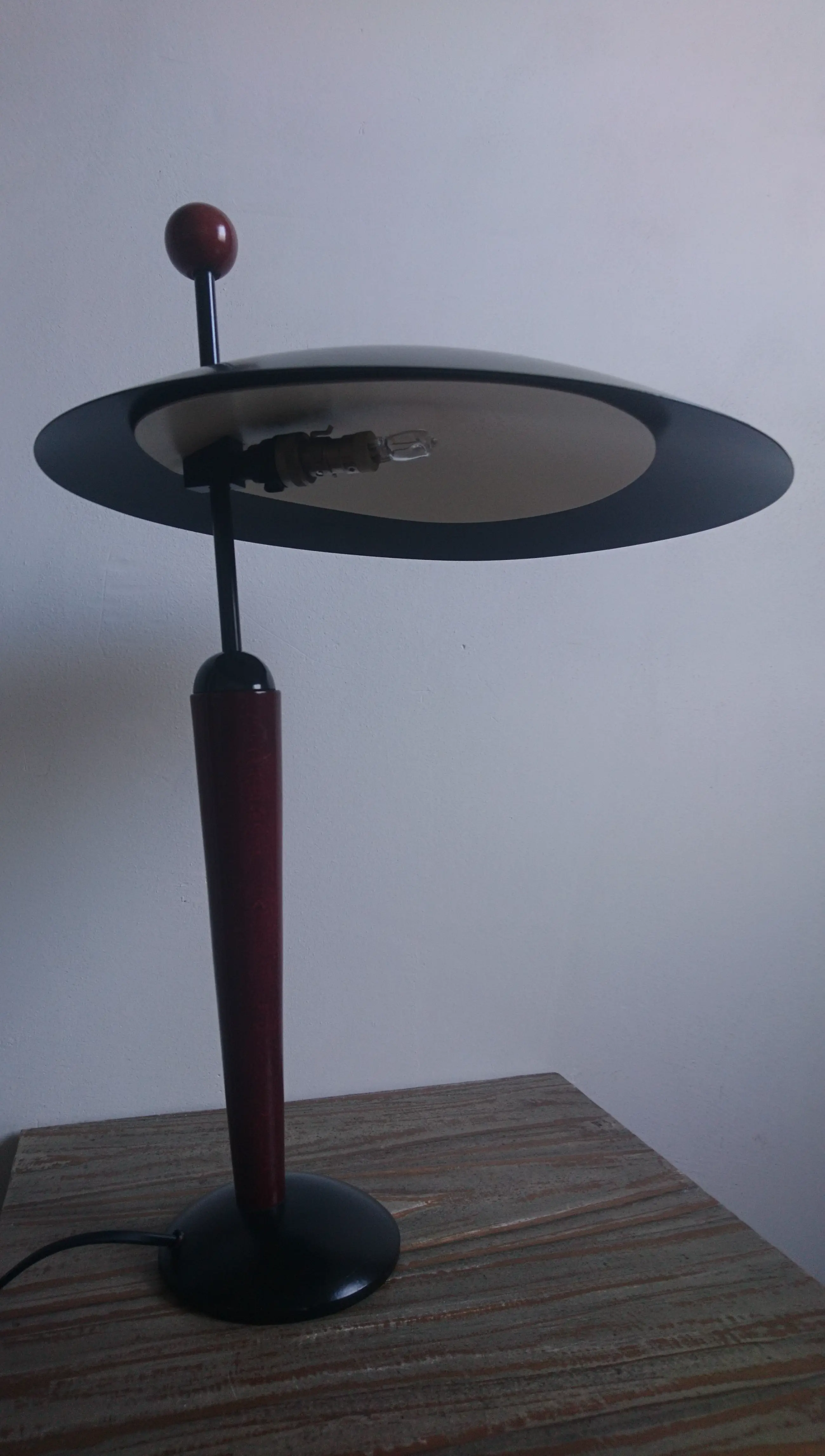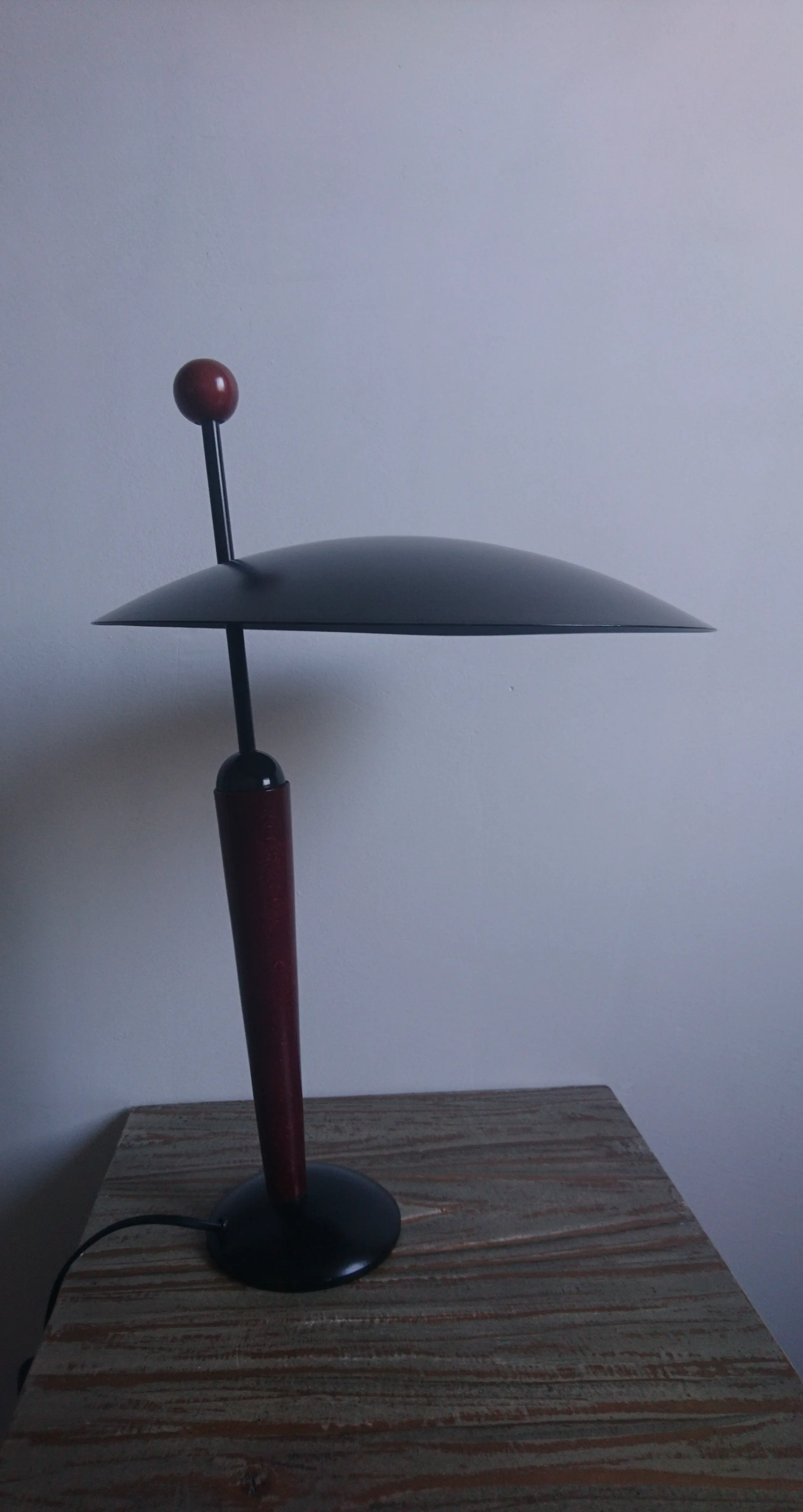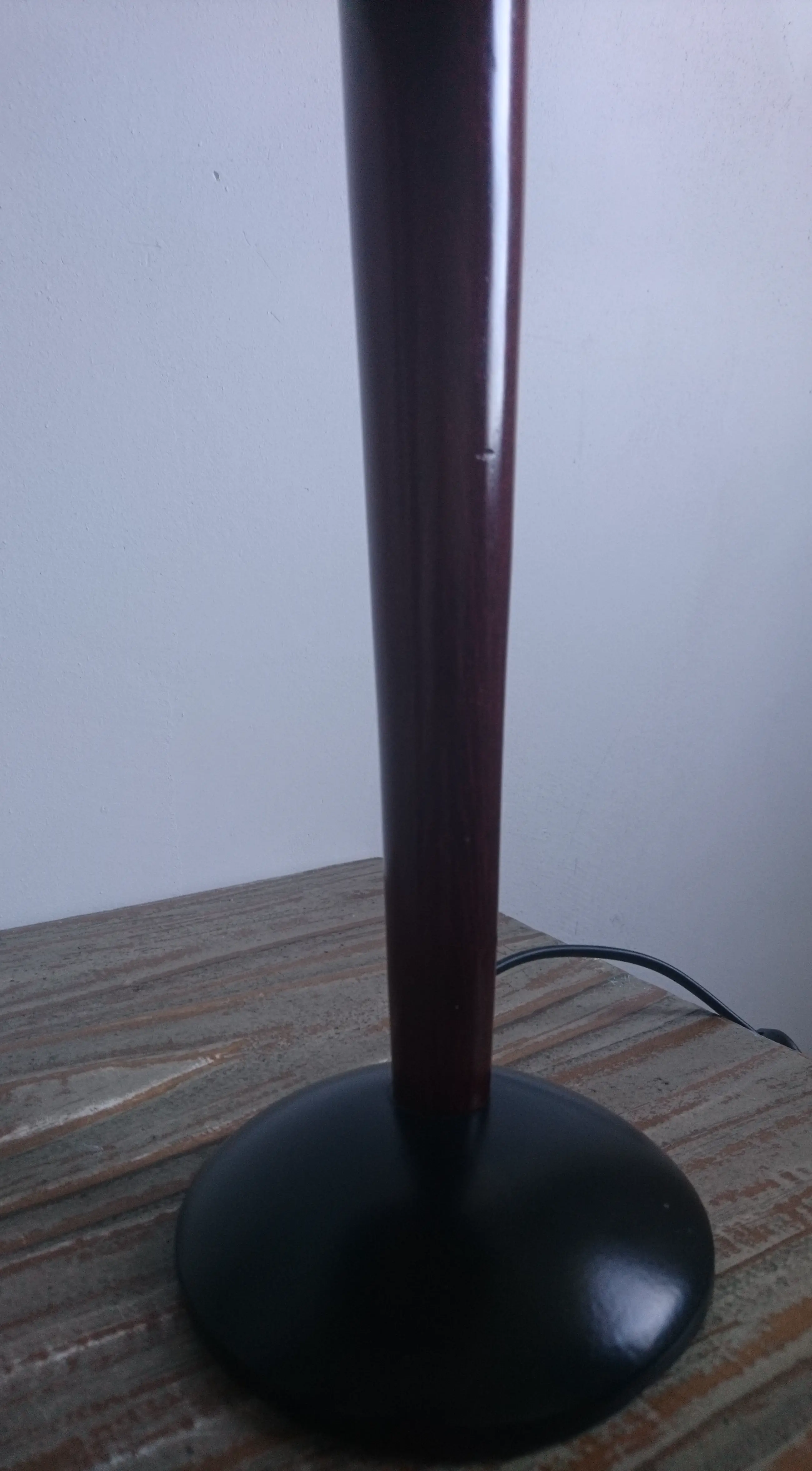 Postmodernistische tafellamp uit de jaren ´80 van goede kwaliteit. Gezien de leeftijd in goede staat. Boven op de kap twee grijze touché strepen en op het houten gedeelte een klein deukje. Verder in de buurt van het lampje de gebruikelijke (minimale) hitteplek. Zie daarvoor de foto's. Het snoer is vanaf de voet tot stekker vervangen (lees: veiliger). Afmetingen: 50 x 32 x 32 cm.